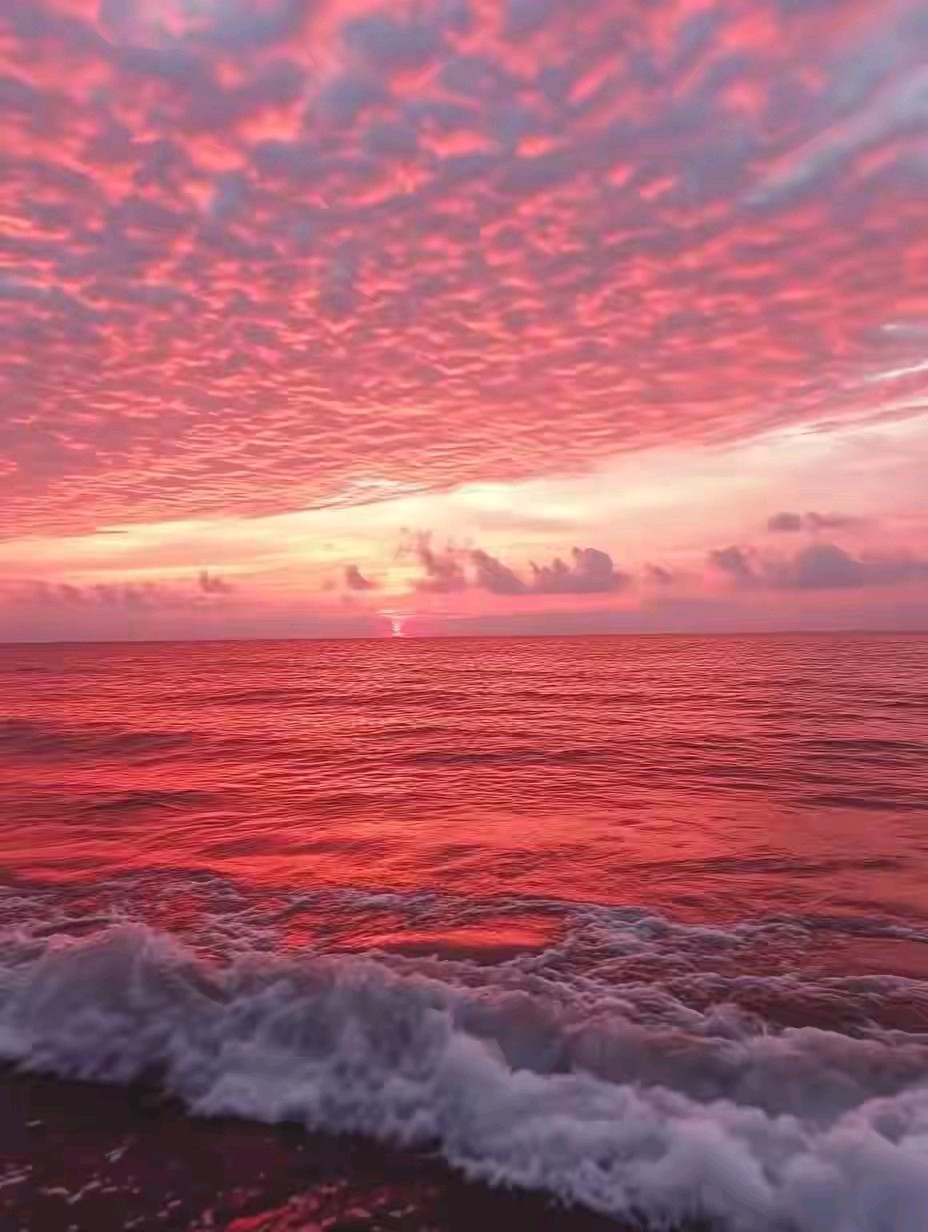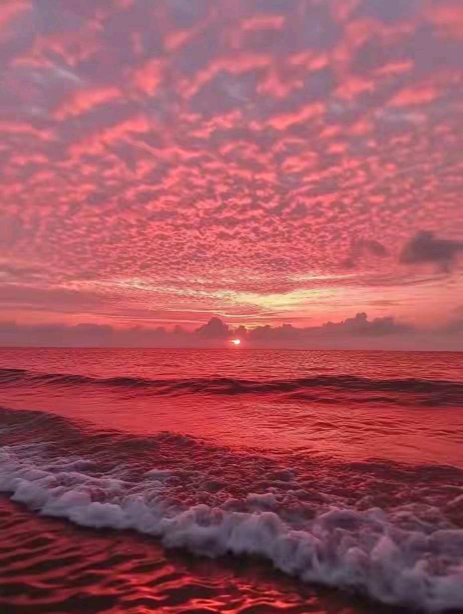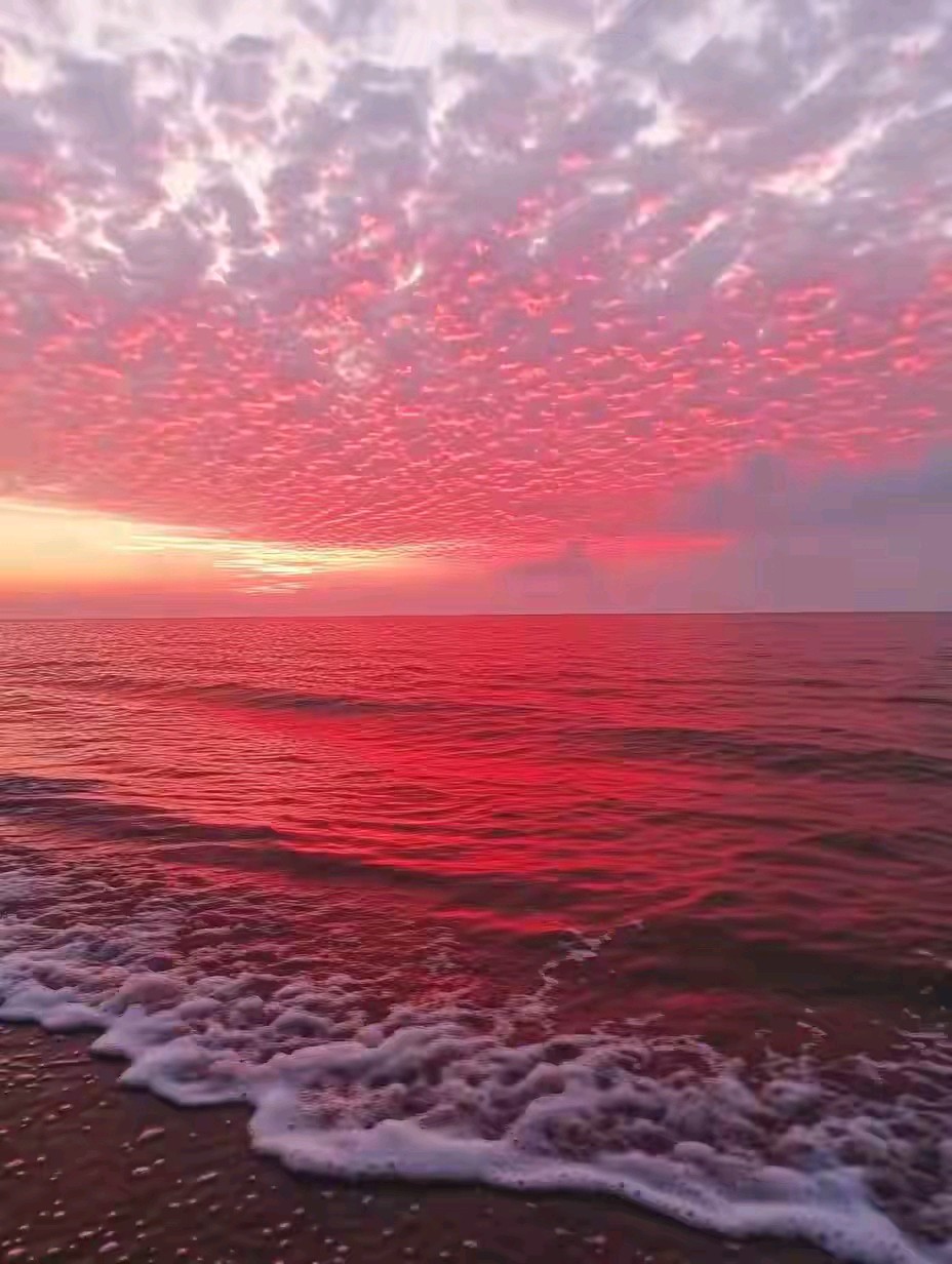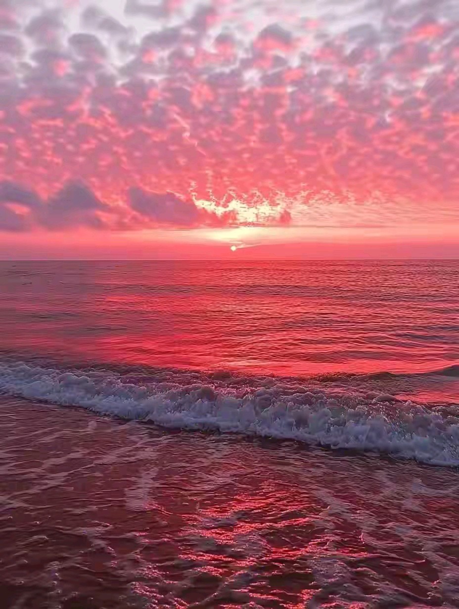夕阳下的海滩如诗如画,粉红的海滩与绚丽的夕阳相映成趣,美得令人陶醉。余晖洒满红叶,水边静享这绝美的晚霞时光,让人流连忘返