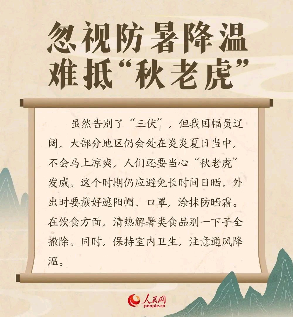 所谓“秋老虎”,是指出伏后短时间回热到35℃以上的天气,大多发生在每年公历8月下旬至9月上旬,气候特征是早晚清凉、午后高温暴晒。大家出行一定要注意防暑降温防晒!
