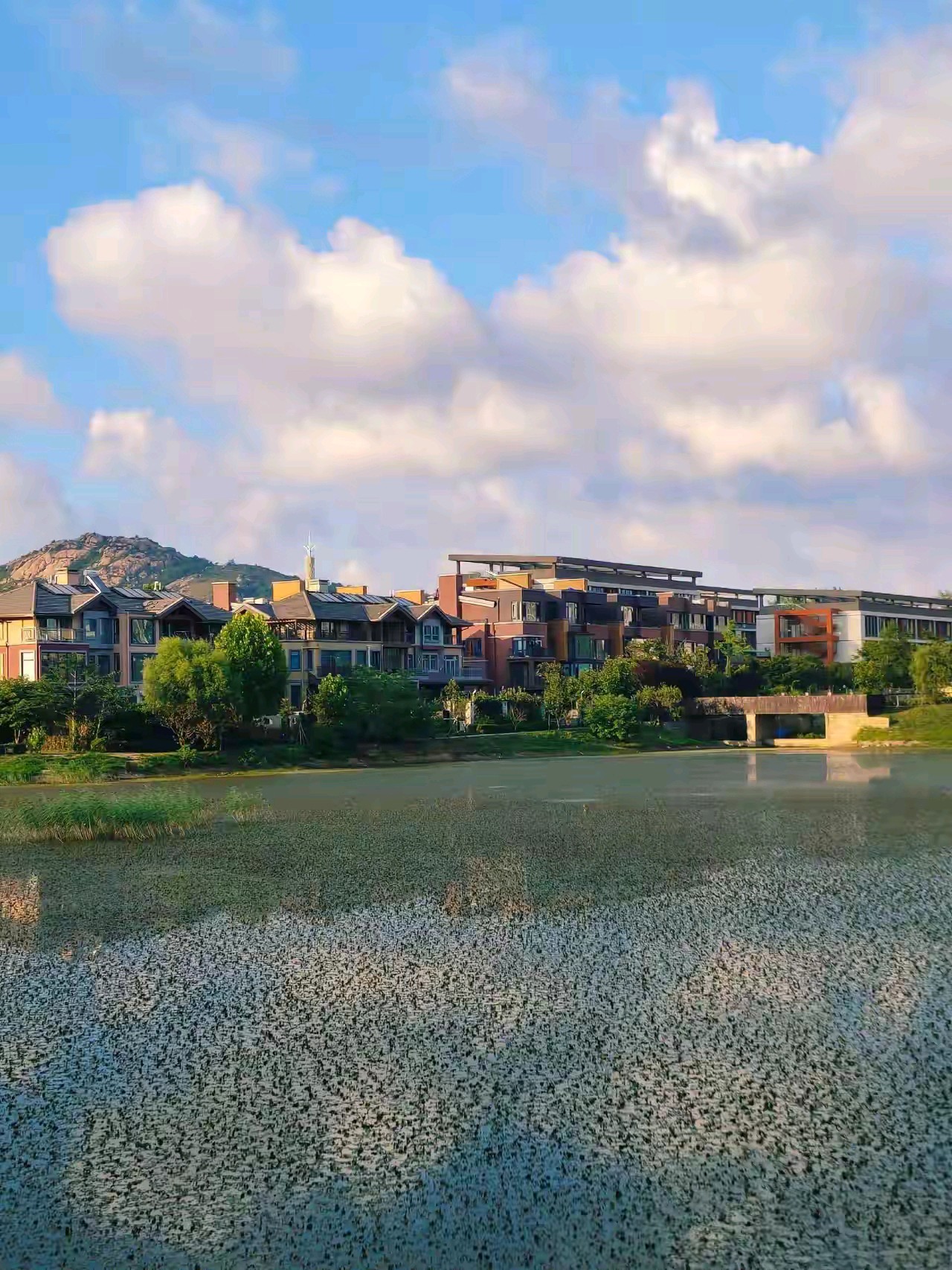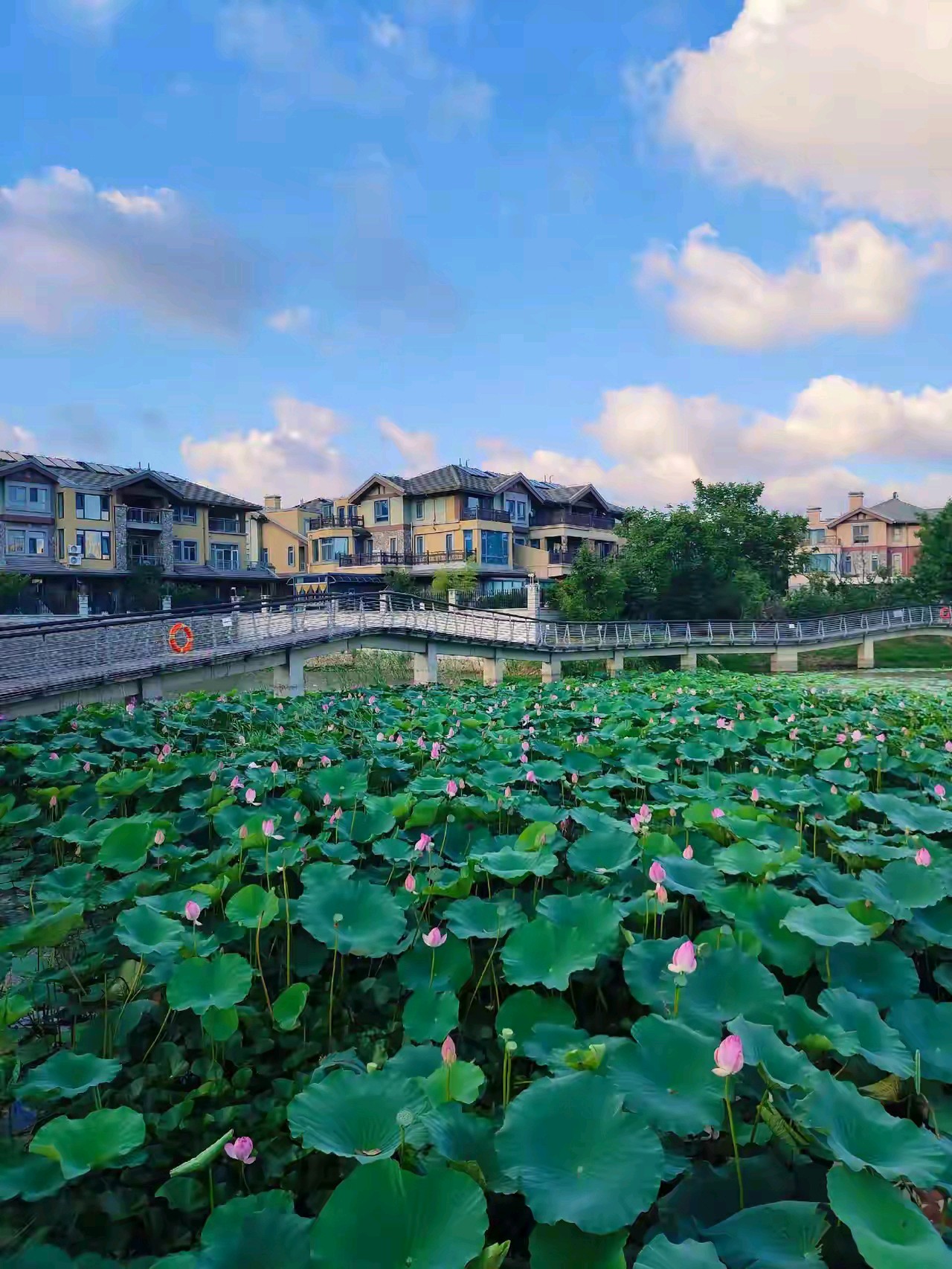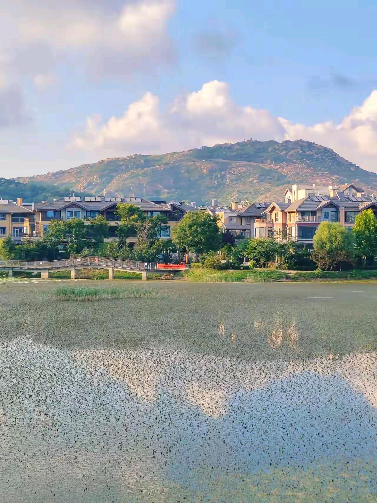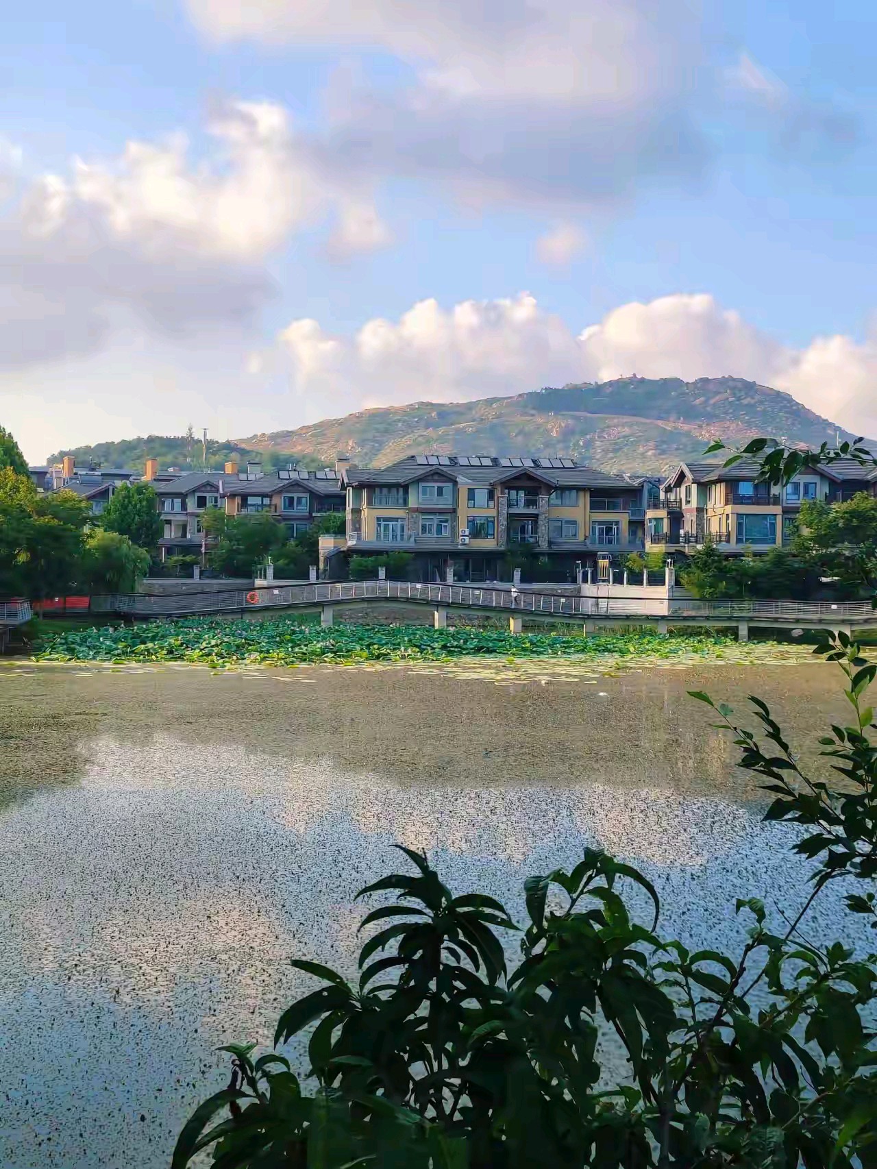 黄岛万科青岛小镇南湖公园,围湖建有步道和连桥,湖中开有荷花,远处小珠山矗立,在湖水中倒映,景色宜人。