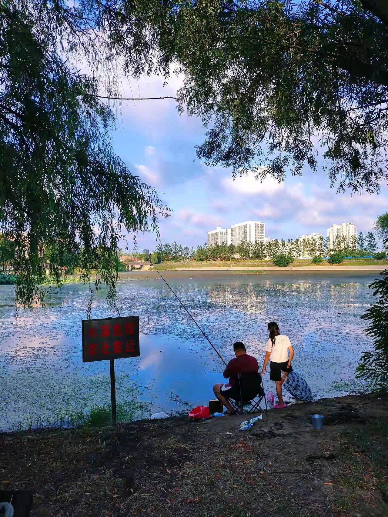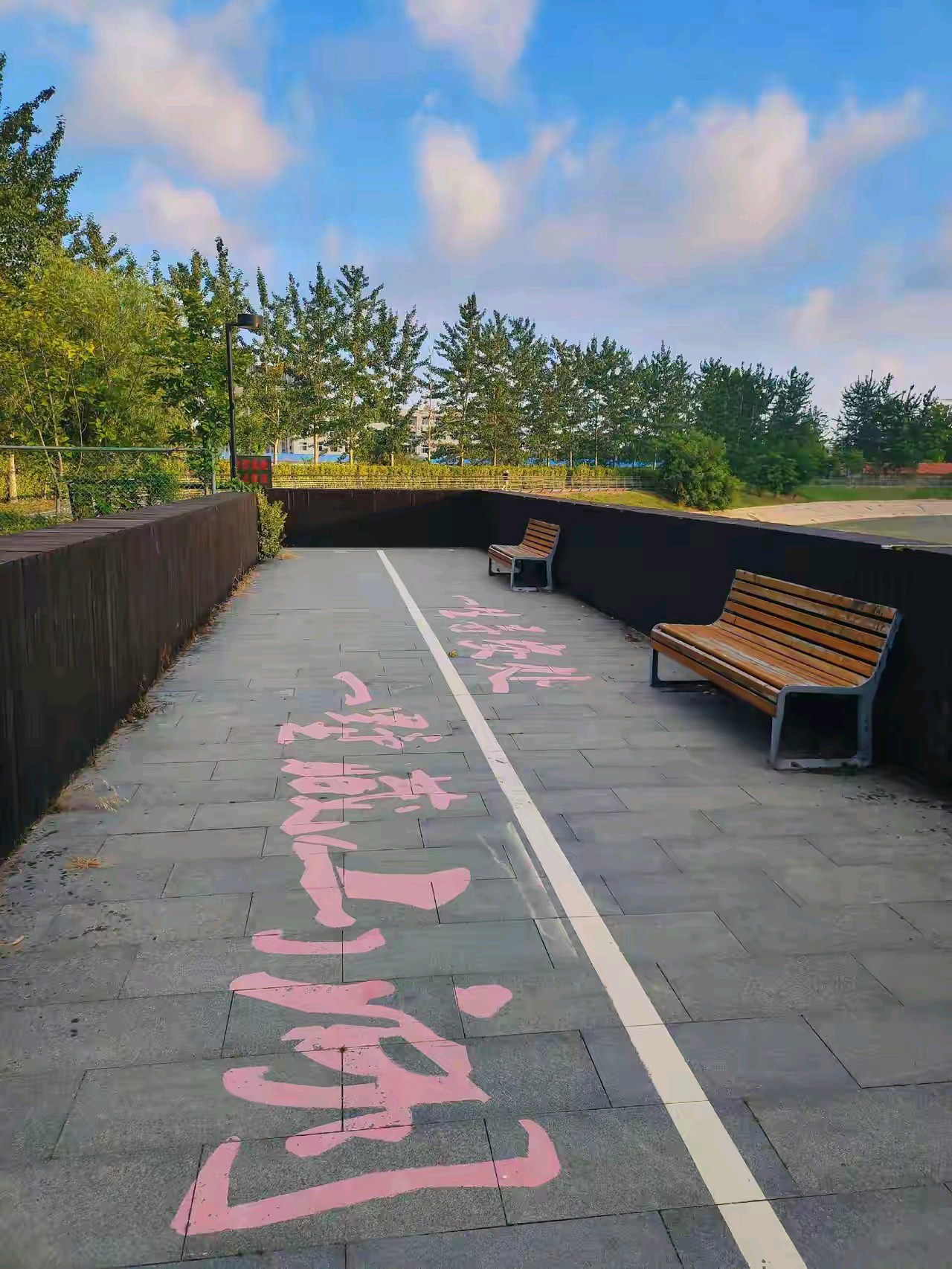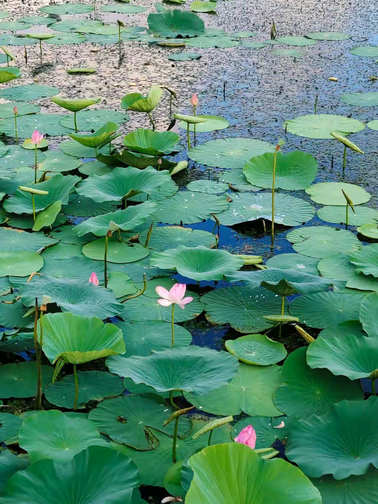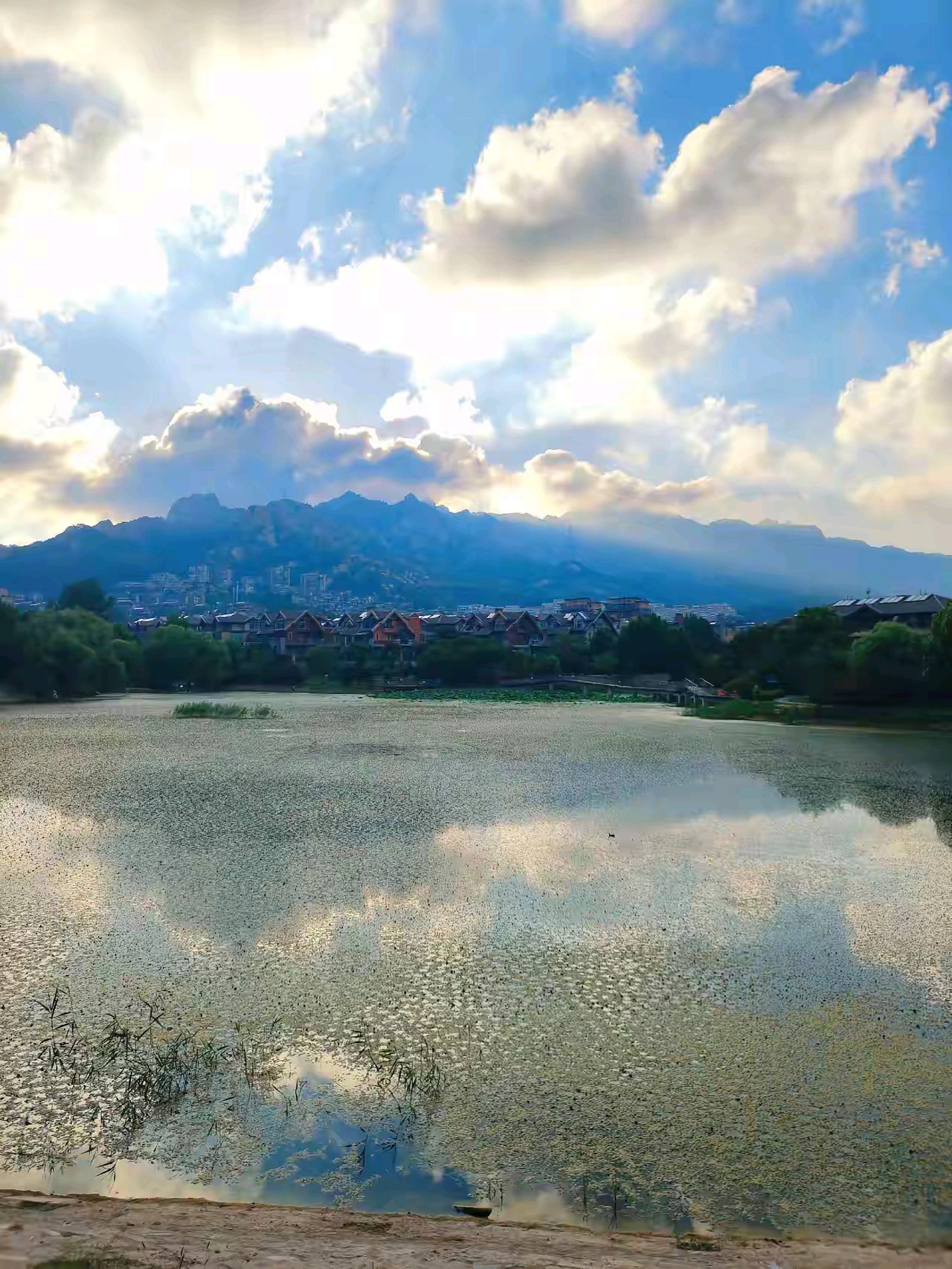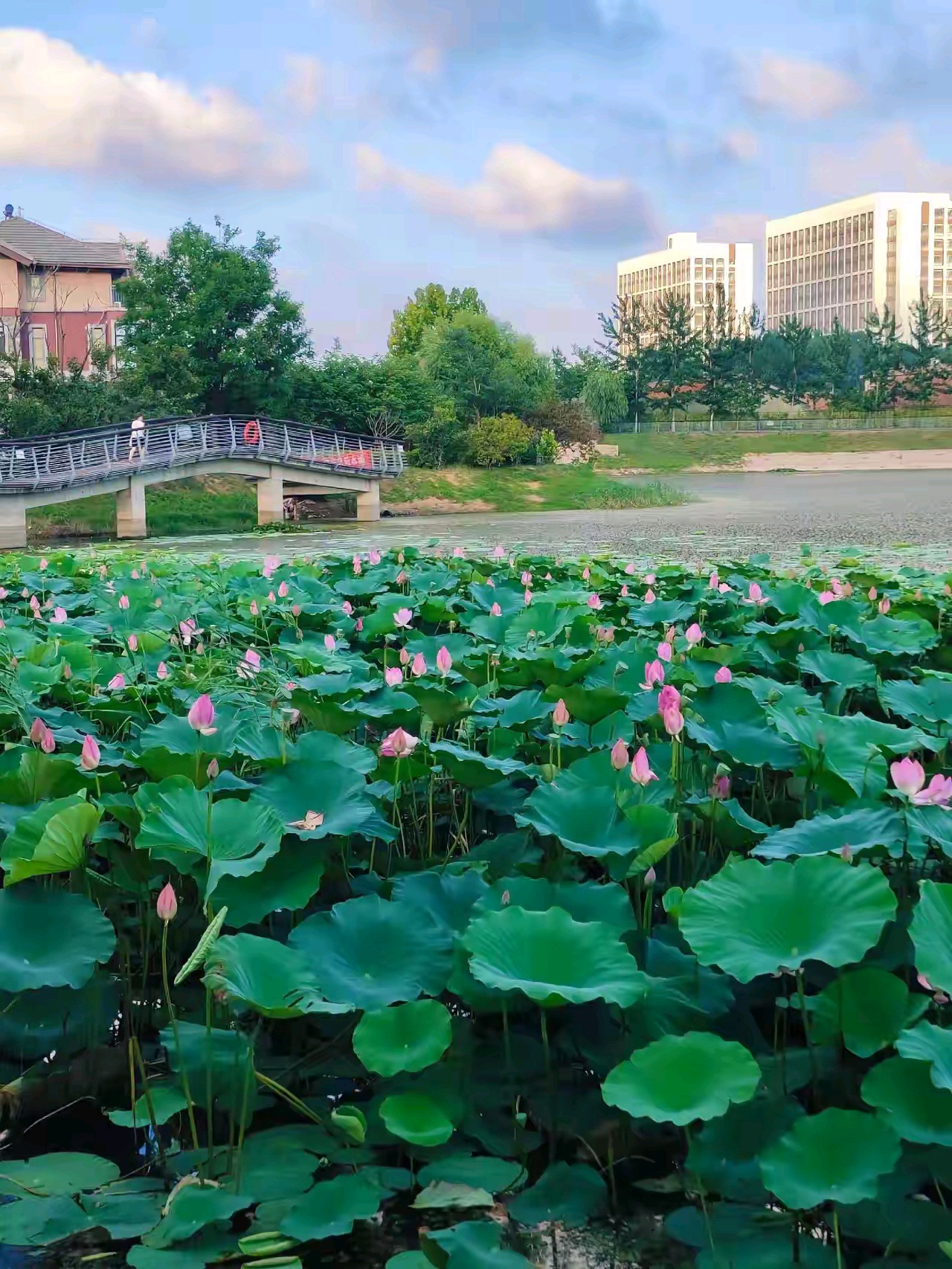 黄岛万科青岛小镇南湖公园,围湖建有步道和连桥,湖中开有荷花,远处小珠山矗立,在湖水中倒映,景色宜人。