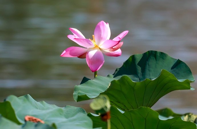 秋日大明湖的荷花,其美或许不在于夏日的繁盛,而在于一种趋于成熟的静美与淡淡的禅意。荷叶虽不如夏日那般密集挺括,但依然铺满湖面,部分叶片边缘渐染秋色,或已开始凋零半浸水中,与依然苍翠的柳条相映,勾勒出“四面荷花三面柳”的诗意画卷。