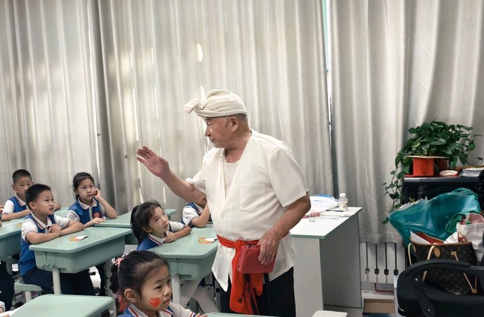 视频播放当身穿短袖白褂、头戴白毛巾的赵大奎老师一出场,孩子们立刻被他惟妙惟肖的装扮吸引住了——他要扮演的是家喻户晓的小英雄王二小!