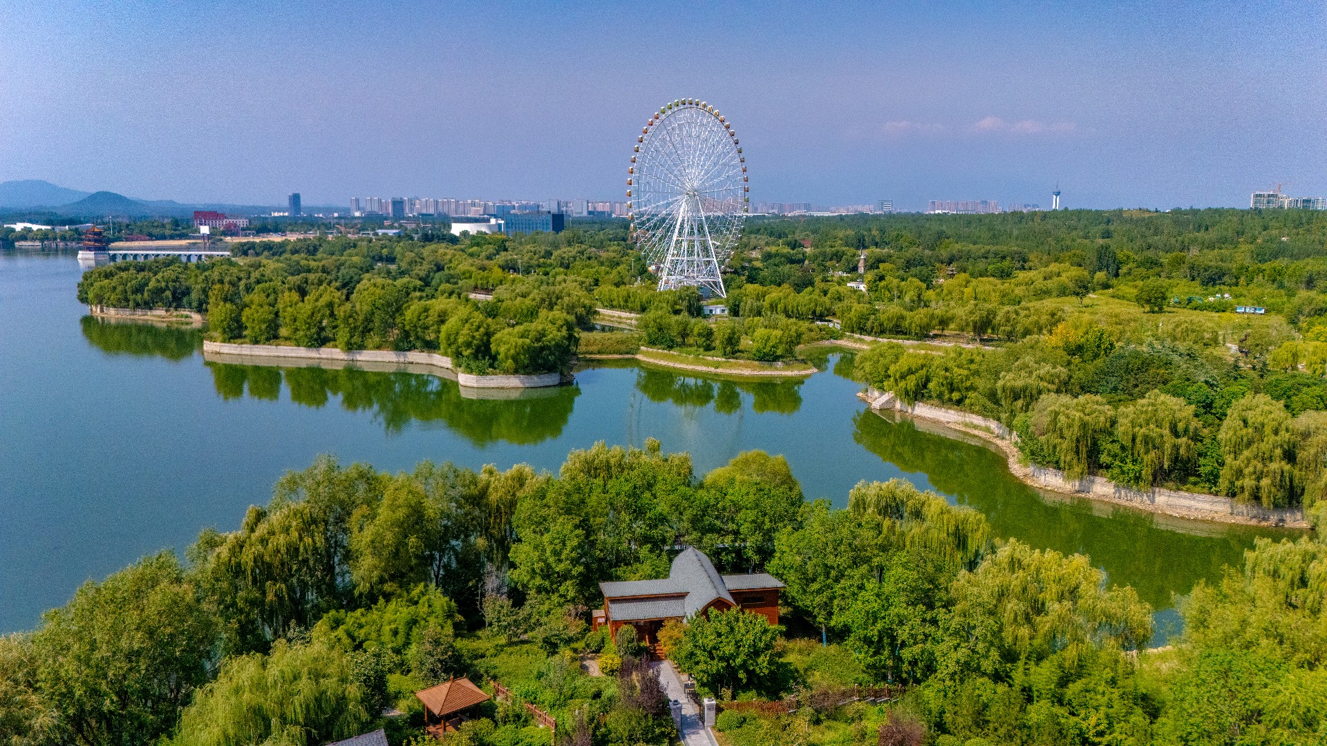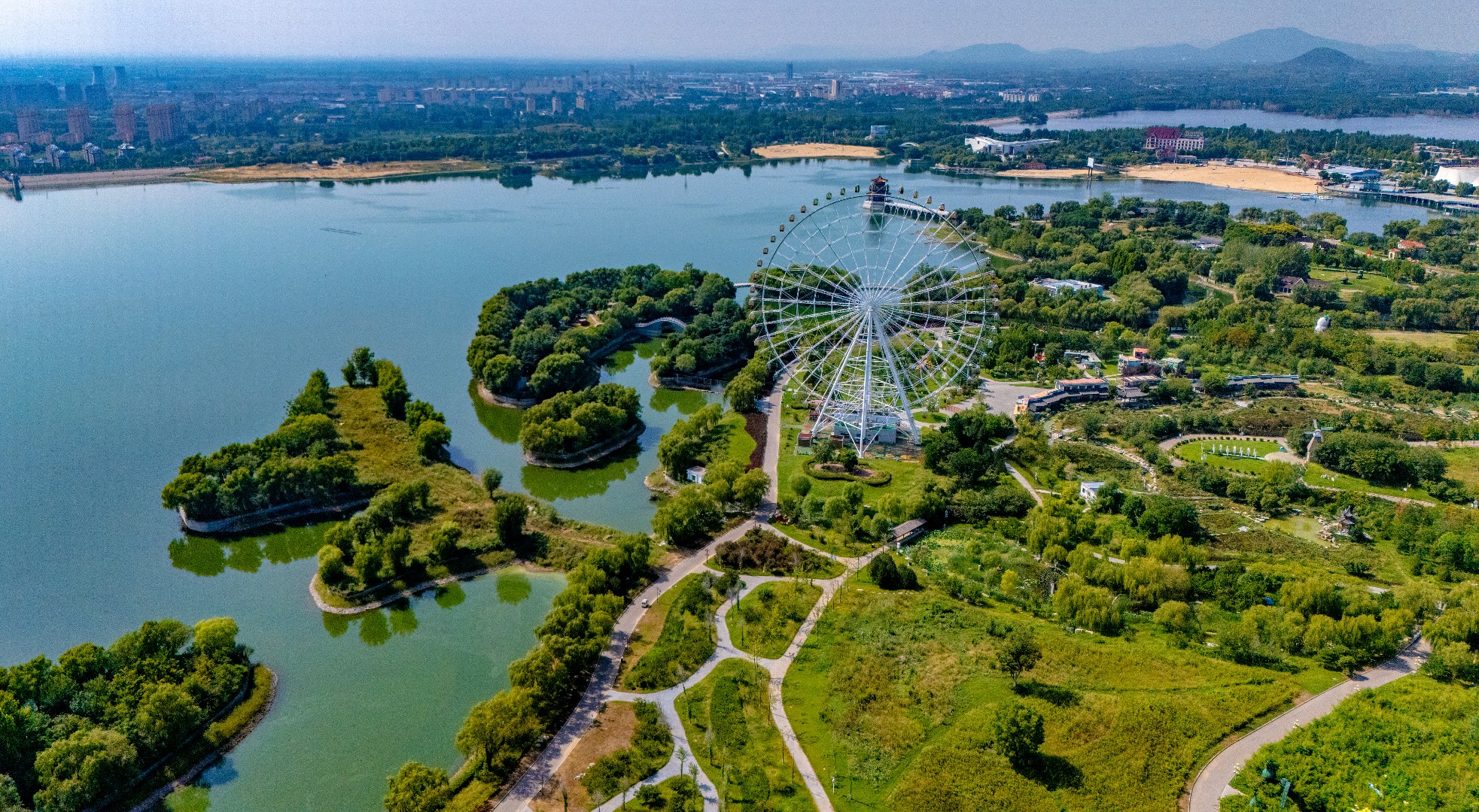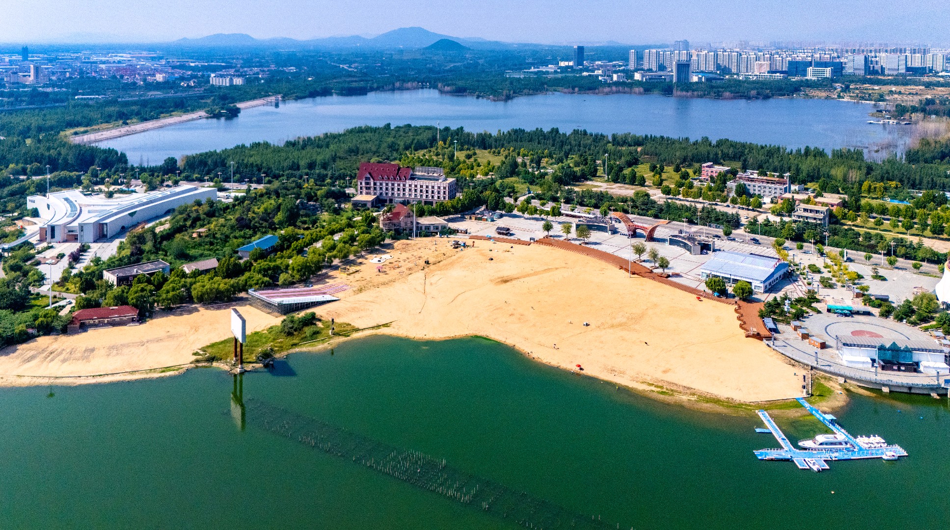 秋日泰安天颐湖,秋高气爽,碧水映蓝天,惬意满溢。临湖木别墅隐于垂柳柔丝与松柏翠绿间,相映成趣。“泰山之眼”摩天轮聶立湖畔,欧式建筑错落有致,湖中小岛散落由各式拱桥相连,景致雅致。滨湖沙滩松软,孩子们追逐嬉戏,尽得休闲,湖畔秋日生机尽显。