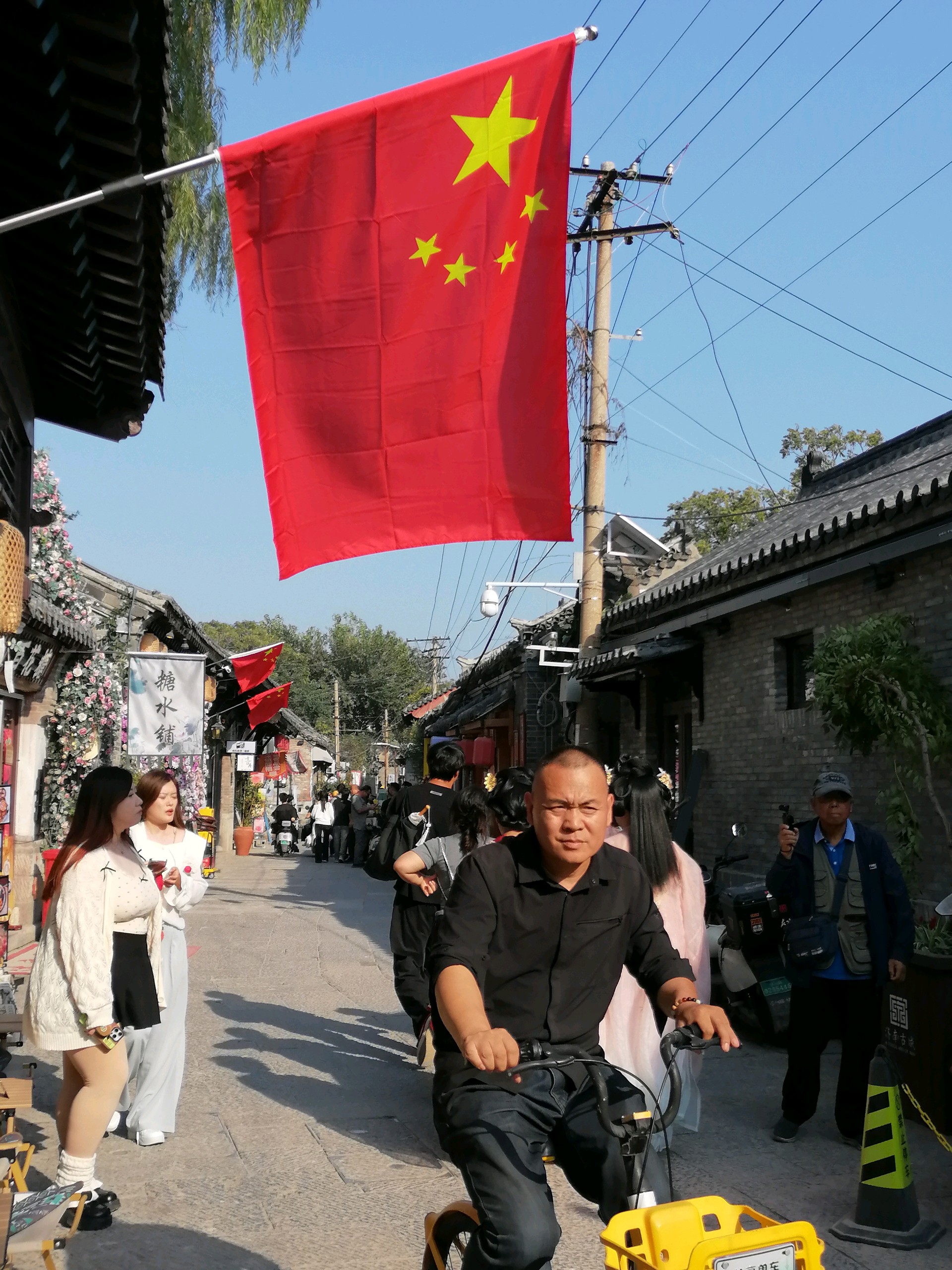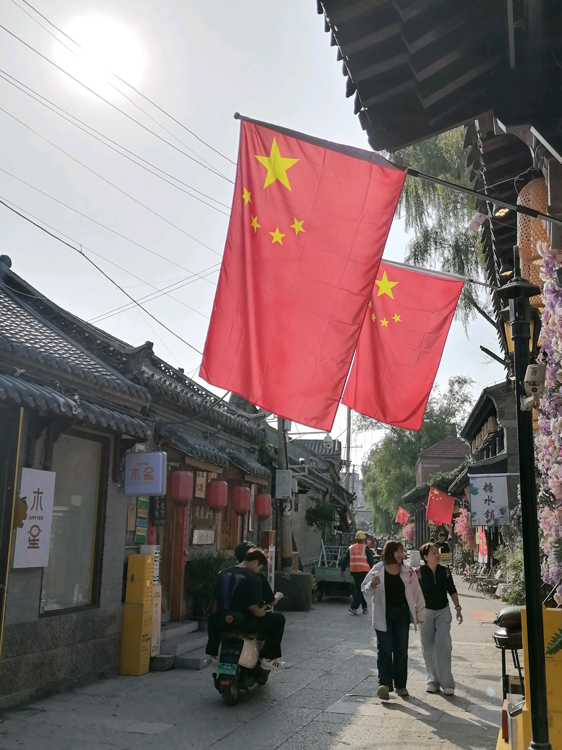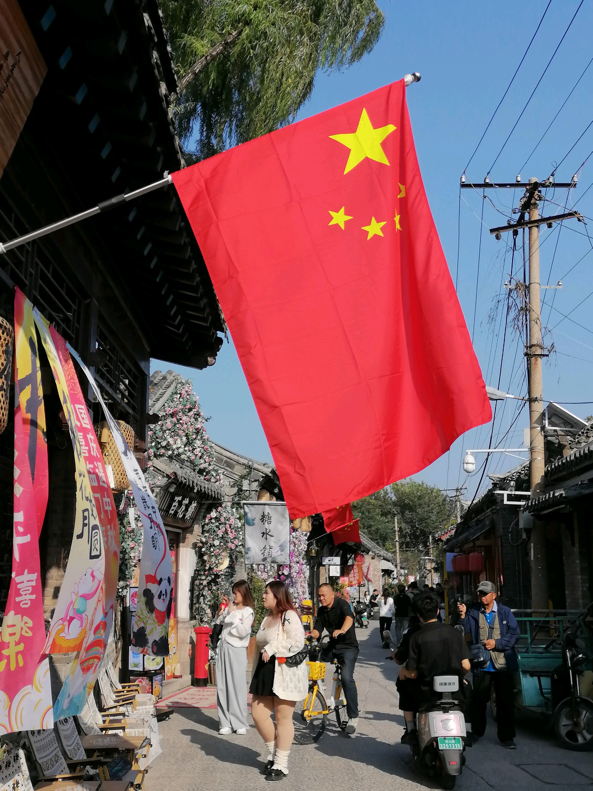 国旗飘扬,人们忙碌着。有的人在拍照,有的人在散步,还有的人坐在路边休息。这个场景给人一种宁静而和谐的感觉。