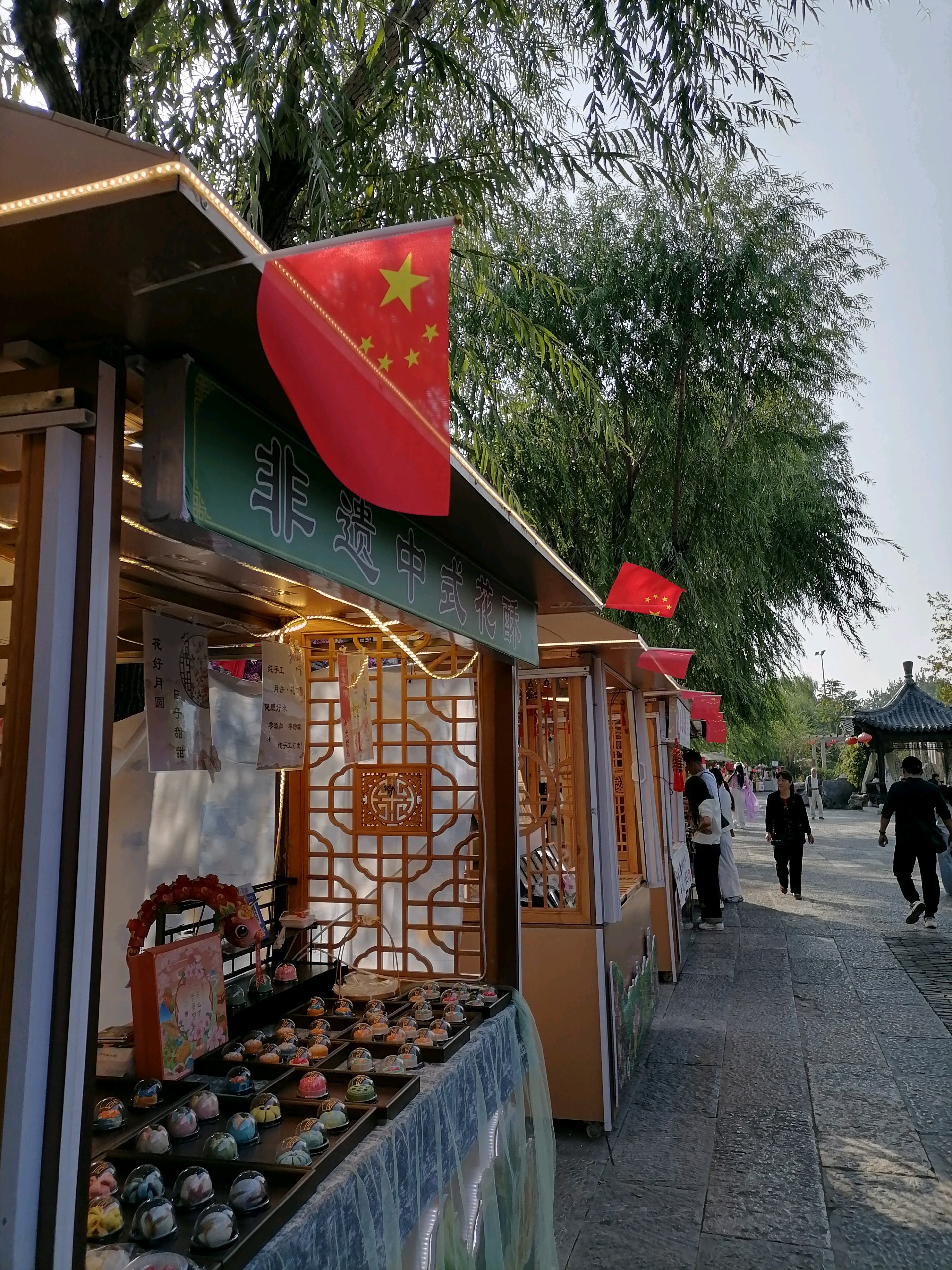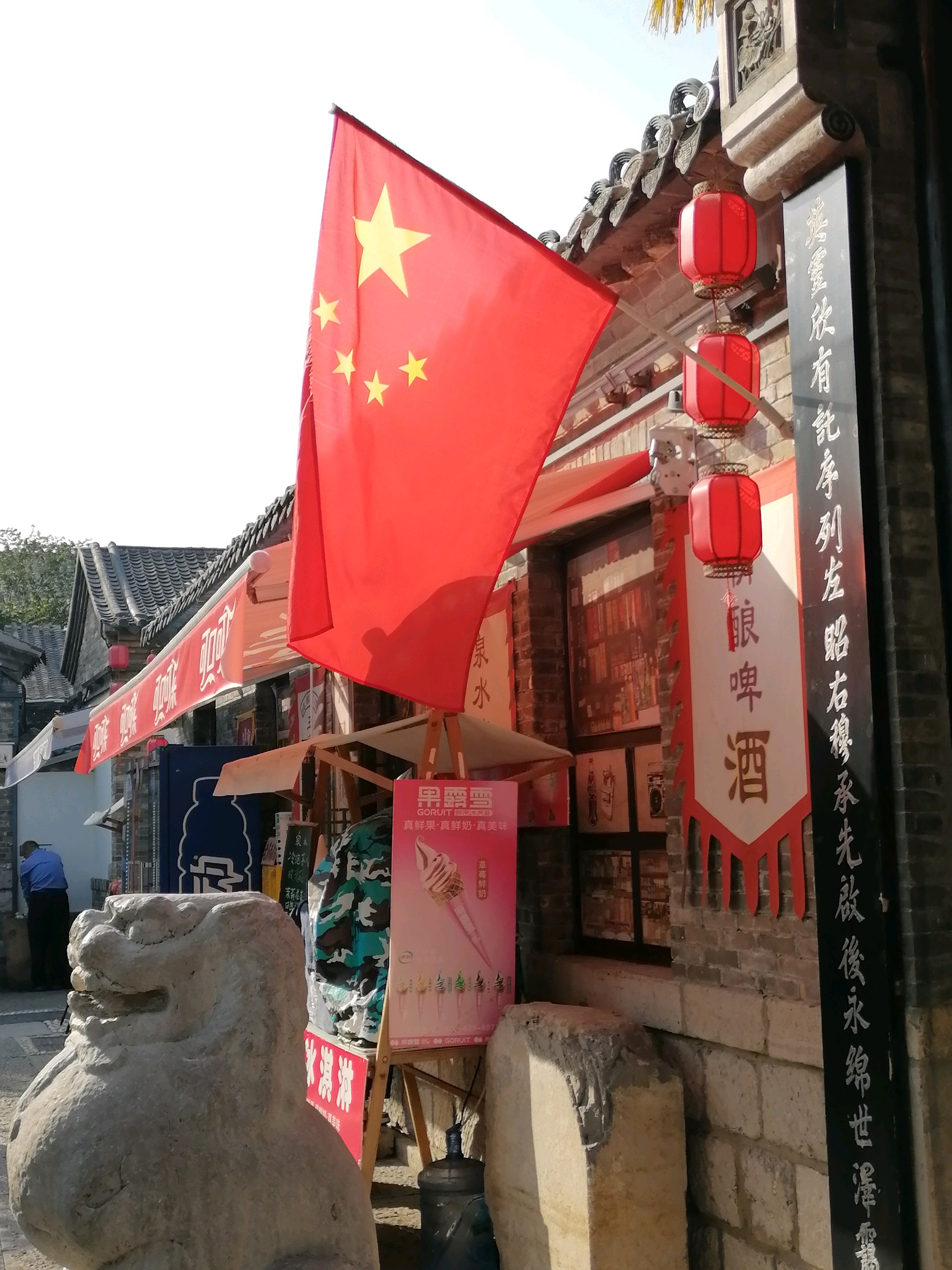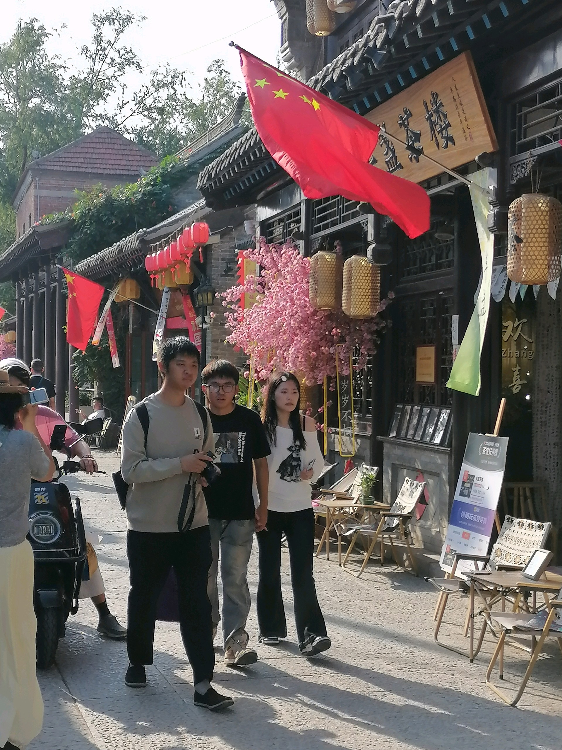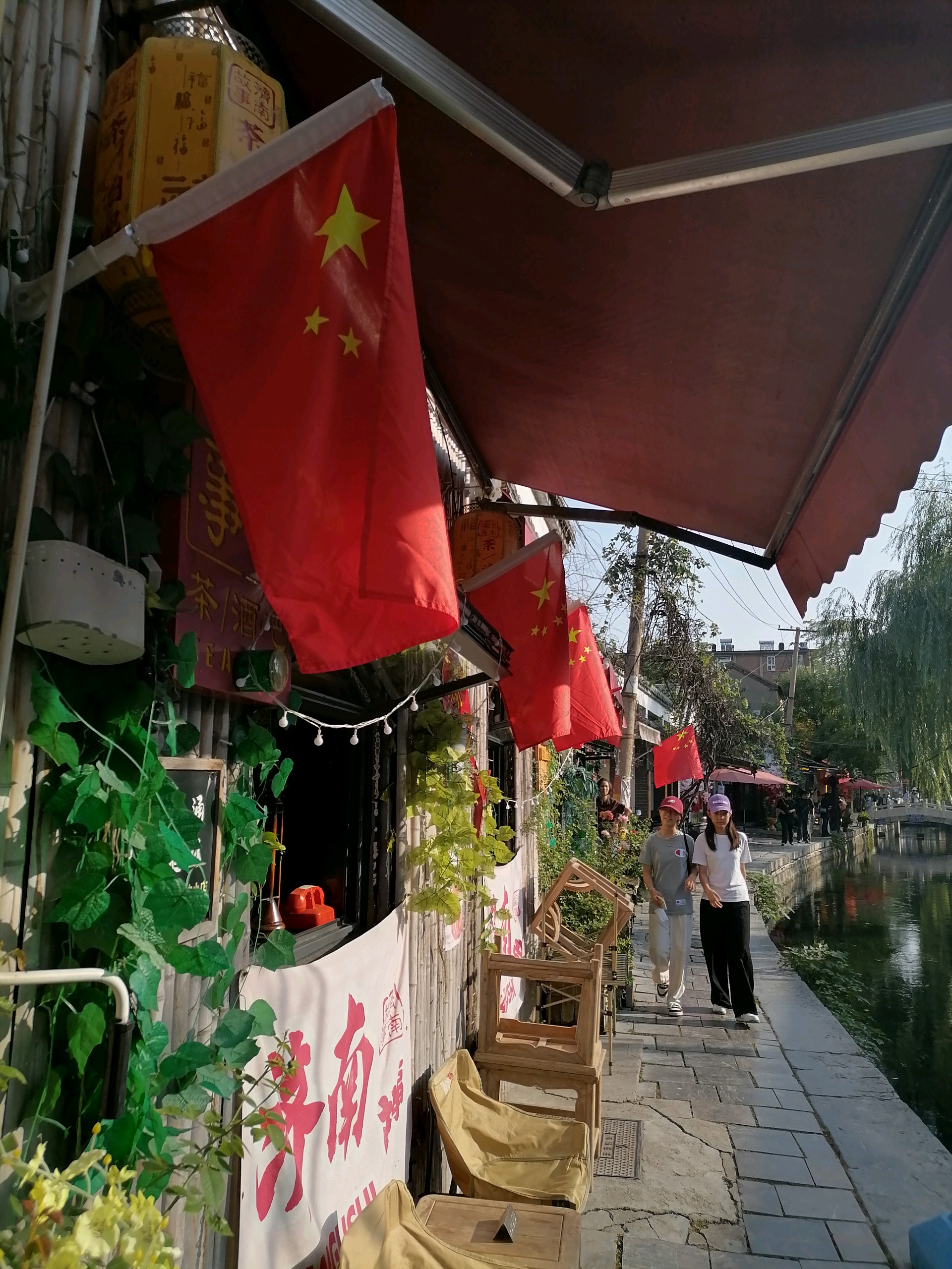 国旗飘扬,人们忙碌着。有的人在拍照,有的人在散步,还有的人坐在路边休息。这个场景给人一种宁静而和谐的感觉。