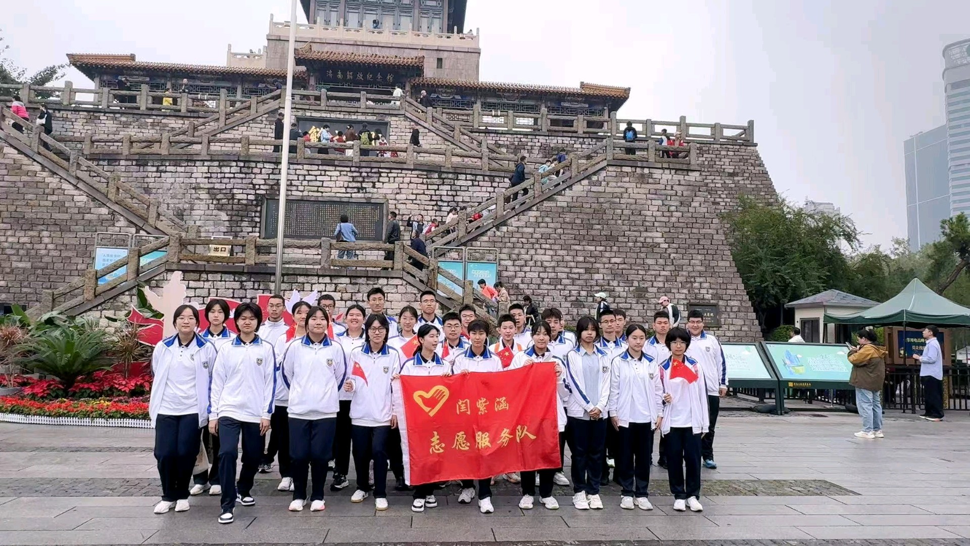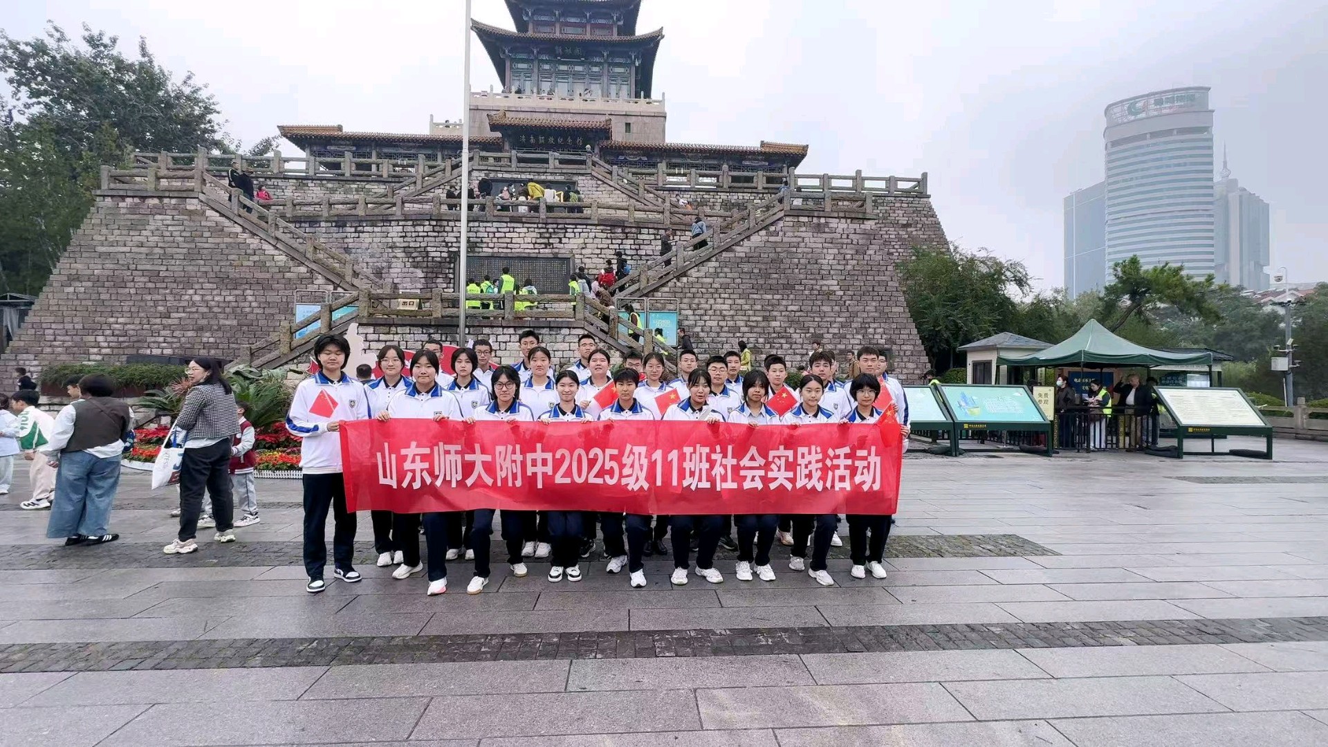 【社会实践】山东师大附中2025级11班走进解放阁,缅怀先烈。同学们身着统一的校服,手持鲜艳的国旗,展现出青春的活力与风采。让我们共同期待他们的实践成果!