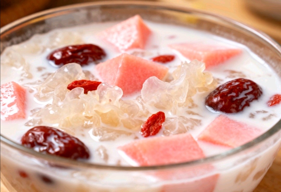 5. 木瓜红枣银耳奶羹:银耳煮至出胶,加红枣、枸杞、木瓜煮3分钟,关火后加牛奶搅匀,润燥养颜。