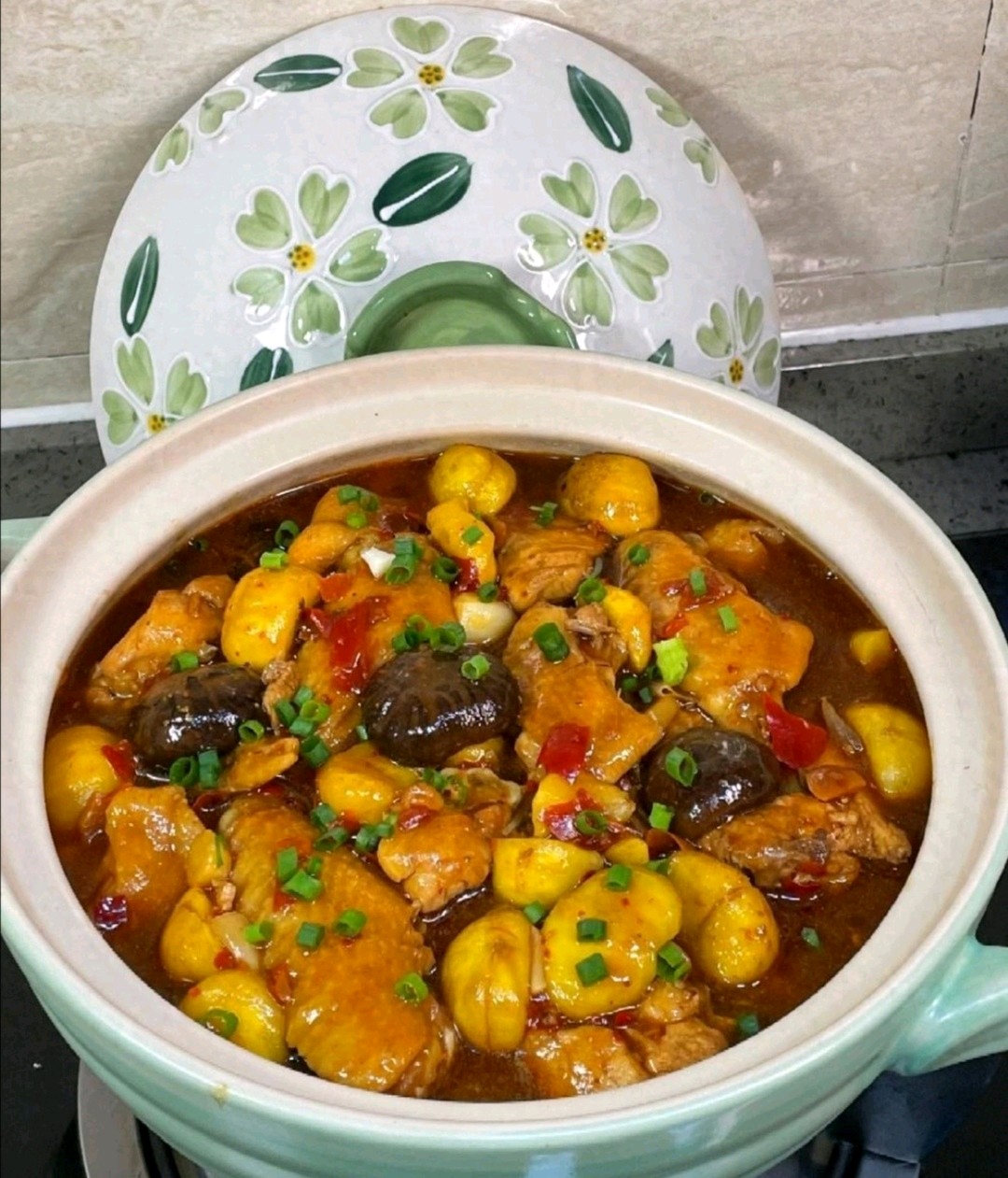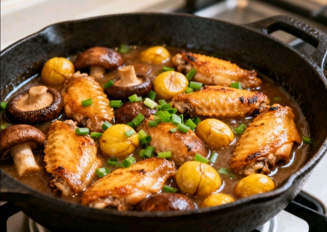 4. 香菇栗子鸡翅煲:鸡翅煎香,加香菇、栗子及调料焖10分钟收汁,暖肾强筋抗寒。