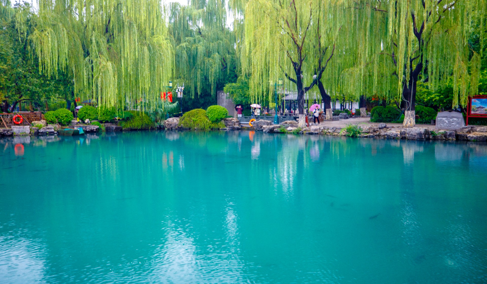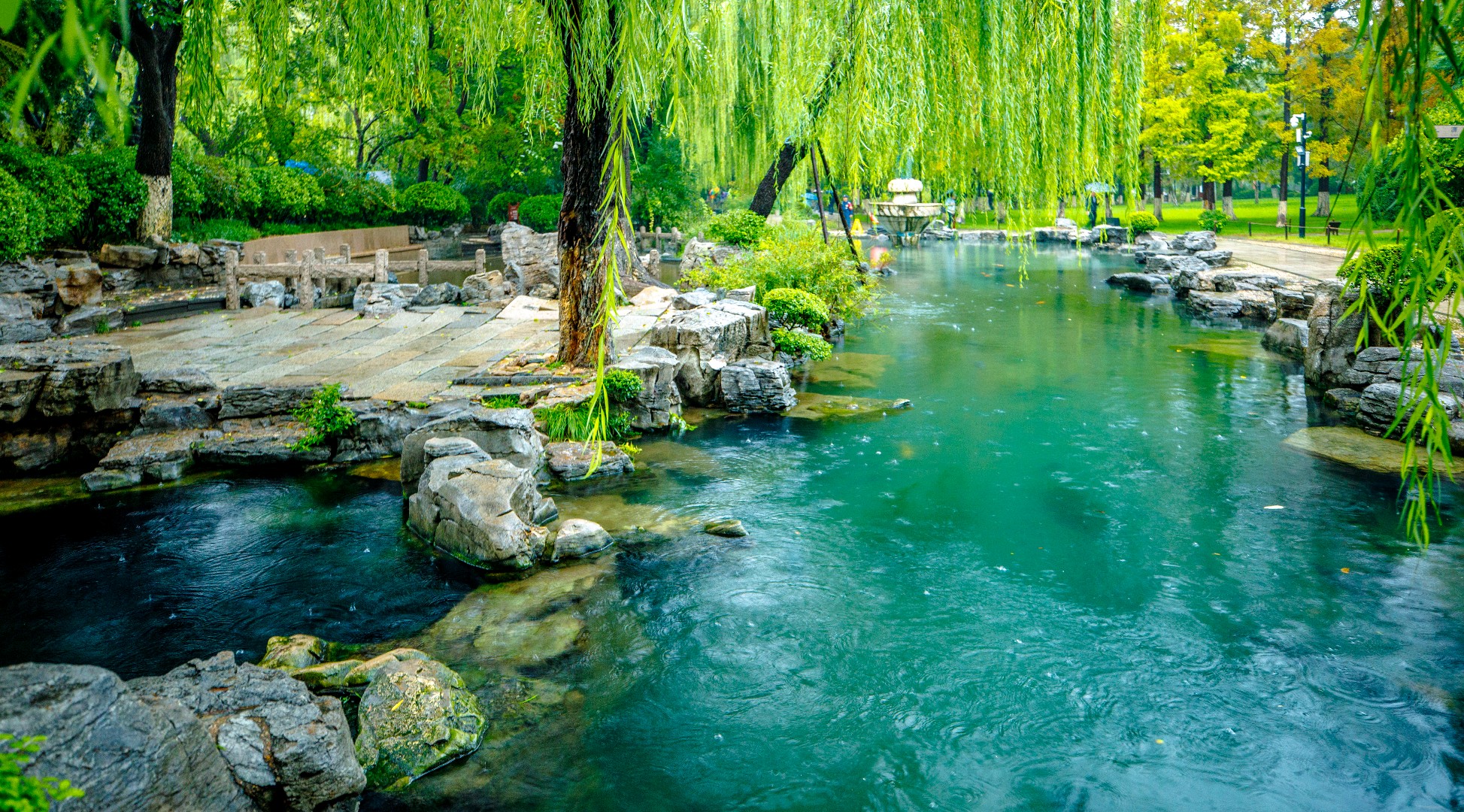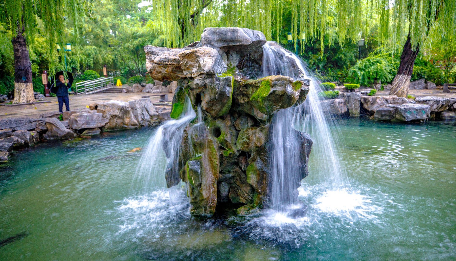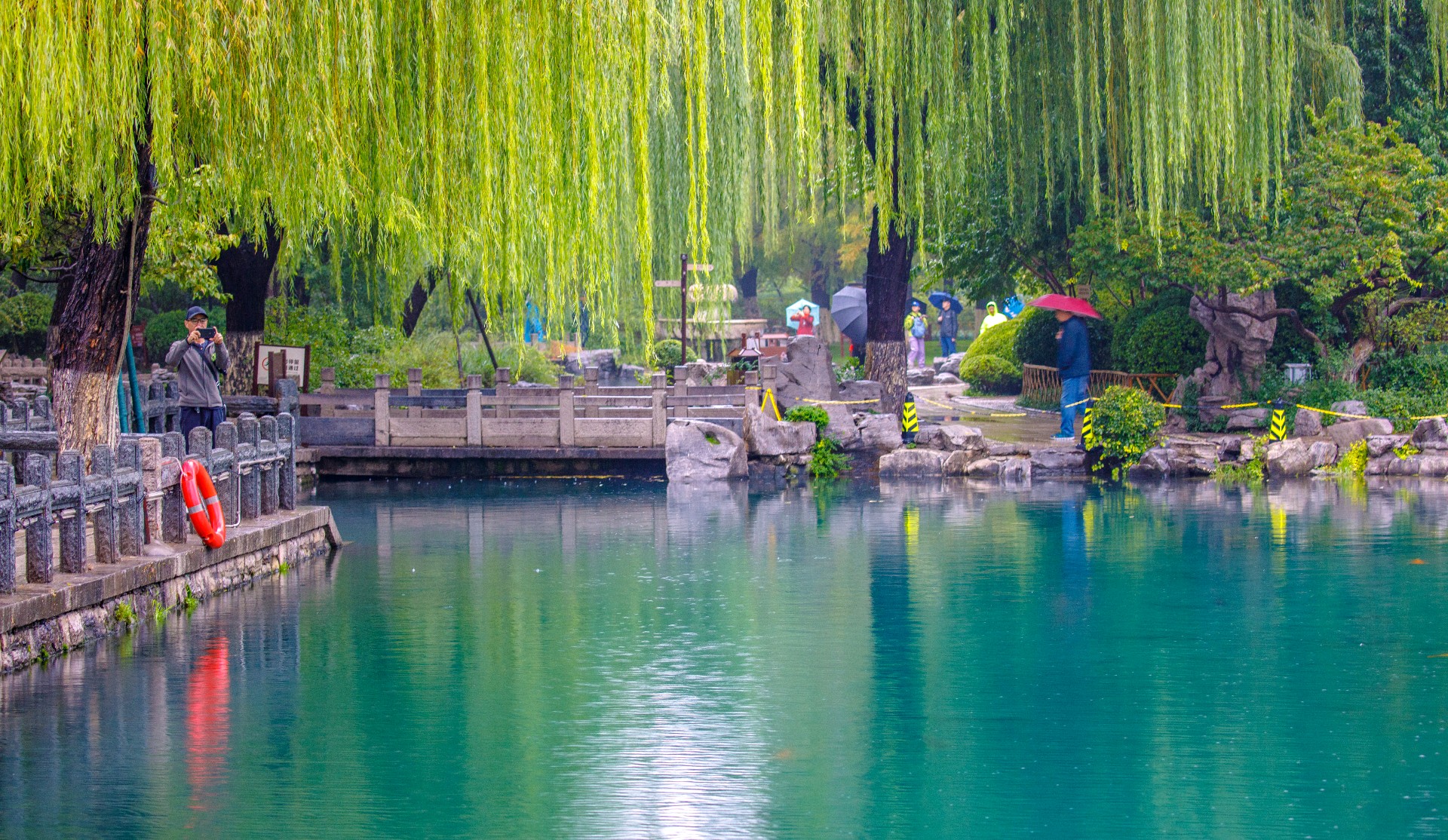 秋雨连绵,持续补给让地下水位逐步攀升,五龙潭泉群喷涌更劲,月牙泉“月牙飞瀑”盛景再现。雨中潭水澄澈如碧绿宝石,周边植被经雨水浸润,愈发葱郁鲜亮。许多游人雨中漫步园中,沉醉于这份独特的泉雨景致。