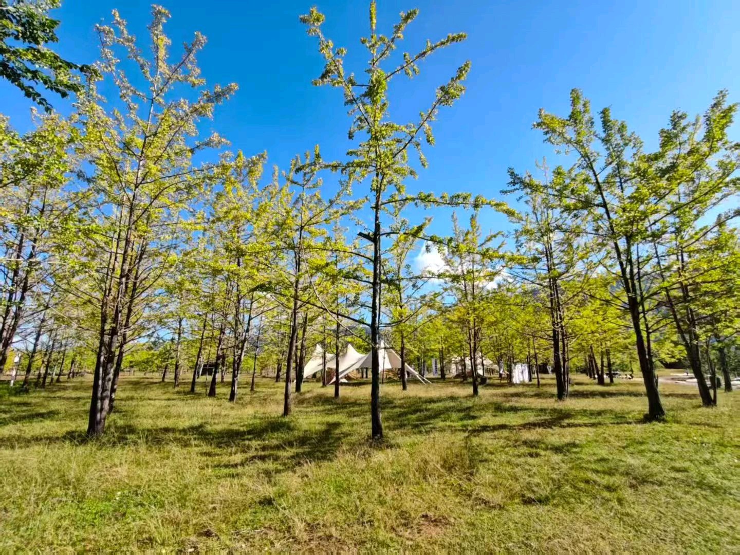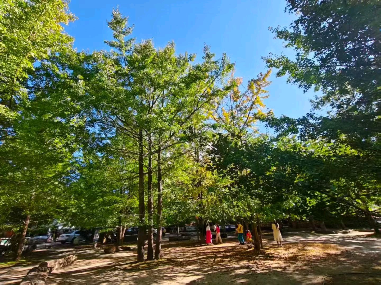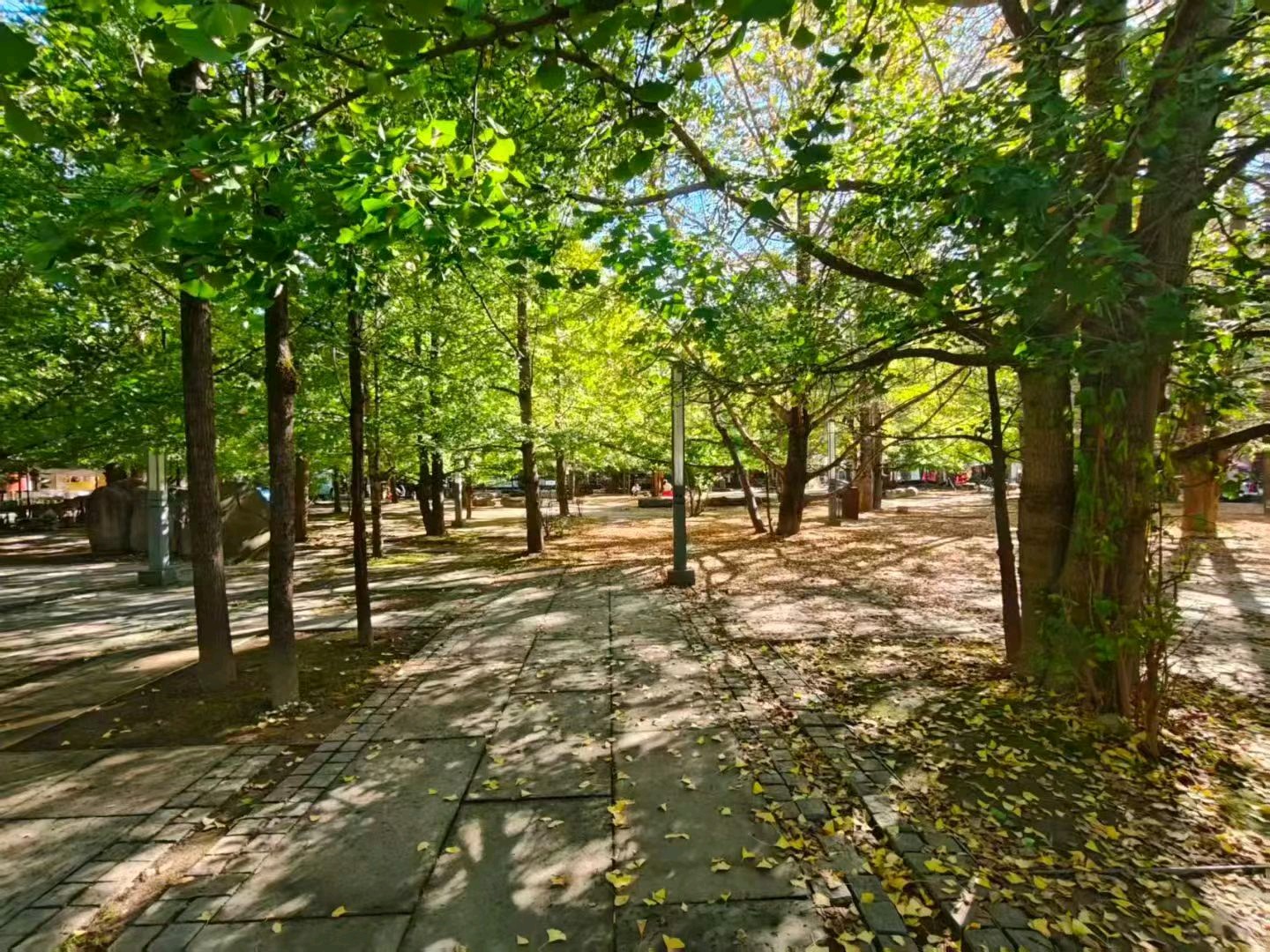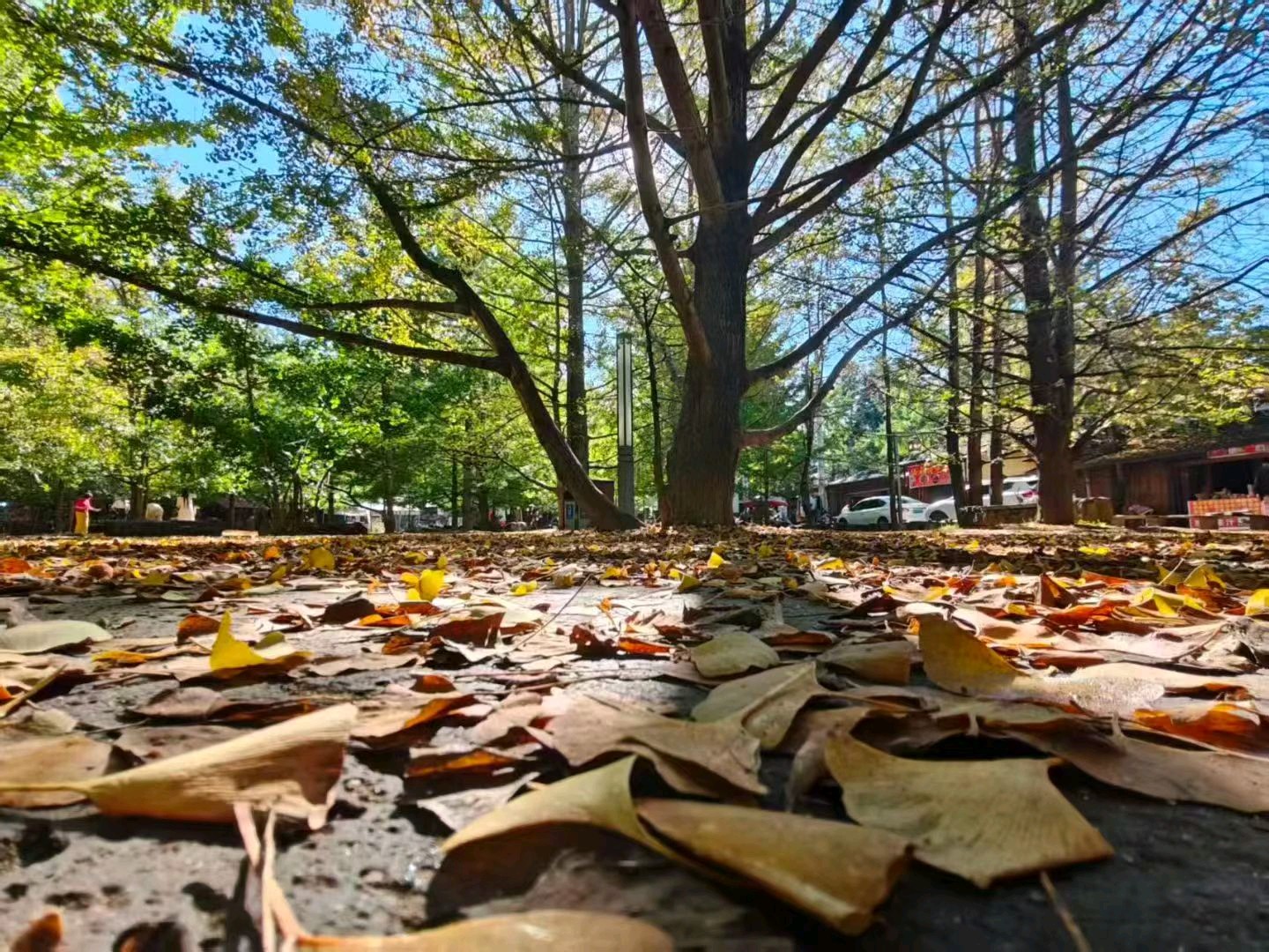 深秋的阳光透过树叶,洒在泛黄的落叶上,如同画出一幅美丽的秋日画卷。