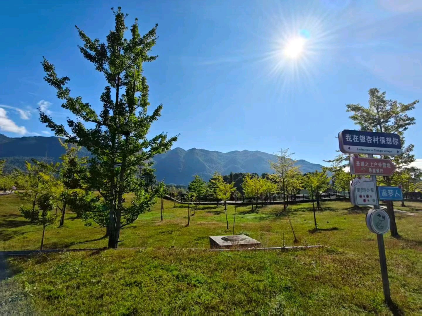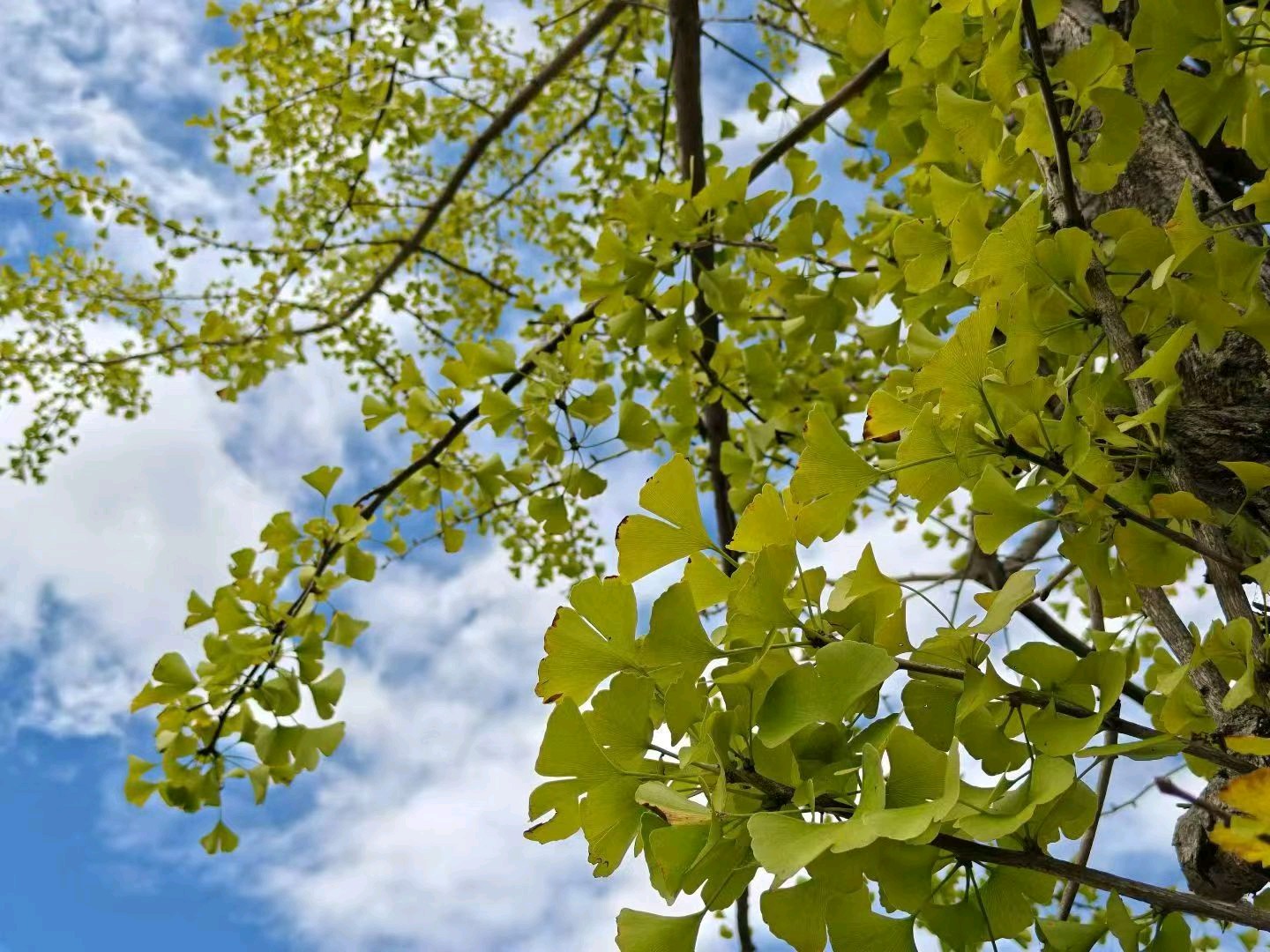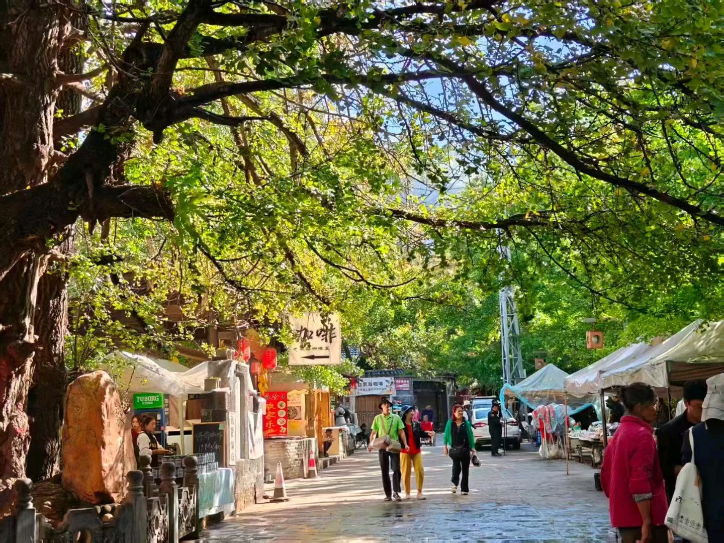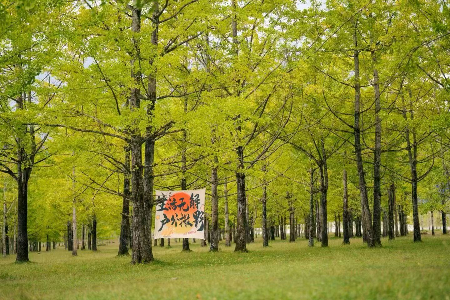 深秋的阳光透过树叶,洒在泛黄的落叶上,如同画出一幅美丽的秋日画卷。