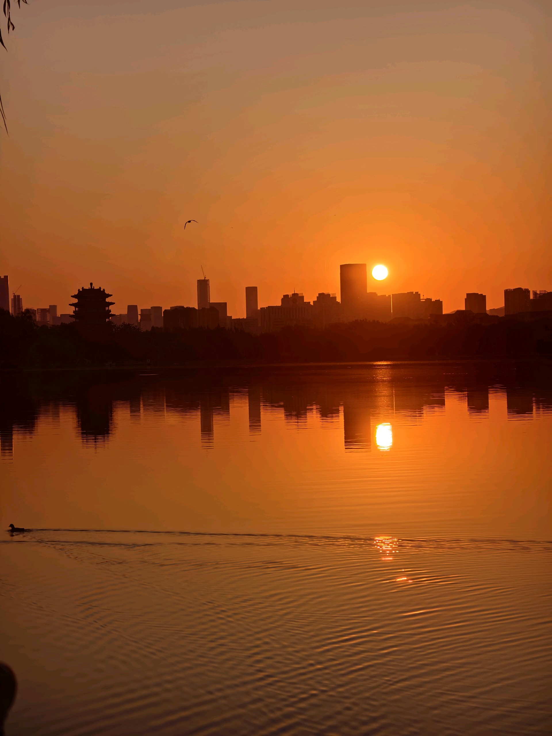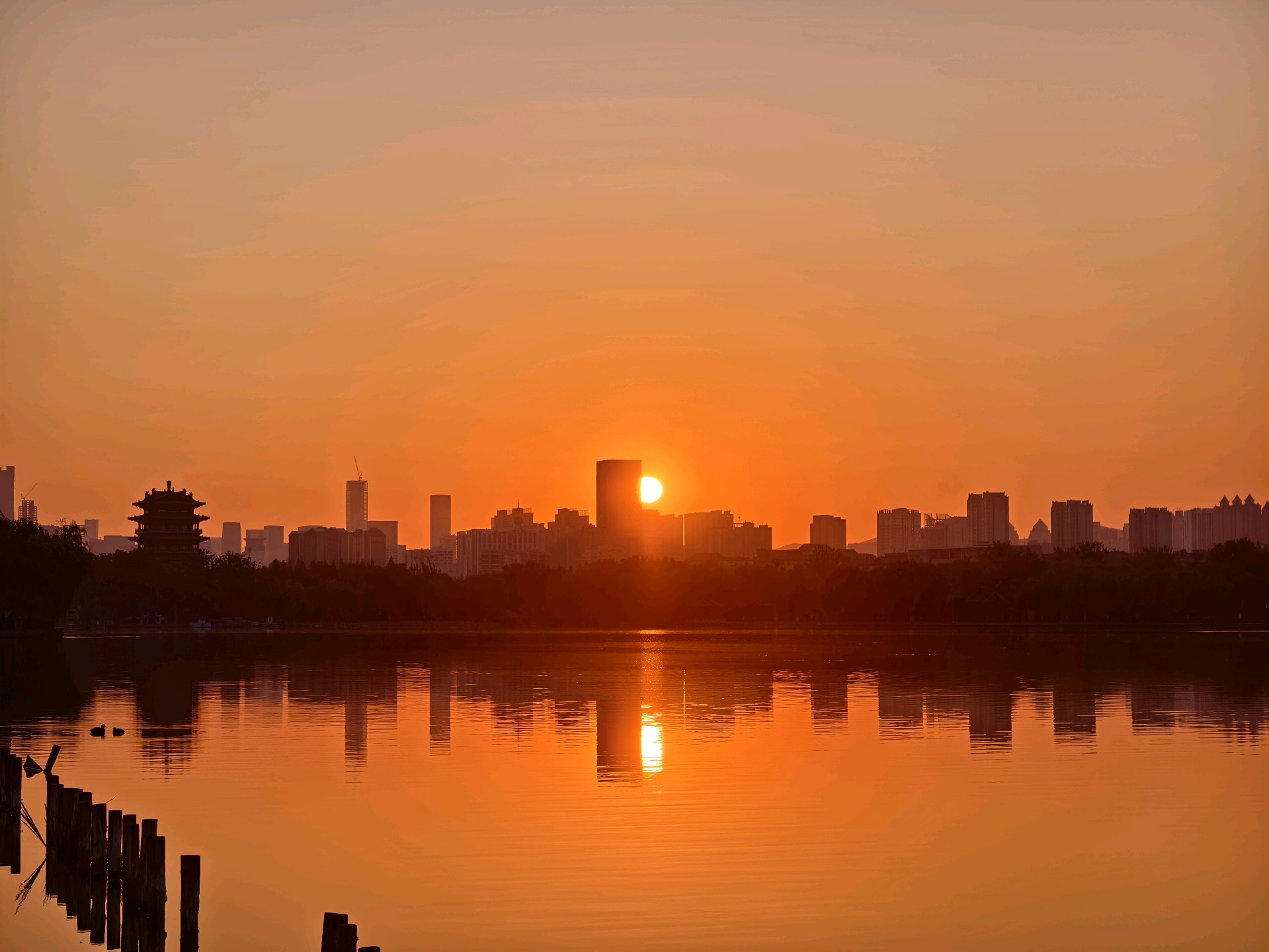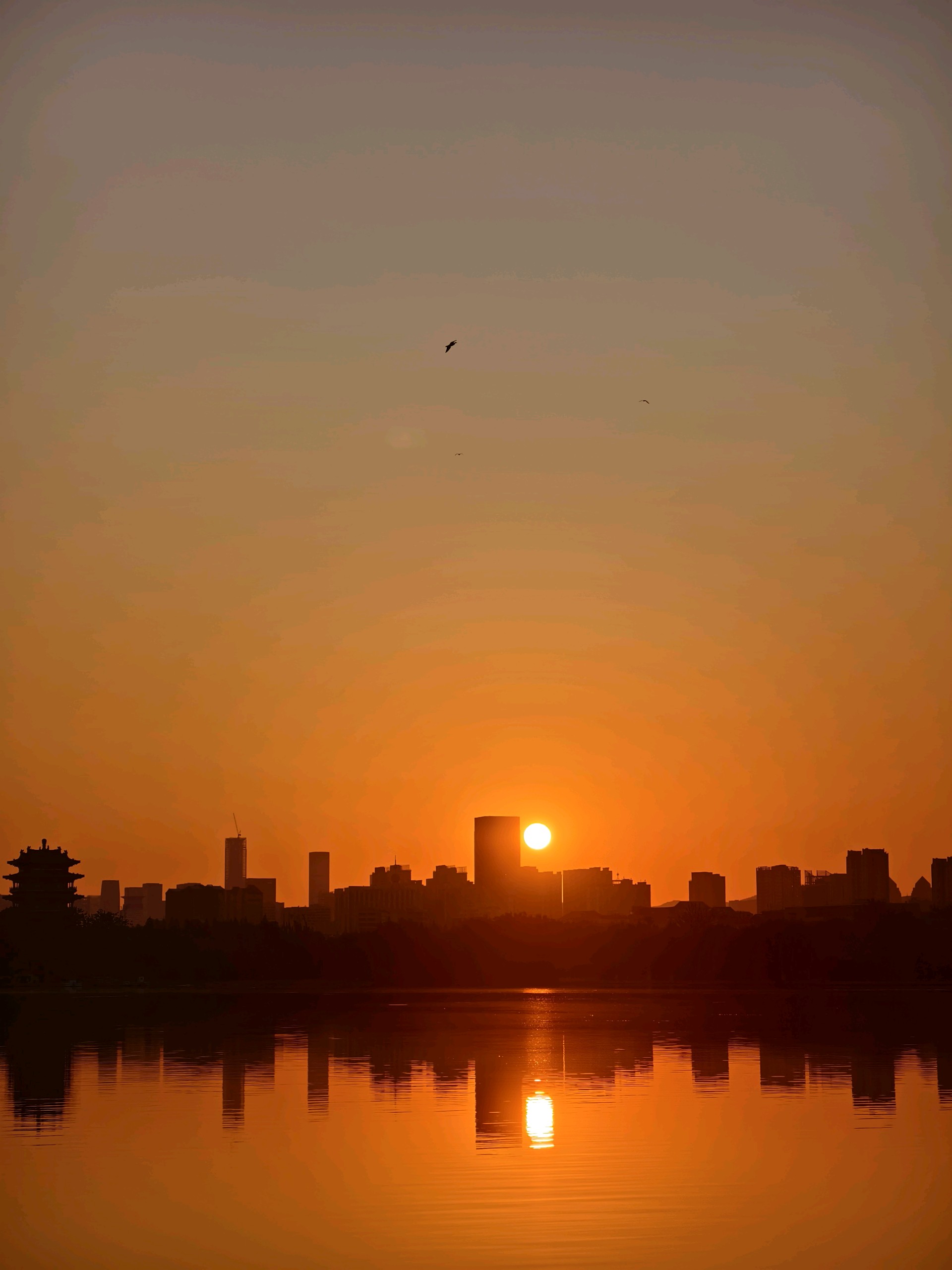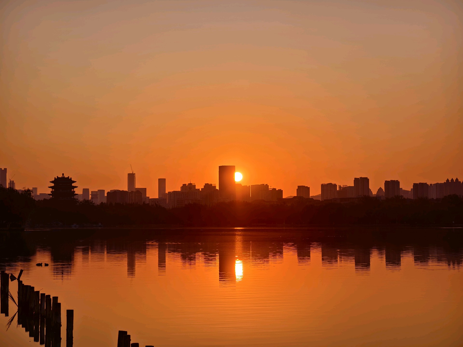 大明湖畔的晨光美景。新一轮的阳光冉冉升起,点亮了天际,倒映在平静的湖面上,水天一色,一片橘红。阳光洒在湖面,波光粼粼。高楼林立的城市剪影,鸟儿翱翔天际,平静的水面倒映着这一切,美得如同一幅画卷。