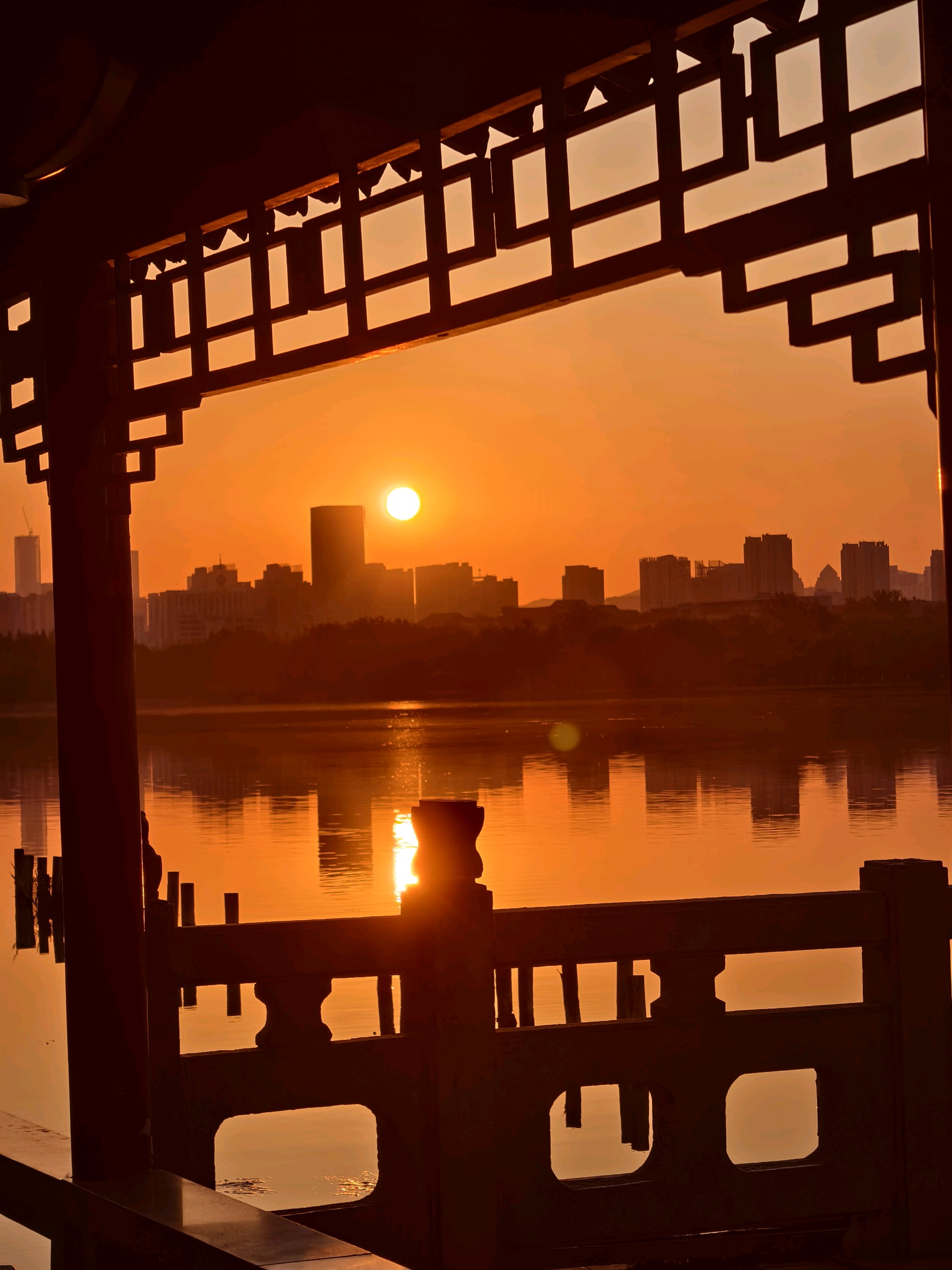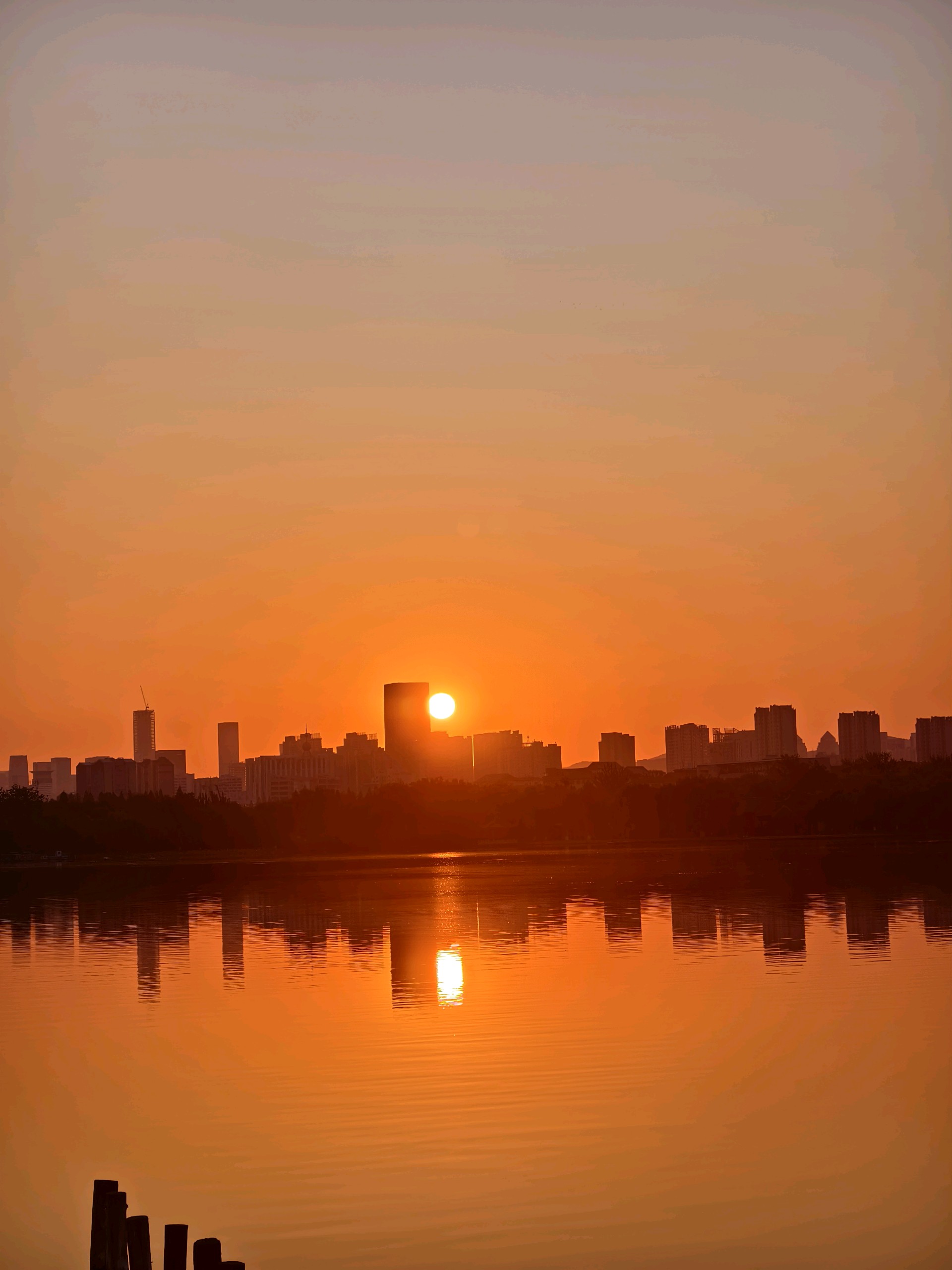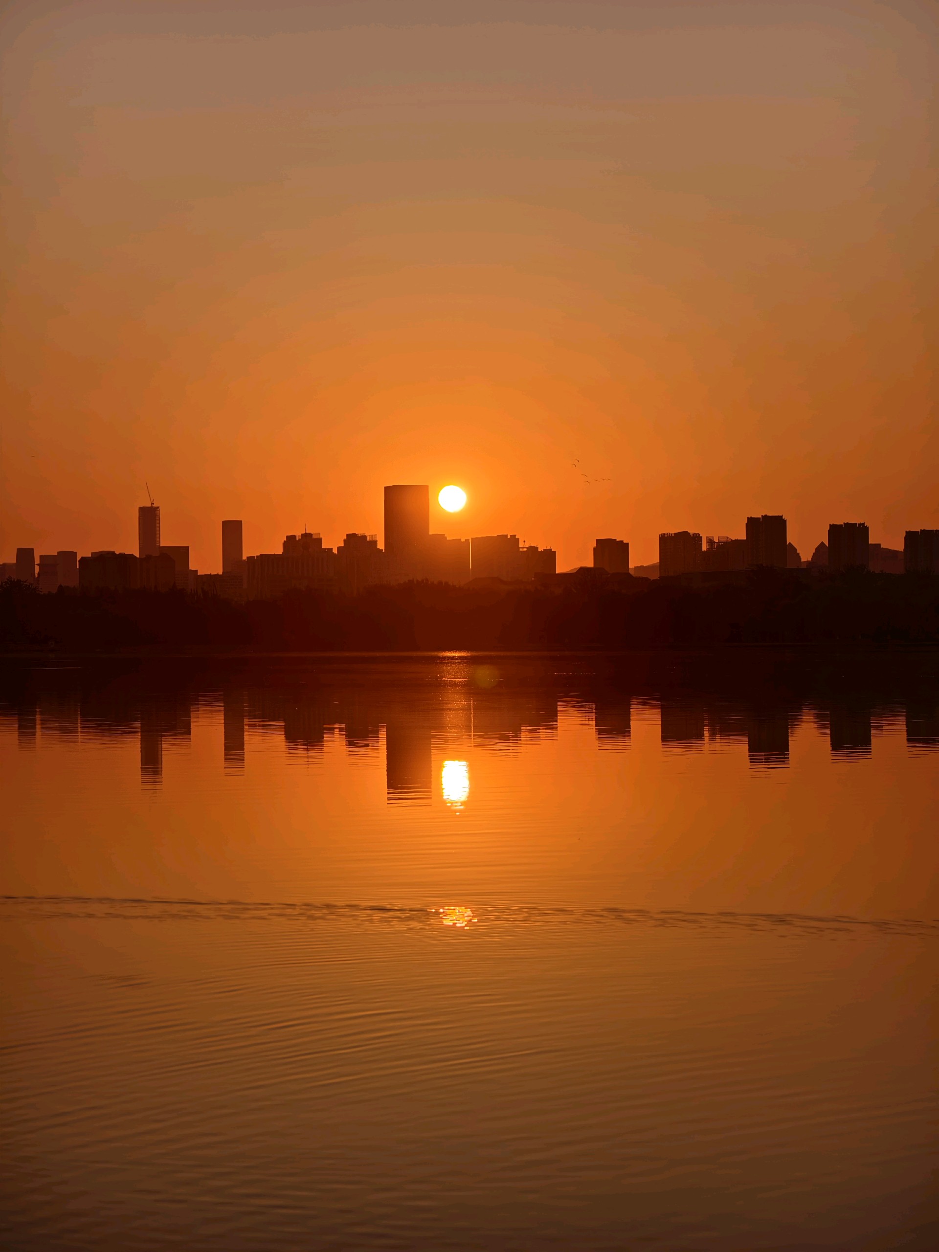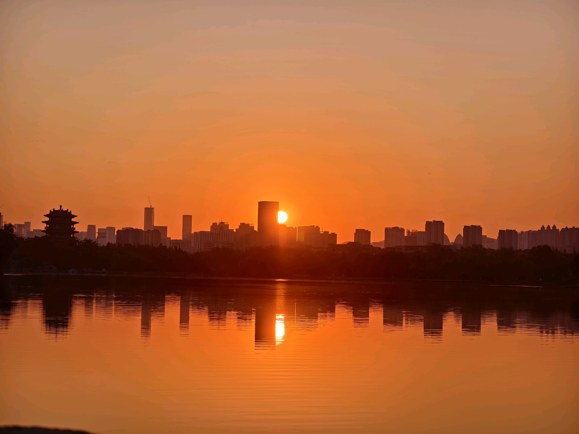 大明湖畔的晨光美景。新一轮的阳光冉冉升起,点亮了天际,倒映在平静的湖面上,水天一色,一片橘红。阳光洒在湖面,波光粼粼。高楼林立的城市剪影,鸟儿翱翔天际,平静的水面倒映着这一切,美得如同一幅画卷。