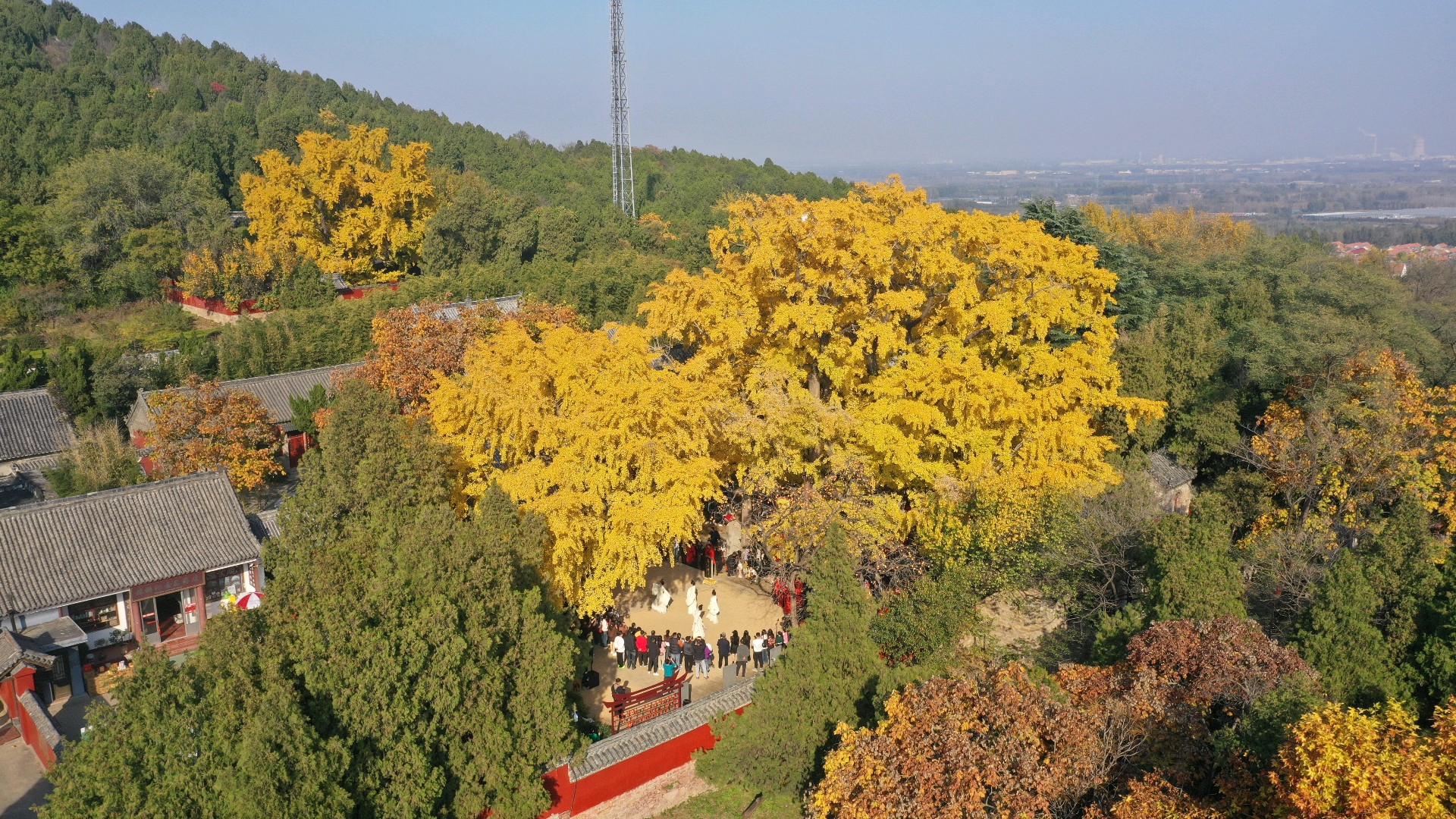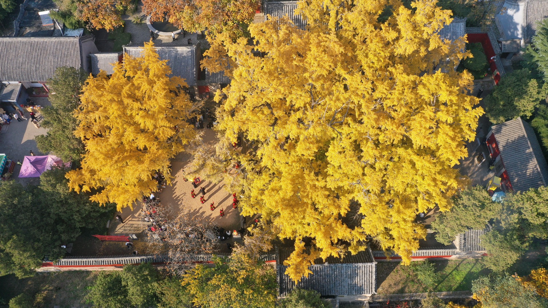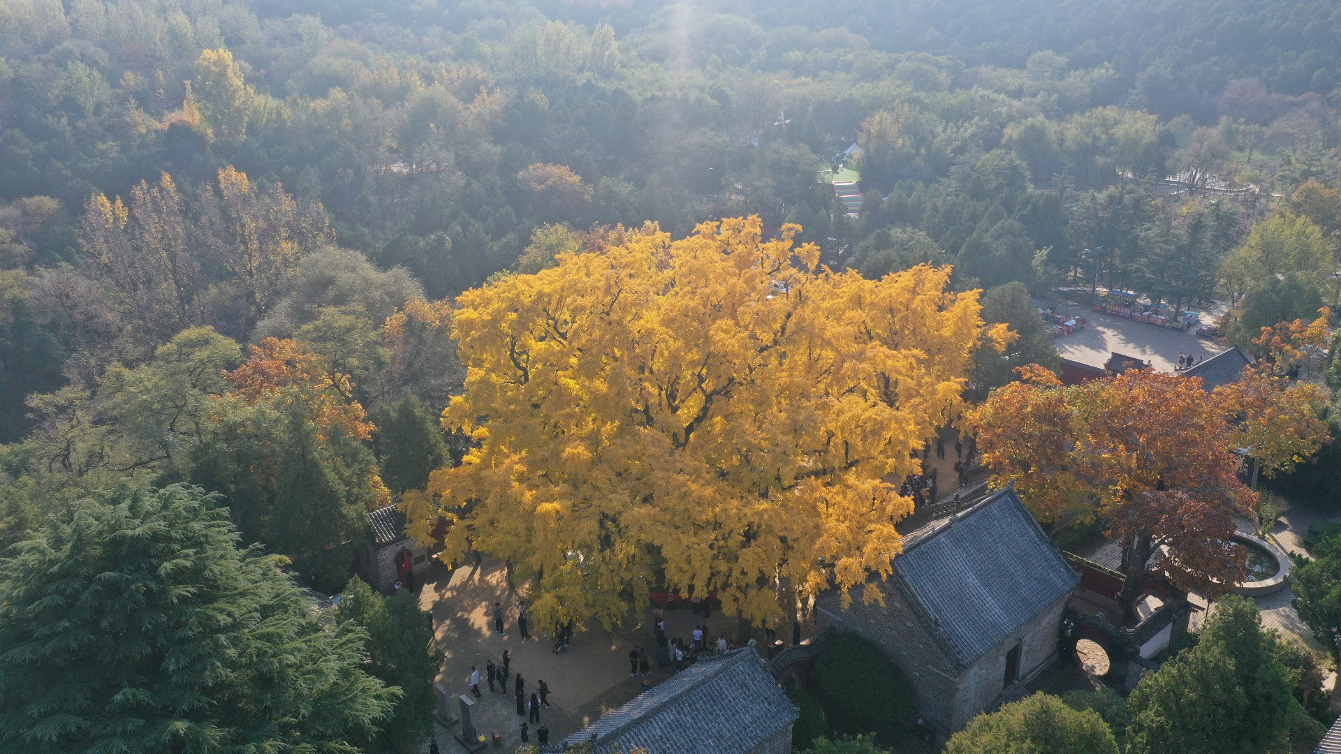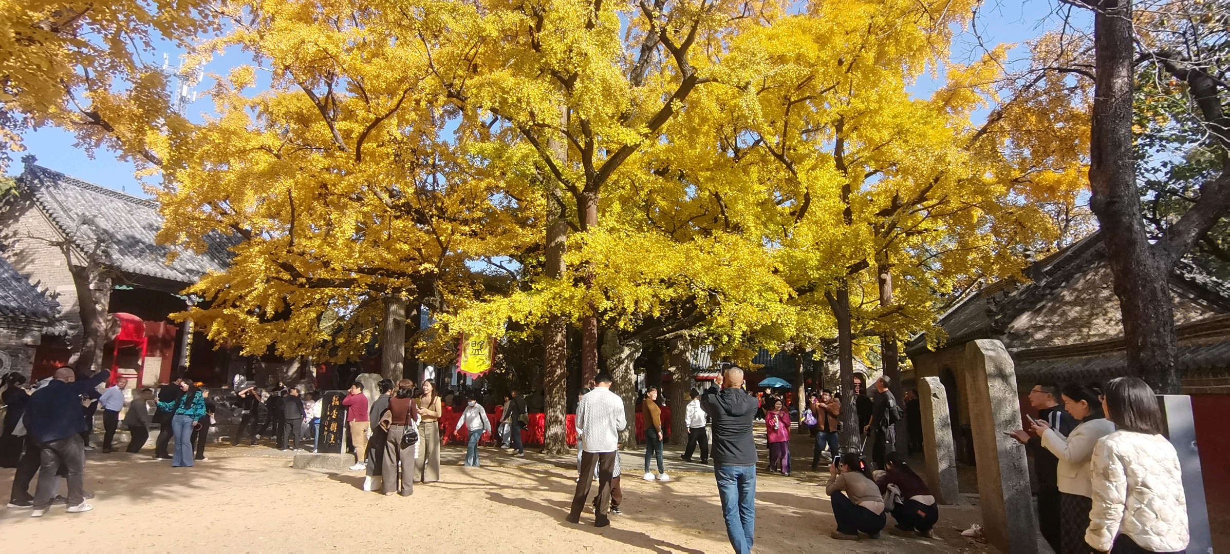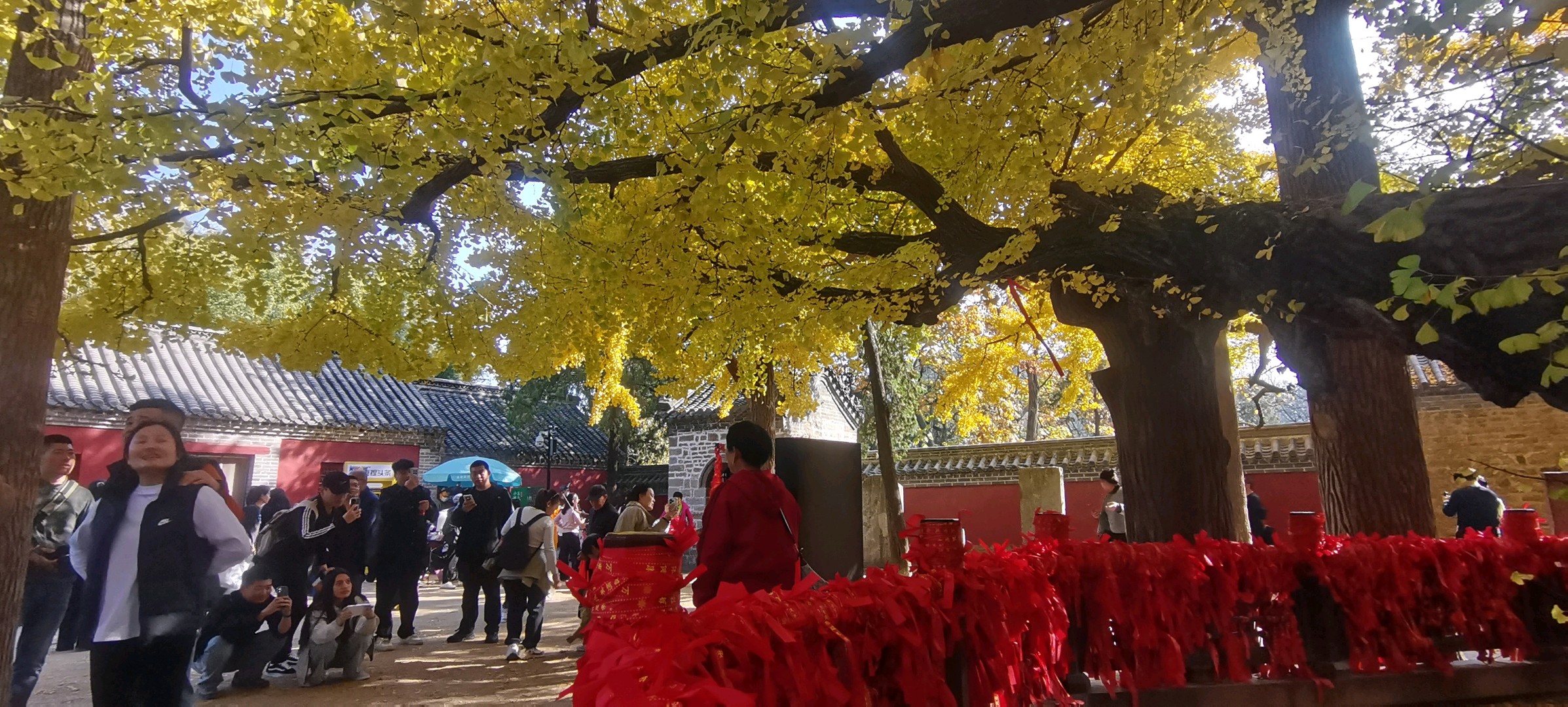 2025年11月5日,山东省日照市莒县浮来山景区人头攒动,游客们纷纷前来观赏这一年一度的壮观景象,在浮来山景区定林寺生长着一颗有着四千多年历史的古银杏树,金黄的银杏叶如同一片片金色的鳞甲覆盖住大树上煞是壮观。