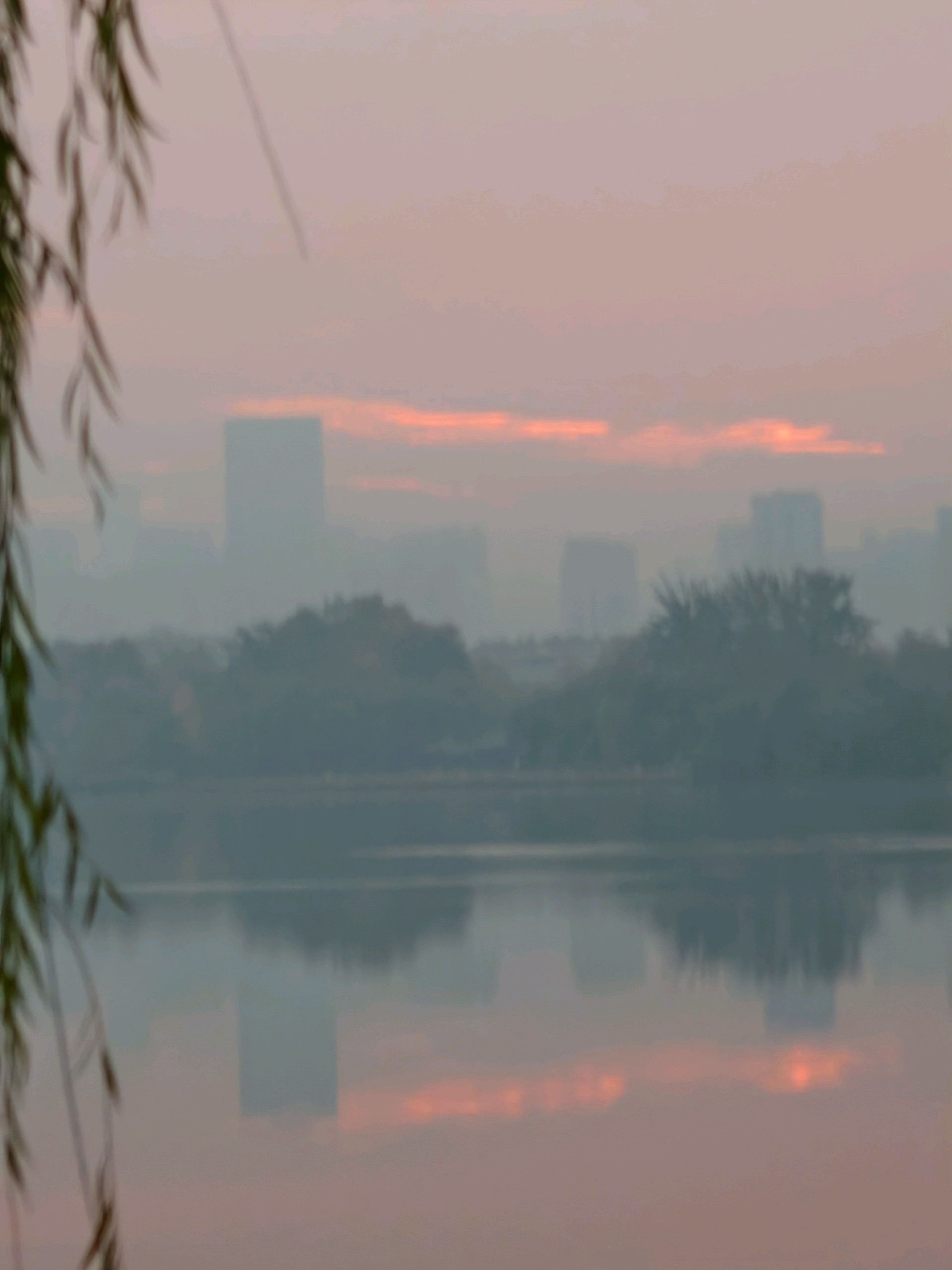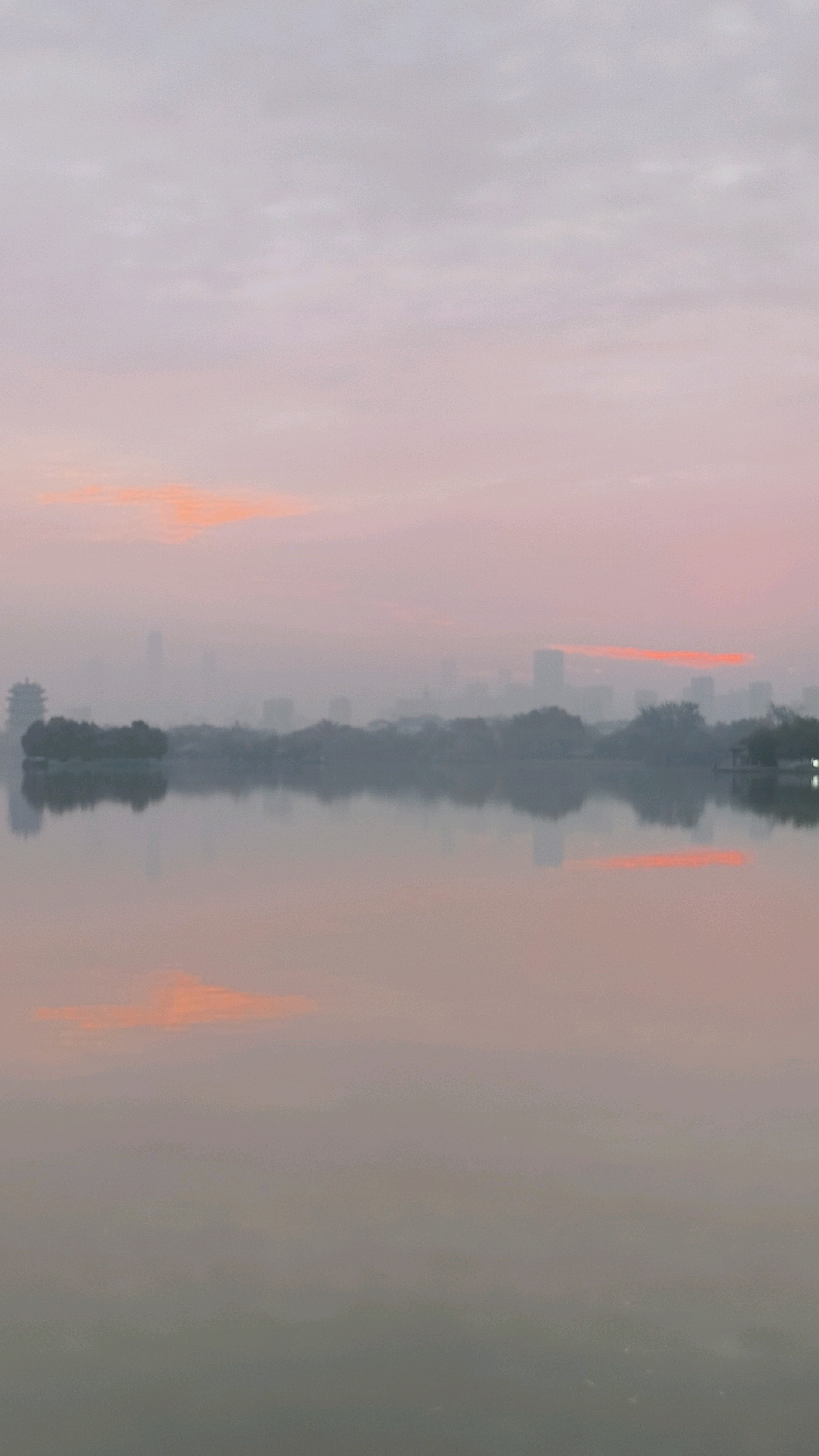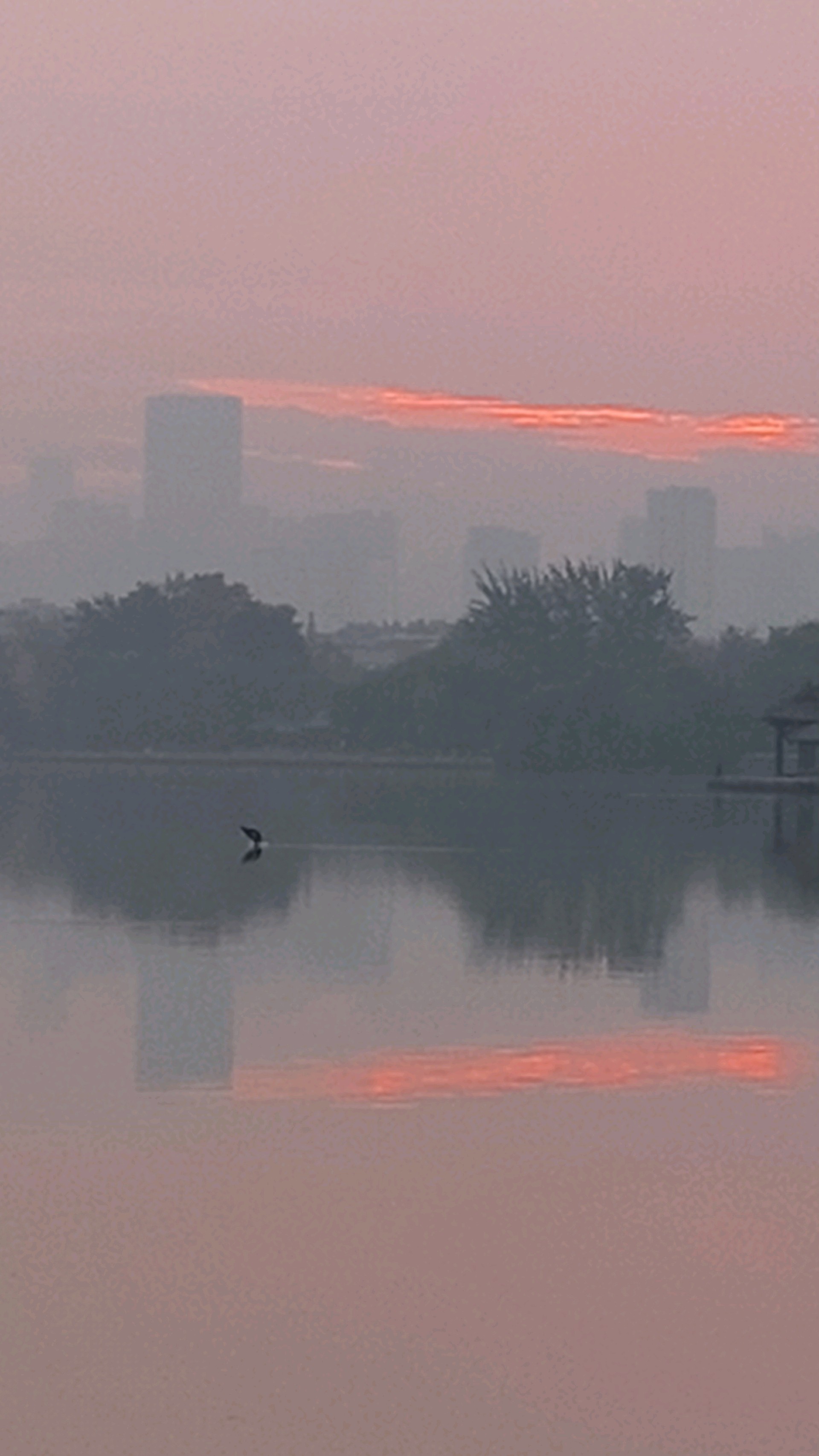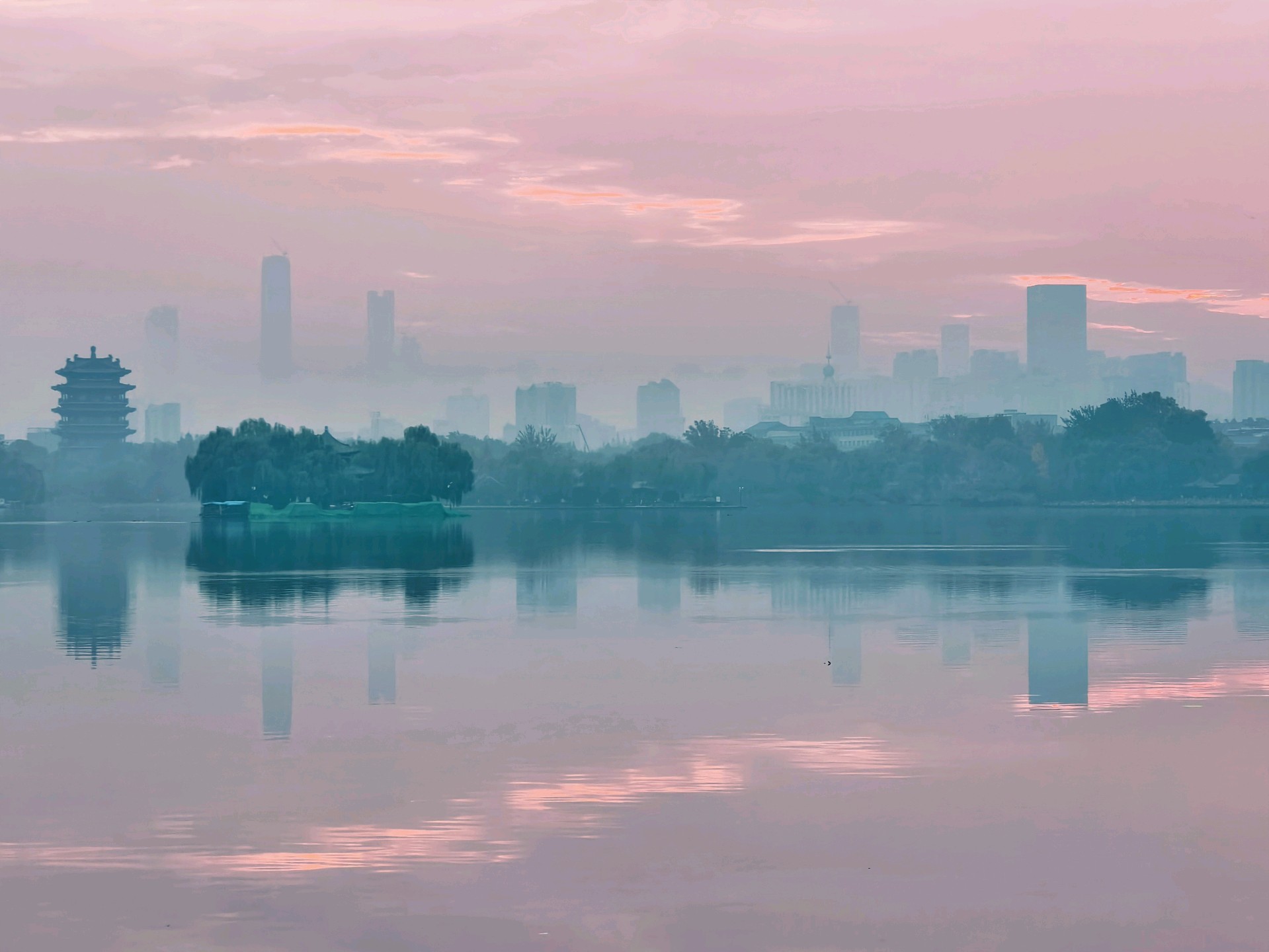 今天早上的大明湖畔,一缕红色的云霞挂在天际,倒映在静静的湖面上,湖水被晕染的绯红,美轮美奂。