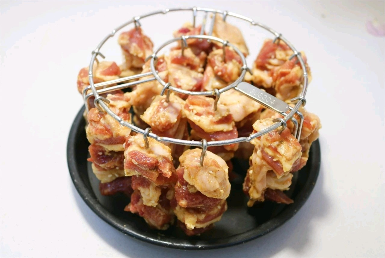 6、将腌好的羊肉串成串,全部挂在烤架上。