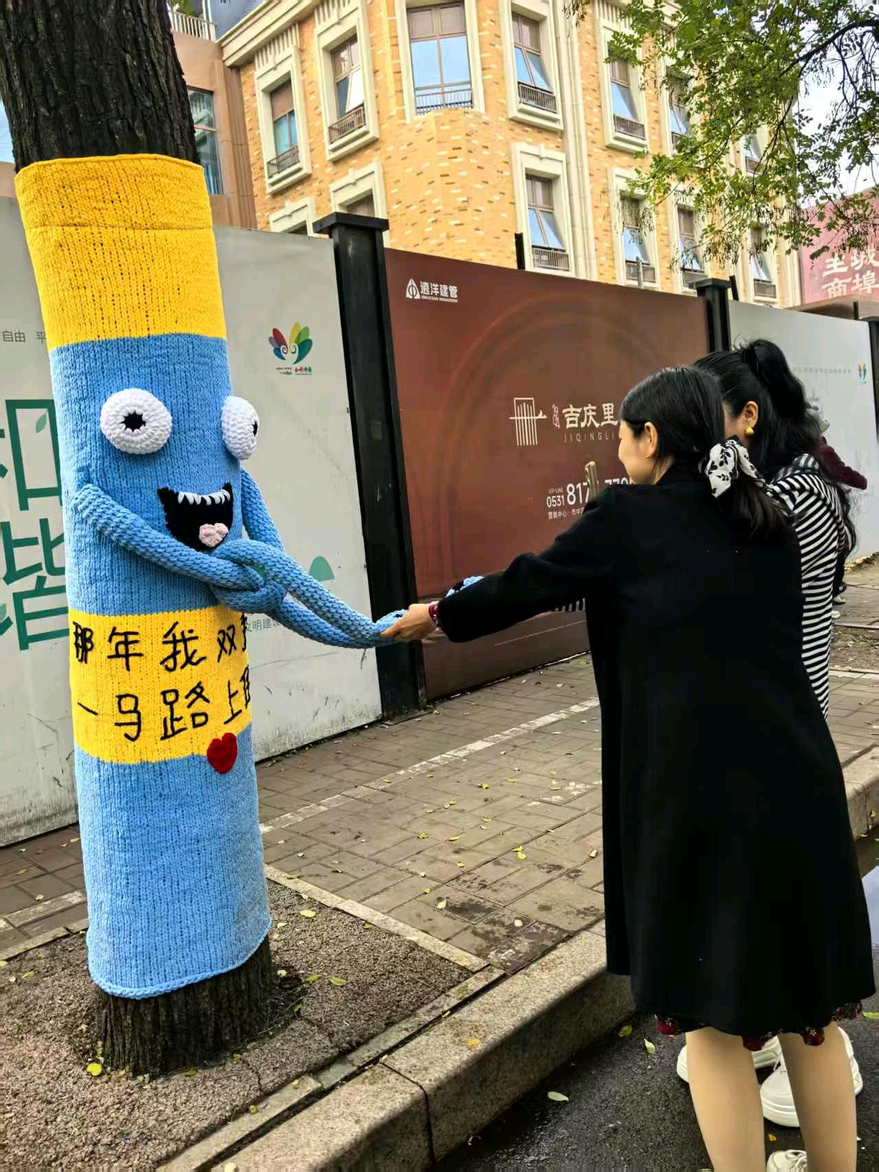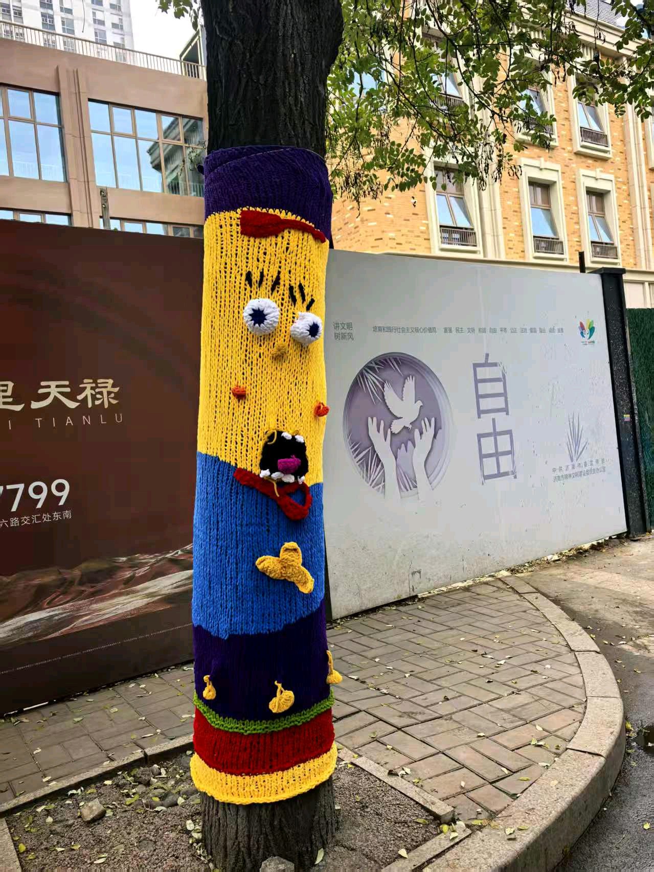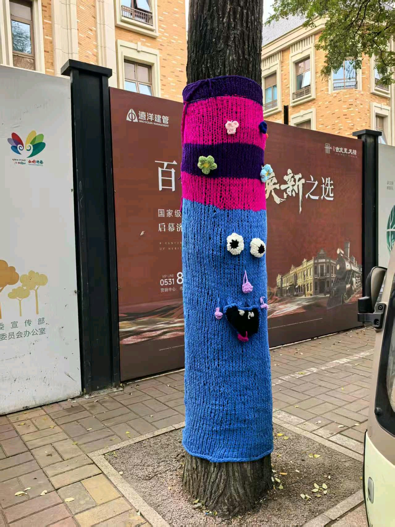 北侧经四路道路两旁的行道树一改冬日的萧瑟,纷纷“穿”上了五彩斑斓的手工“毛衣”。这些用毛线精心编织的树衣不仅保暖,更被赋予了各种可爱的表情与图案,成为一道充满创意与温情的独特街景,让整条街道都焕发