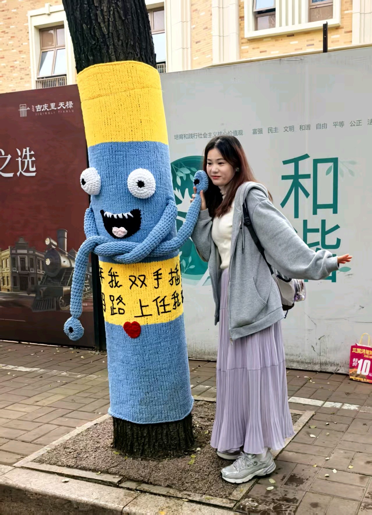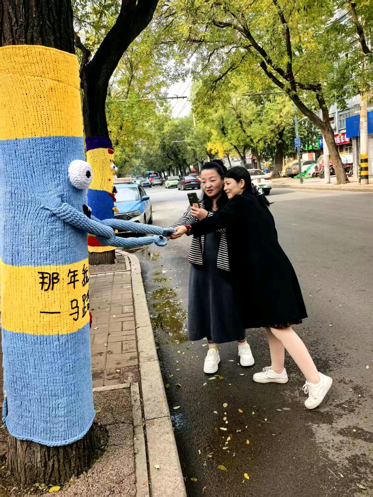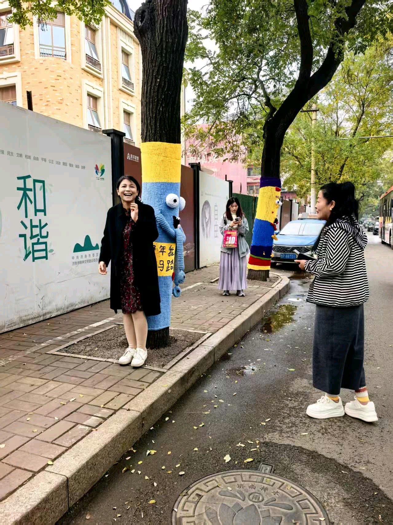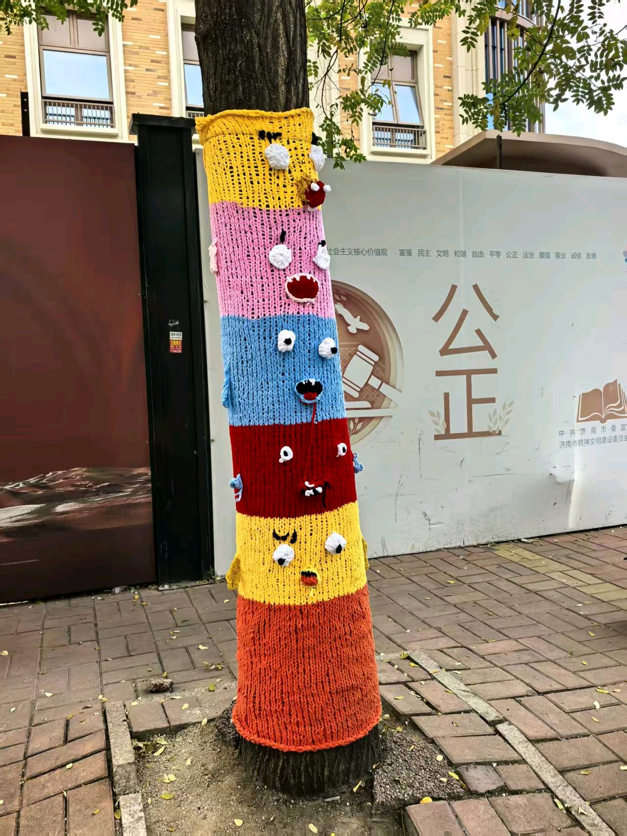 北侧经四路道路两旁的行道树一改冬日的萧瑟,纷纷“穿”上了五彩斑斓的手工“毛衣”。这些用毛线精心编织的树衣不仅保暖,更被赋予了各种可爱的表情与图案,成为一道充满创意与温情的独特街景,让整条街道都焕发