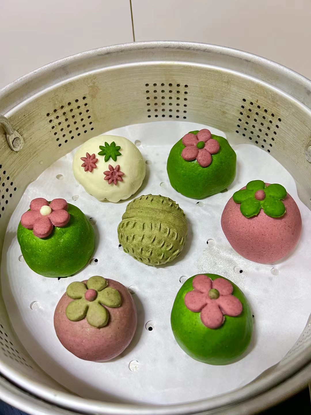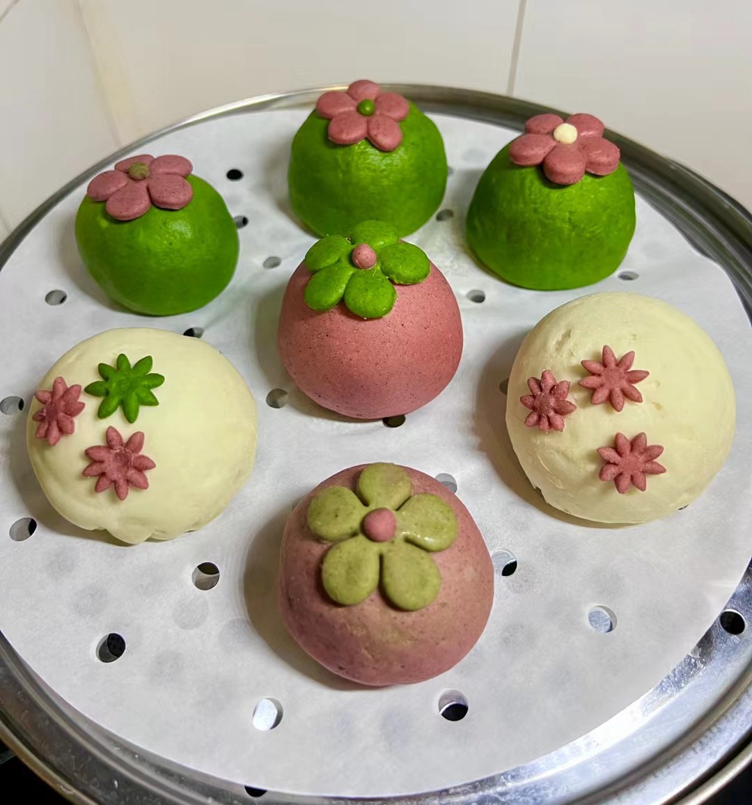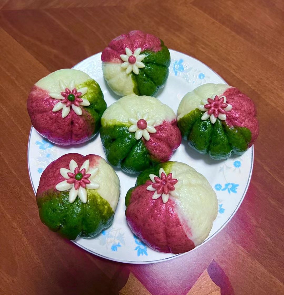 #壹粉食堂#今天蒸了一锅彩色豆沙包,分别用菠菜泥、红曲米粉加酵母粉和面,包上红豆馅造型随意设计。都做好后冷水上锅醒发至蓬松,大火烧开转中火蒸15分钟,关火再焖5分钟即可出锅。好看又好吃的花样豆沙包就做好了