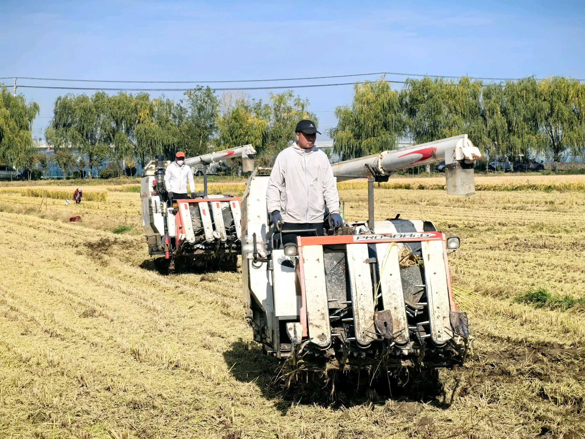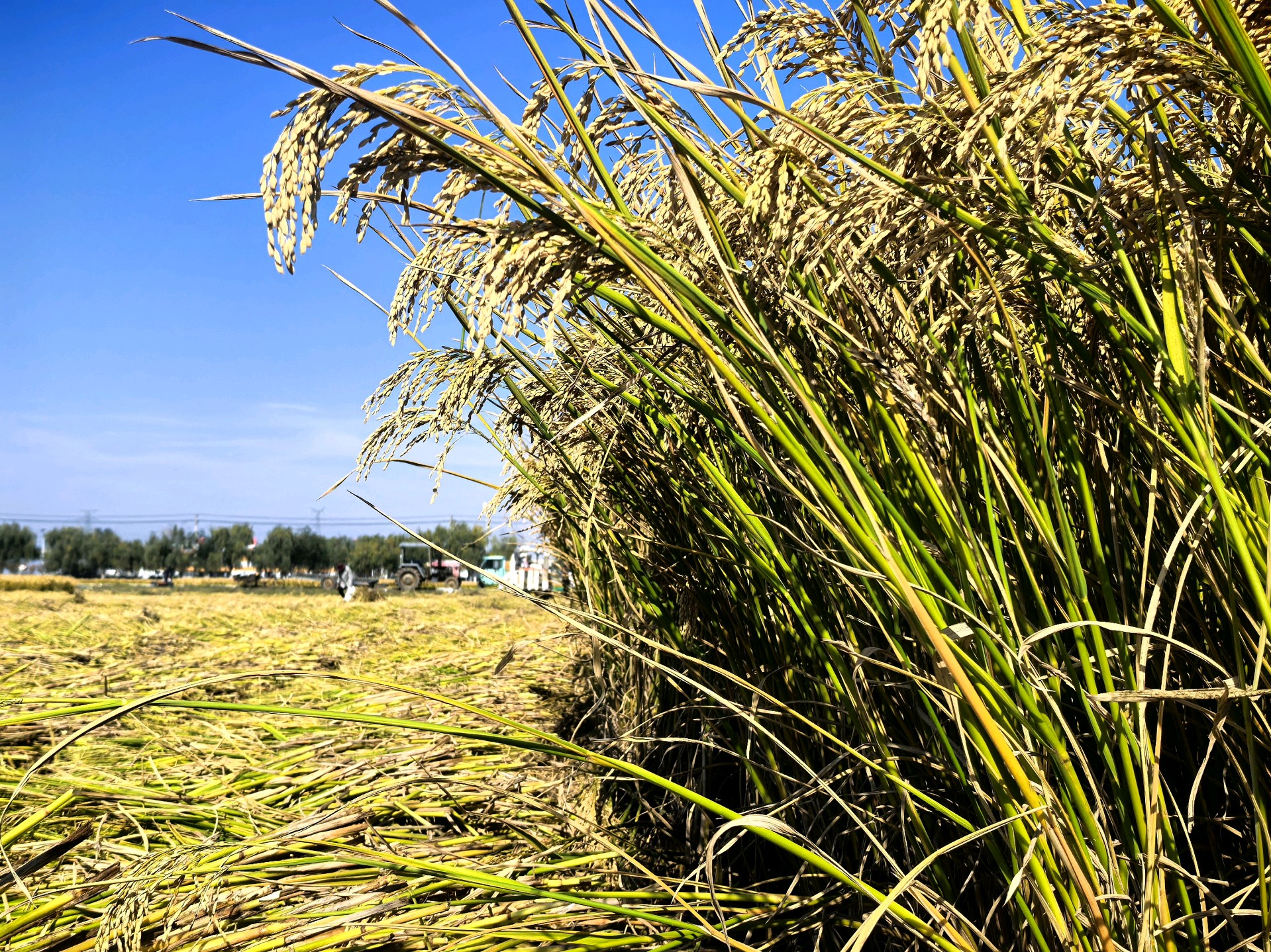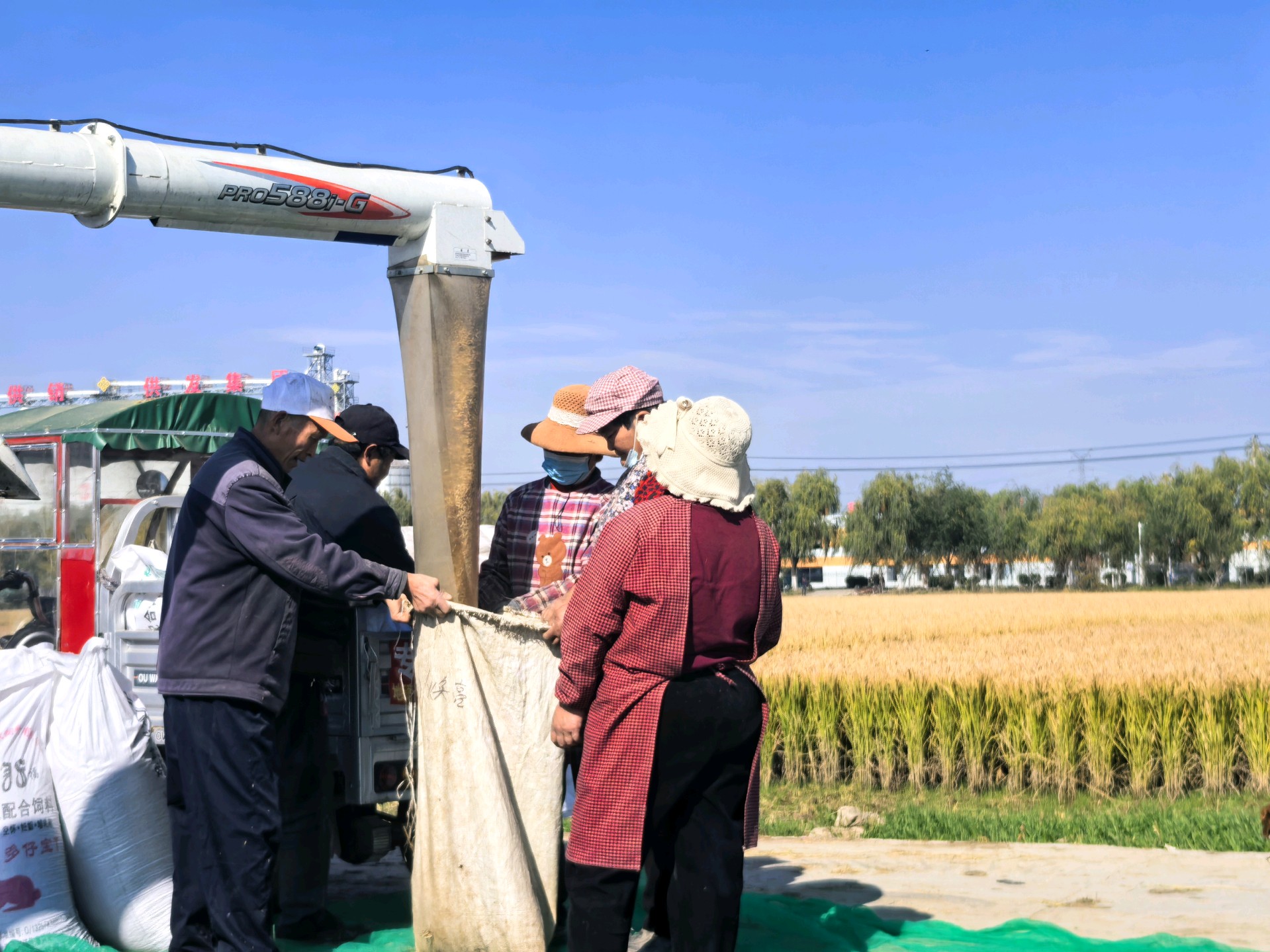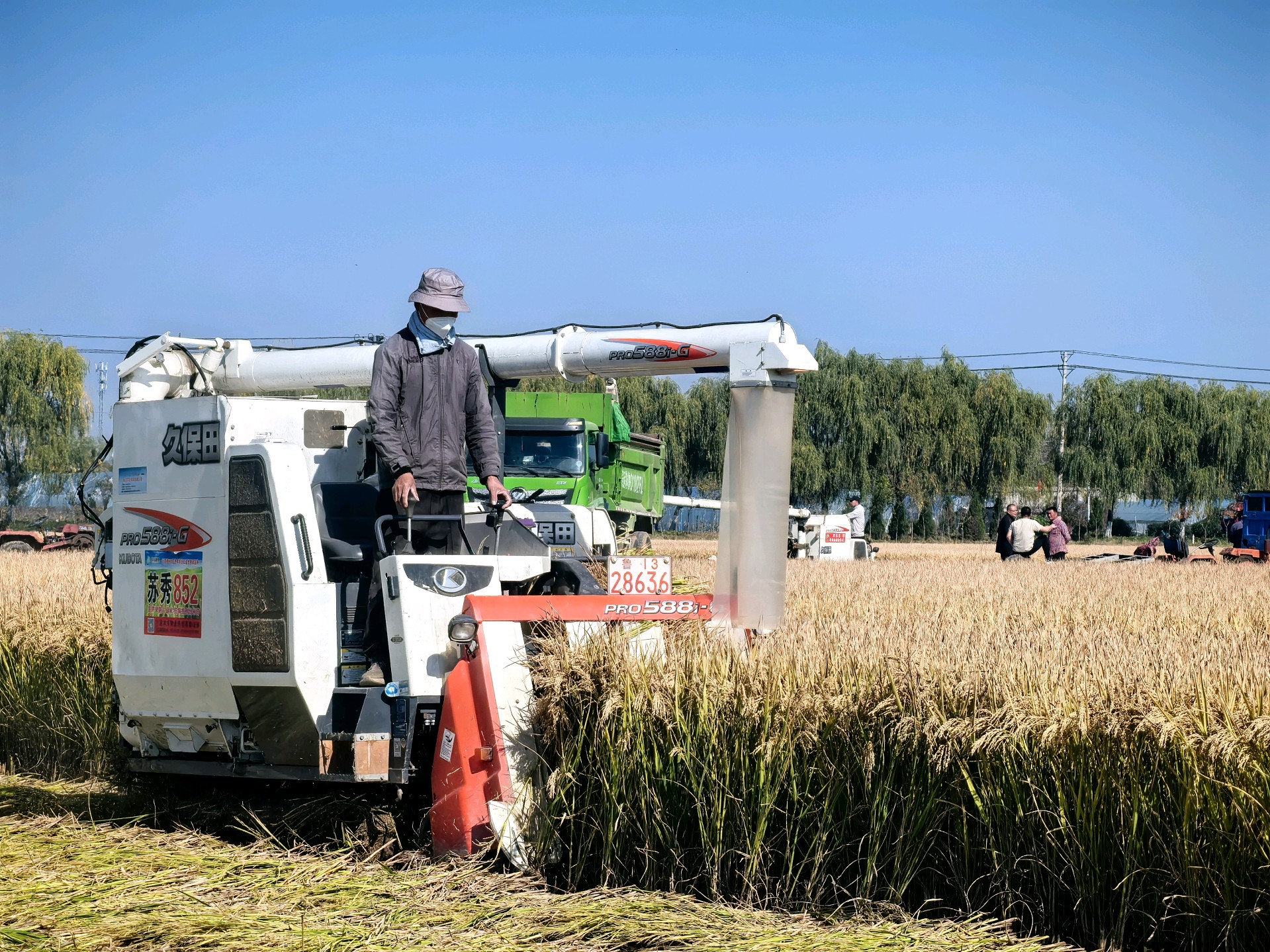 金黄稻穗低垂,丰收的季节在田野里低语。初冬时节,天气晴朗,农民趁机抢收稻谷,做到颗粒归仓。