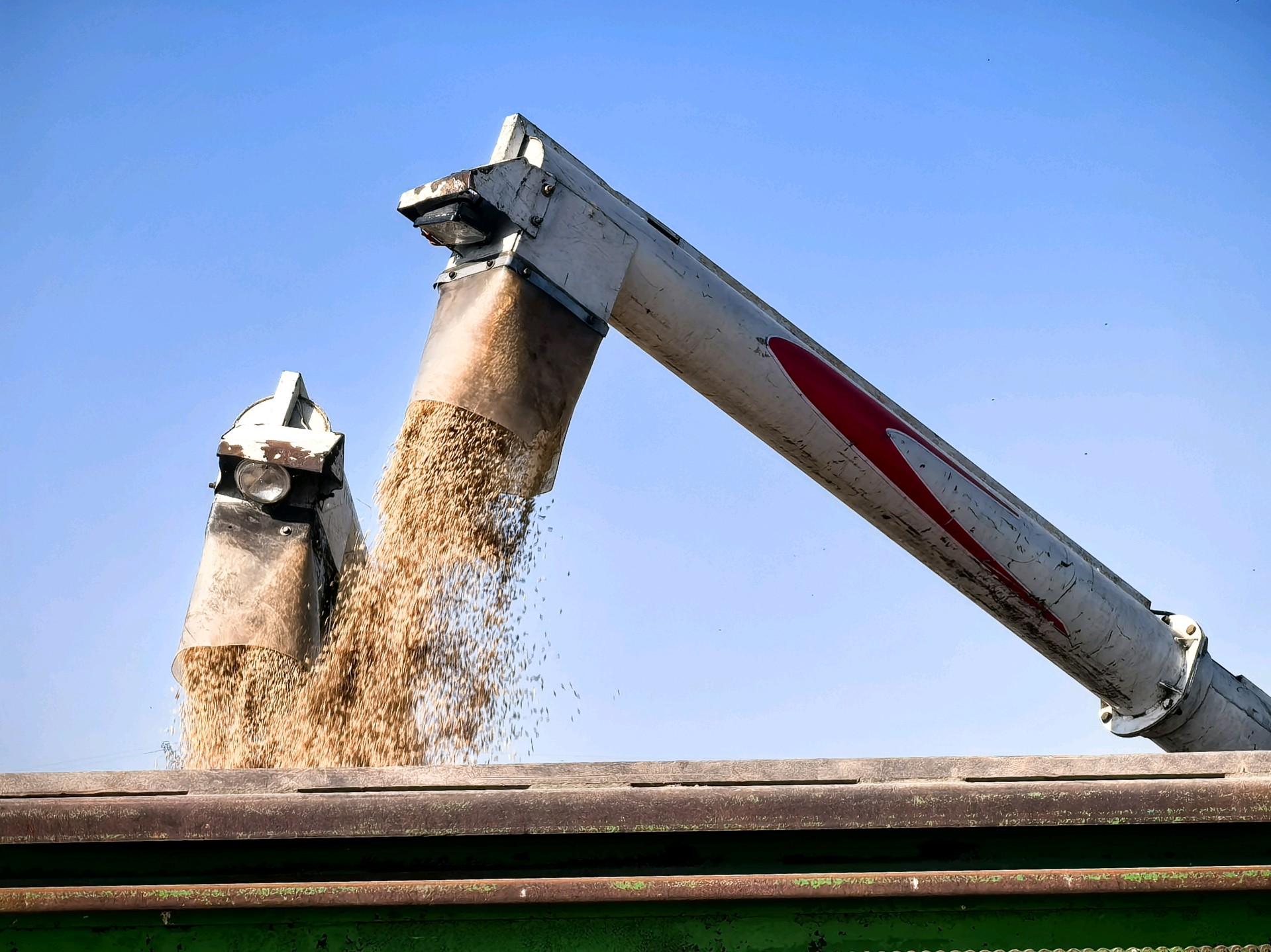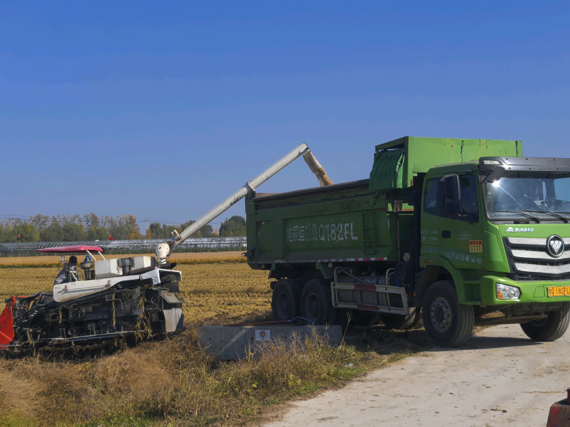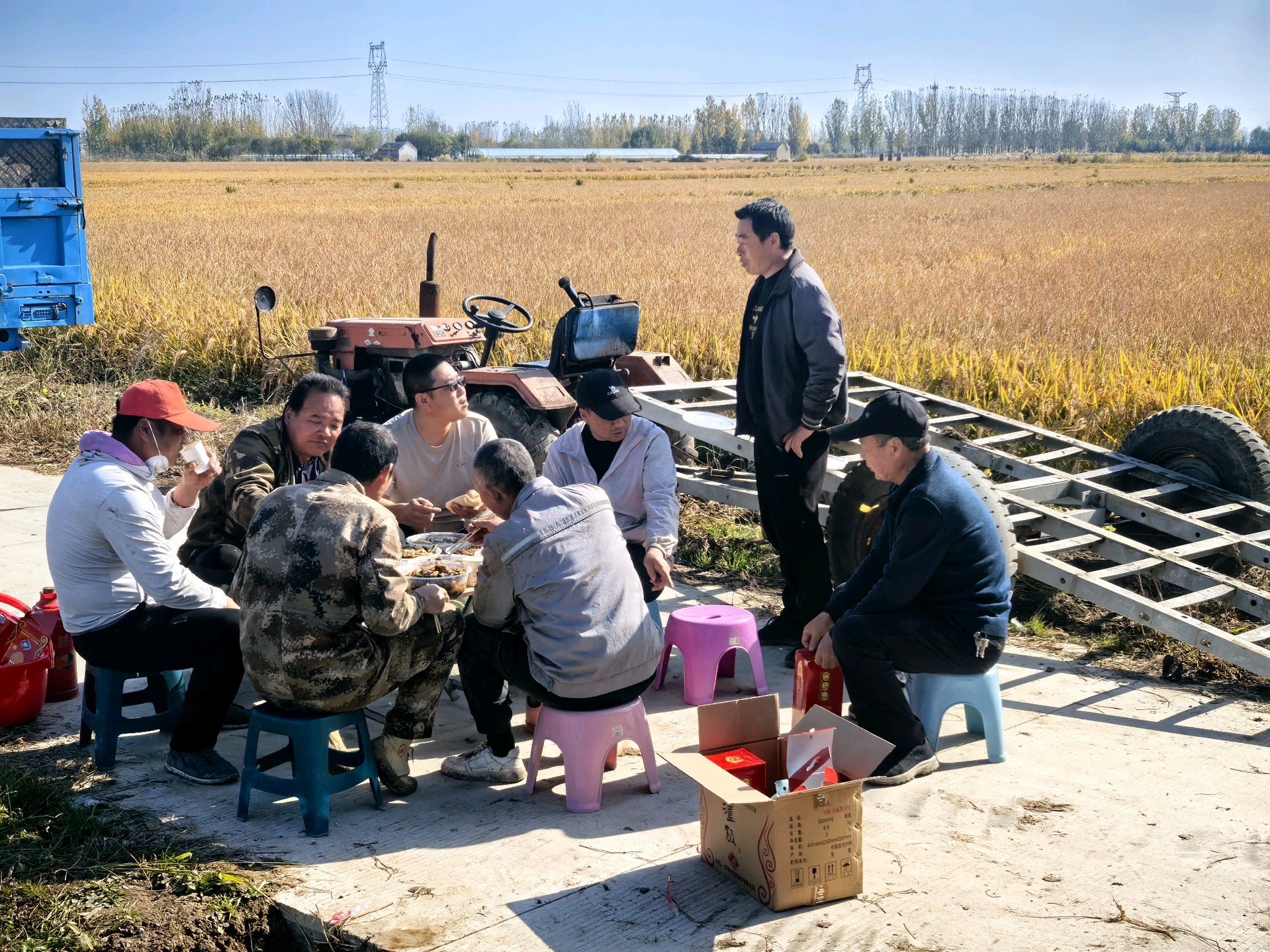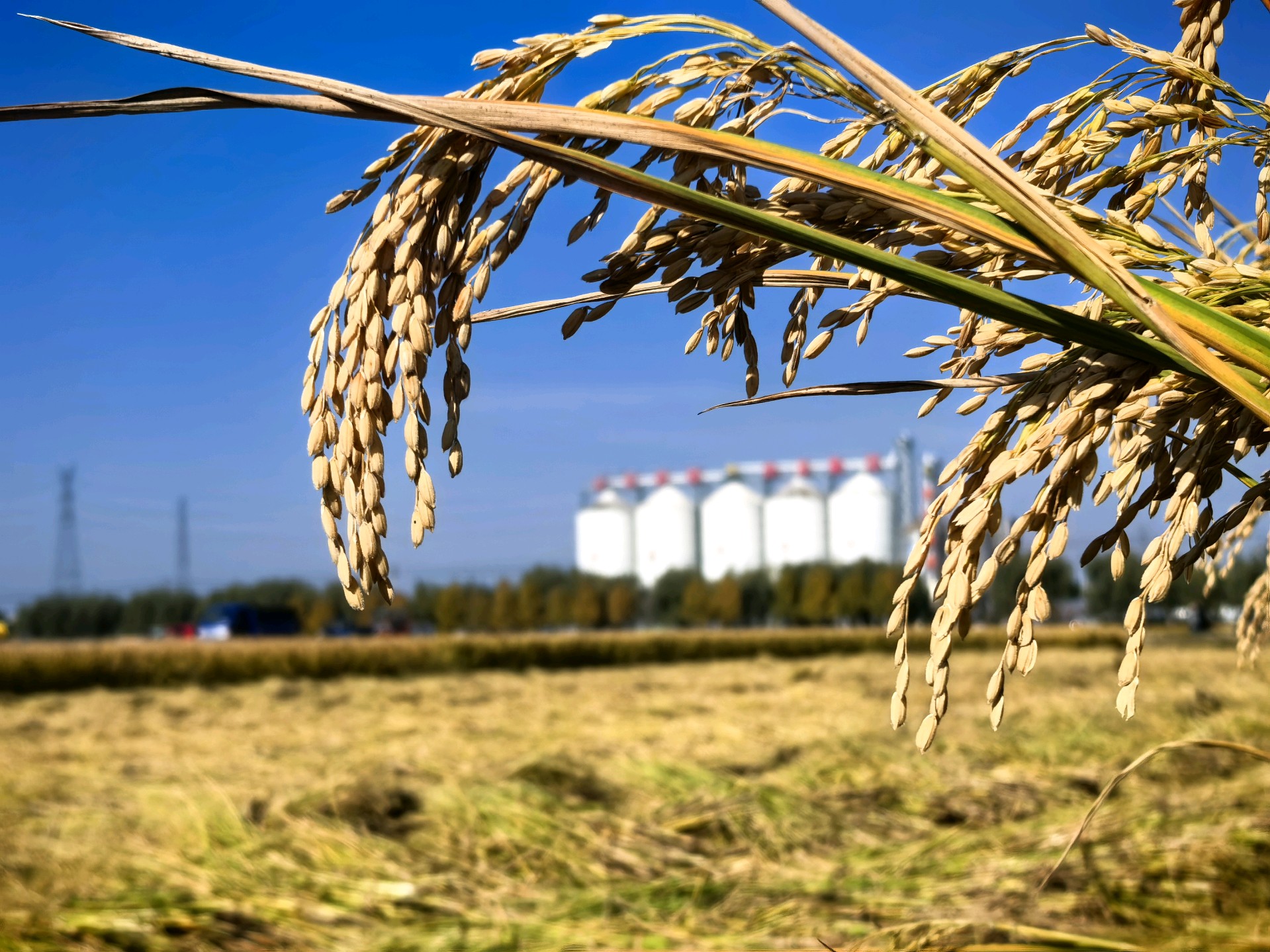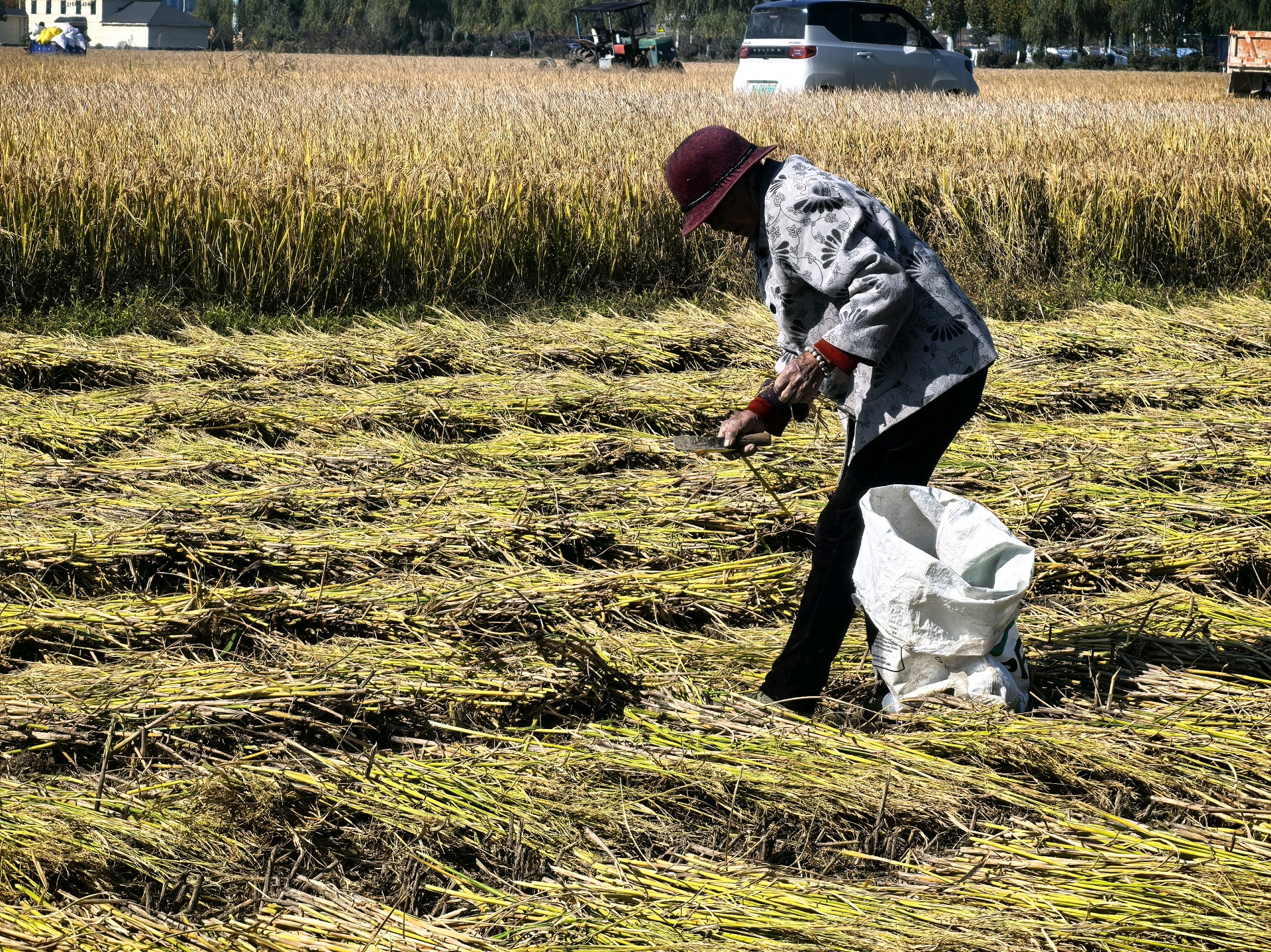 金黄稻穗低垂,丰收的季节在田野里低语。初冬时节,天气晴朗,农民趁机抢收稻谷,做到颗粒归仓。