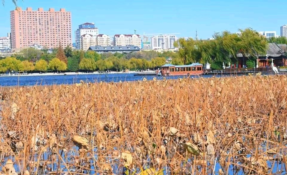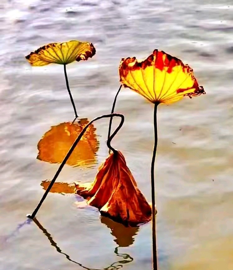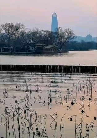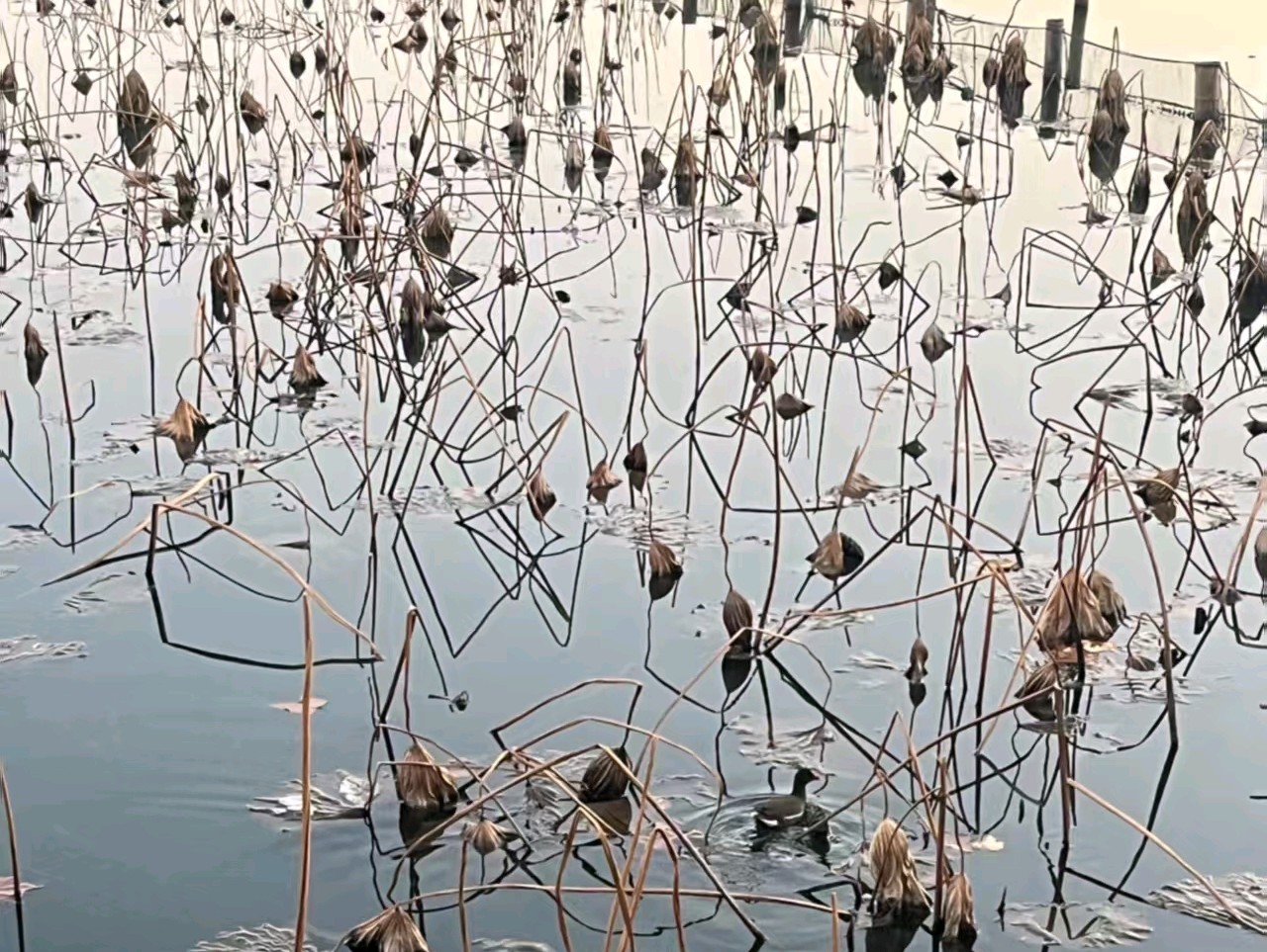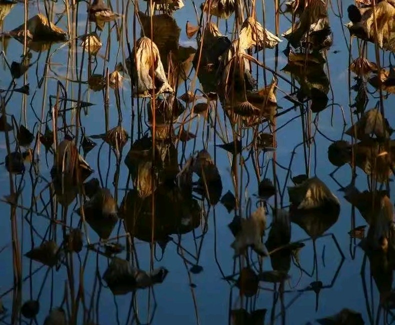 乙巳初冬,独步大明湖荷塘之畔。见满池翠盖尽为霜风所夺,唯余铁色枯茎,危然蜷叶,于寒波中傲然挺立,如旗如戟。