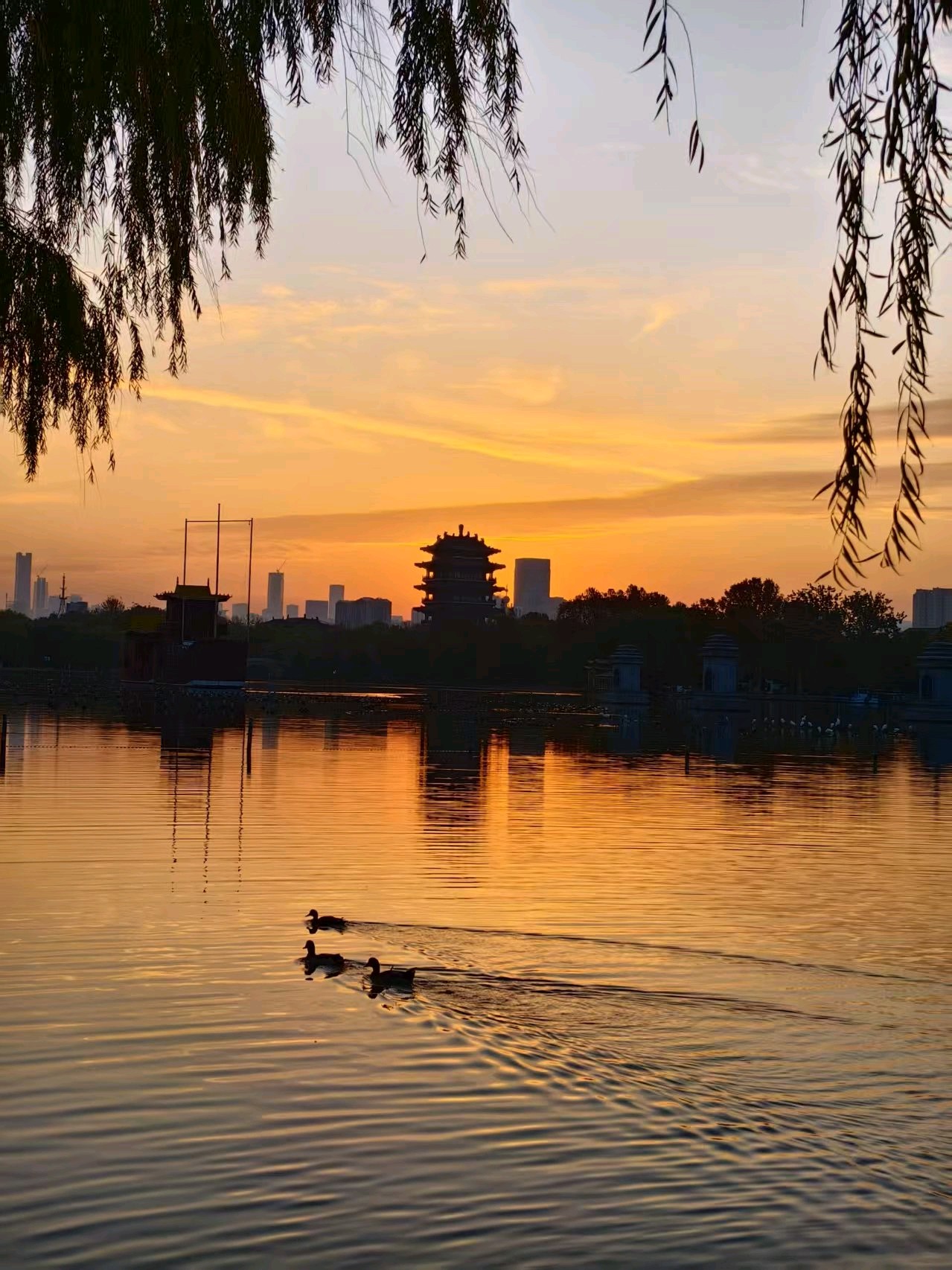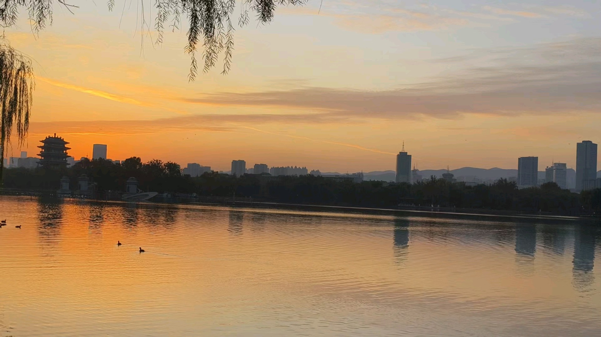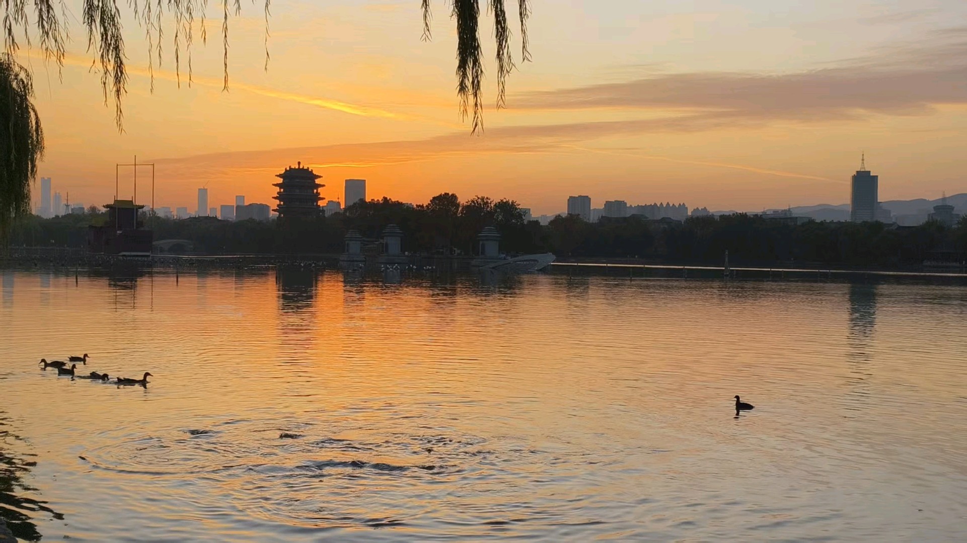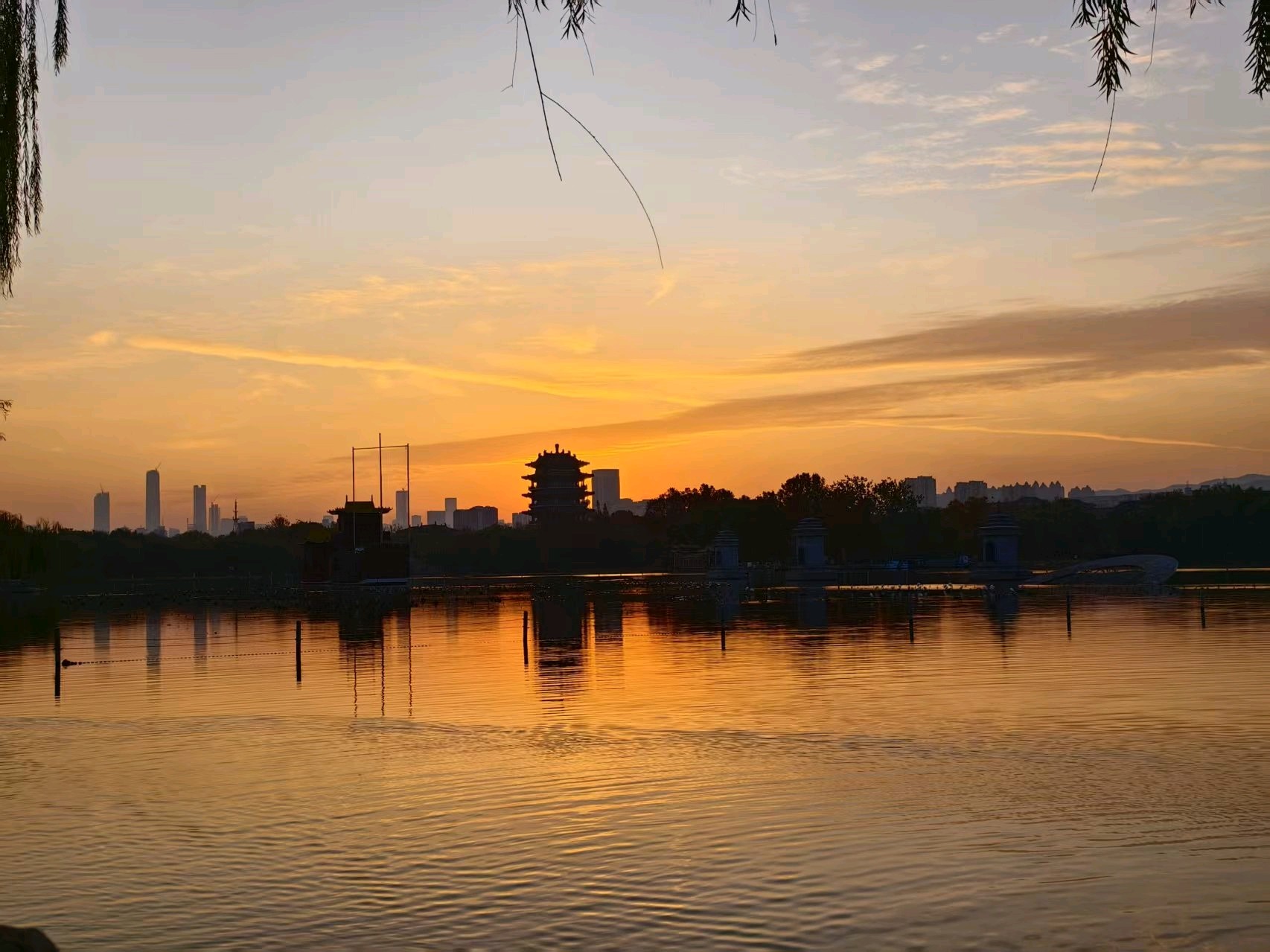 大明湖畔的晨光美景,晨光微露,霞光满天。城市轮廓逐渐显现,高楼大厦被晨晖包裹其中,湖面平静如镜,倒映着城市的繁华与宁静。水天一色,美轮美奂。