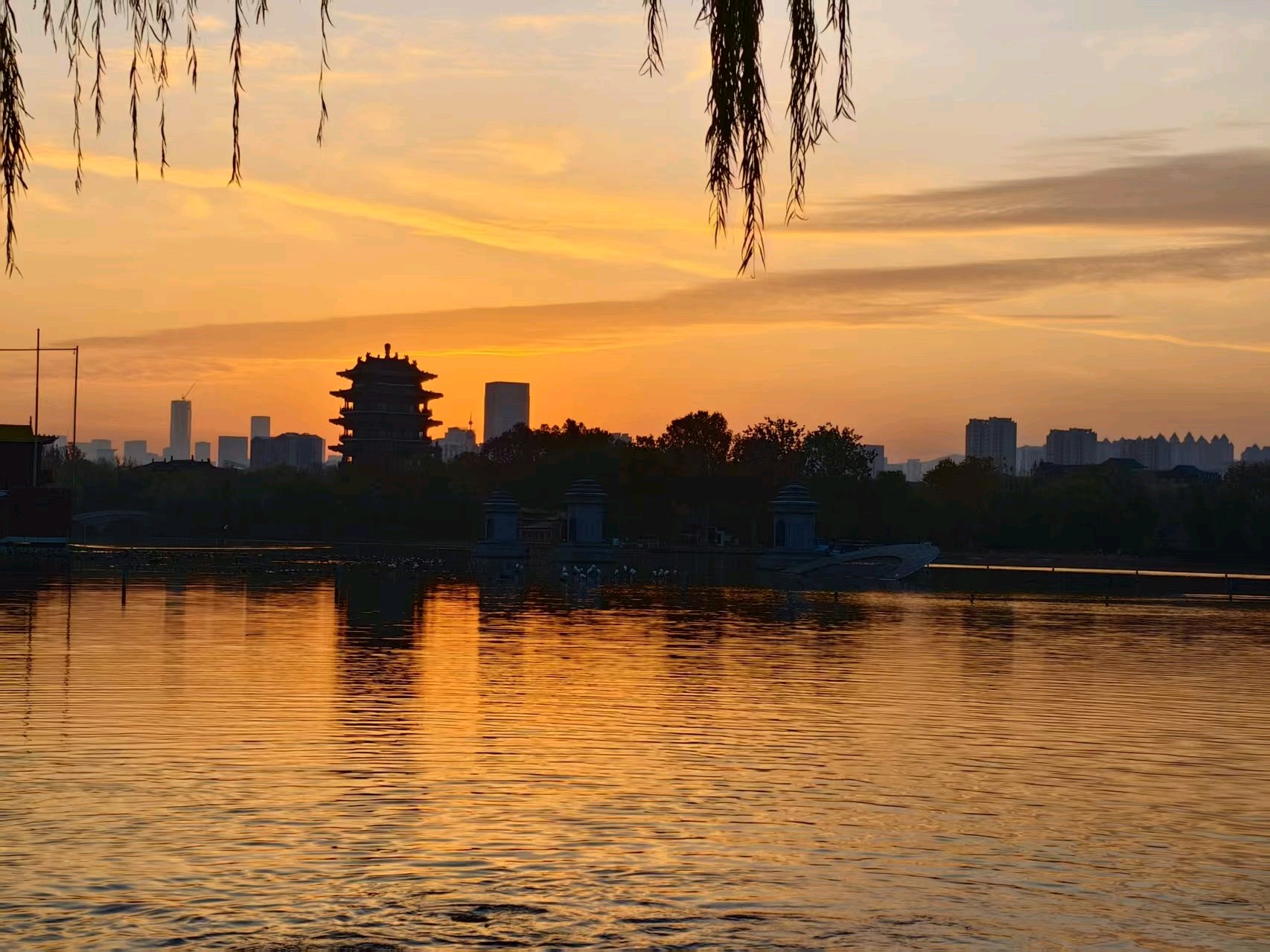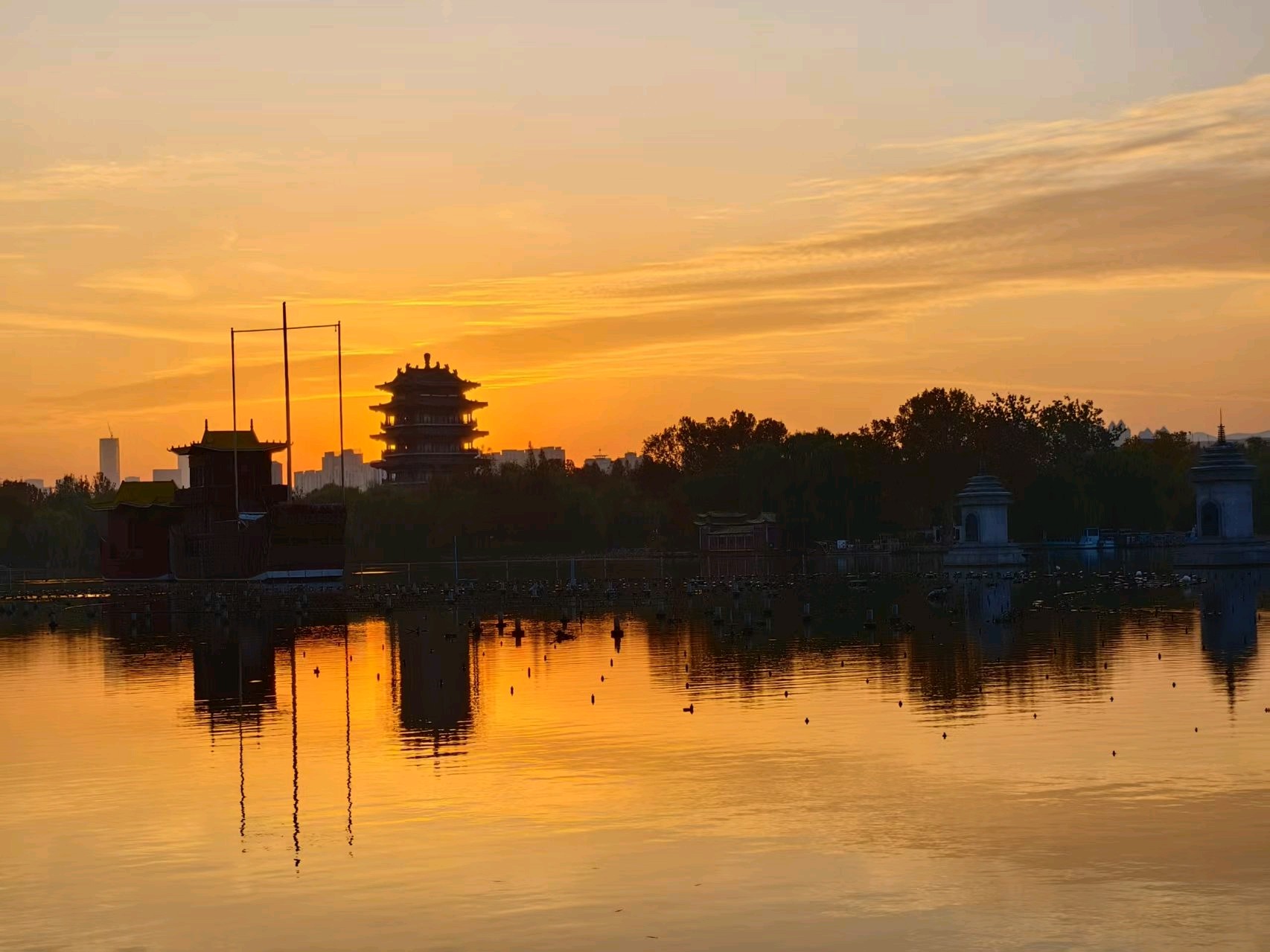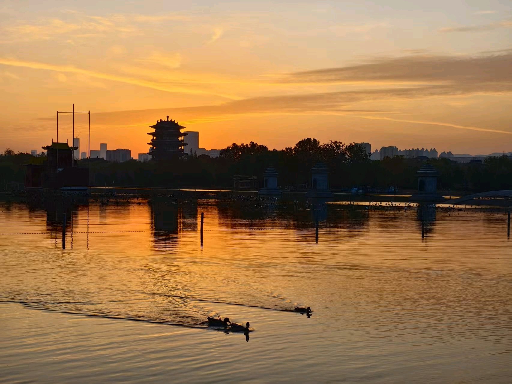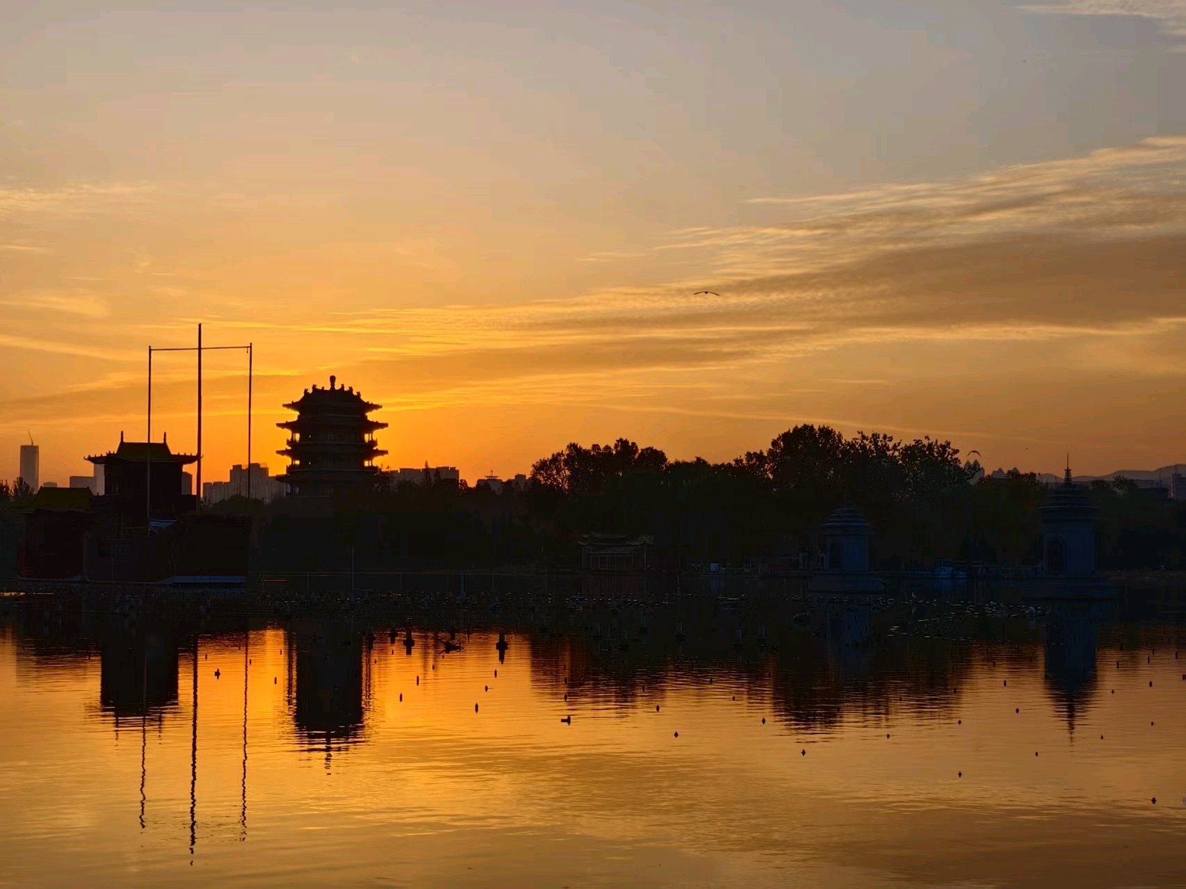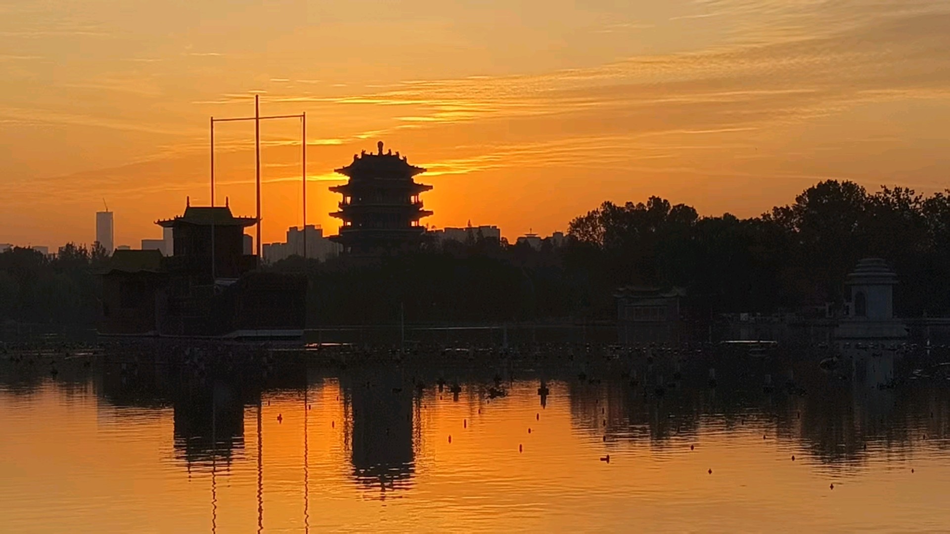 大明湖畔的晨光美景,晨光微露,霞光满天。城市轮廓逐渐显现,高楼大厦被晨晖包裹其中,湖面平静如镜,倒映着城市的繁华与宁静。水天一色,美轮美奂。