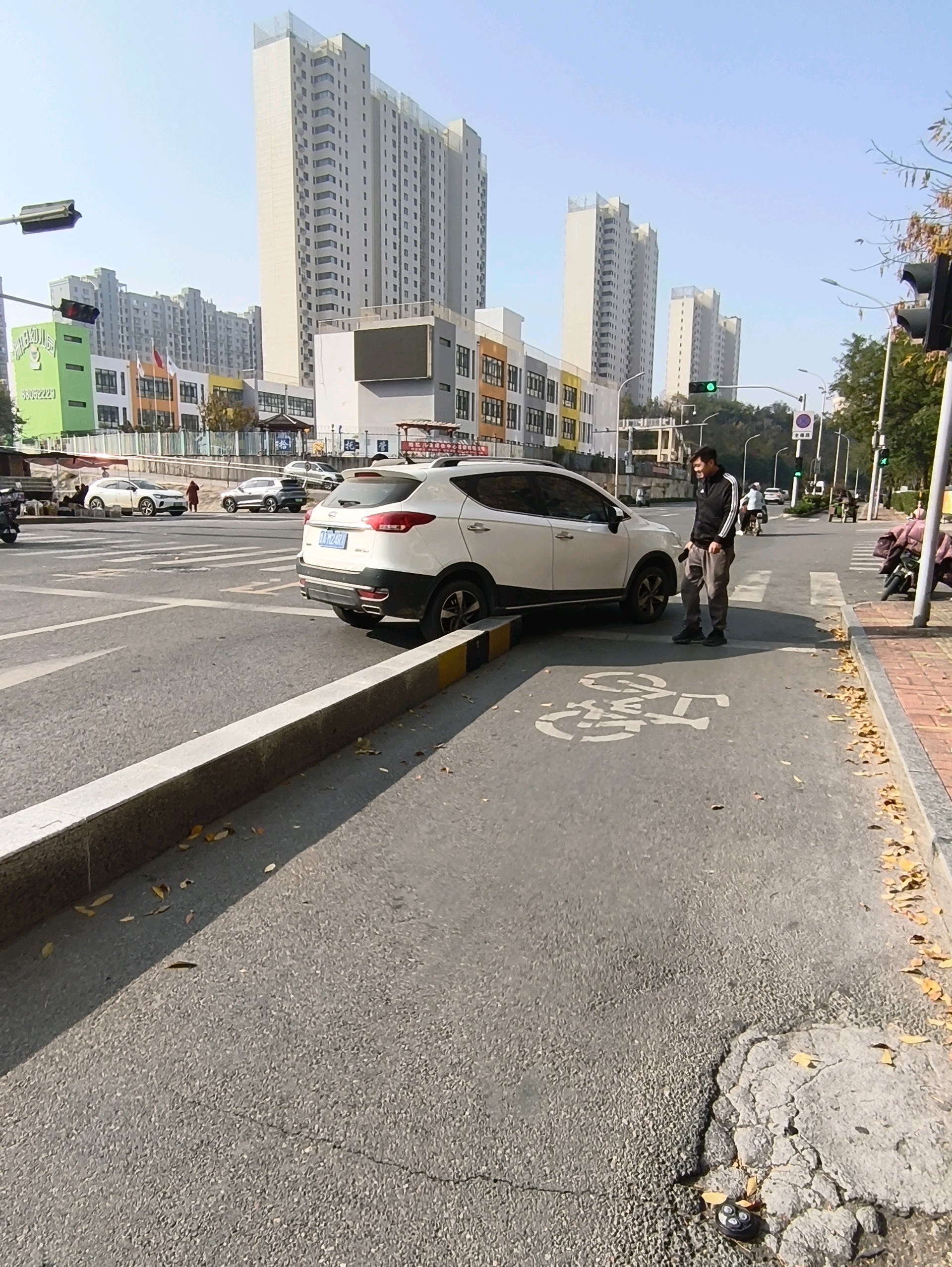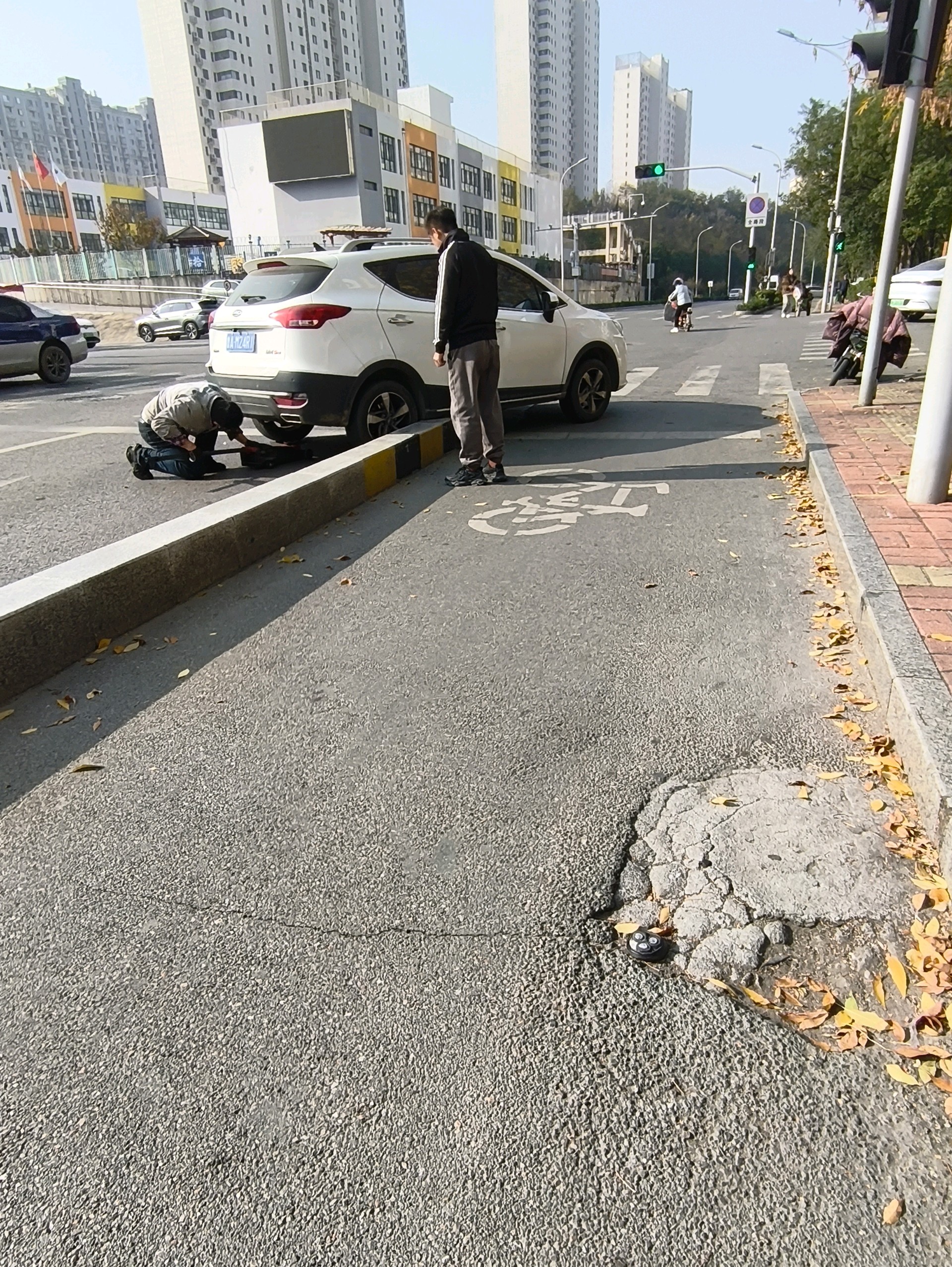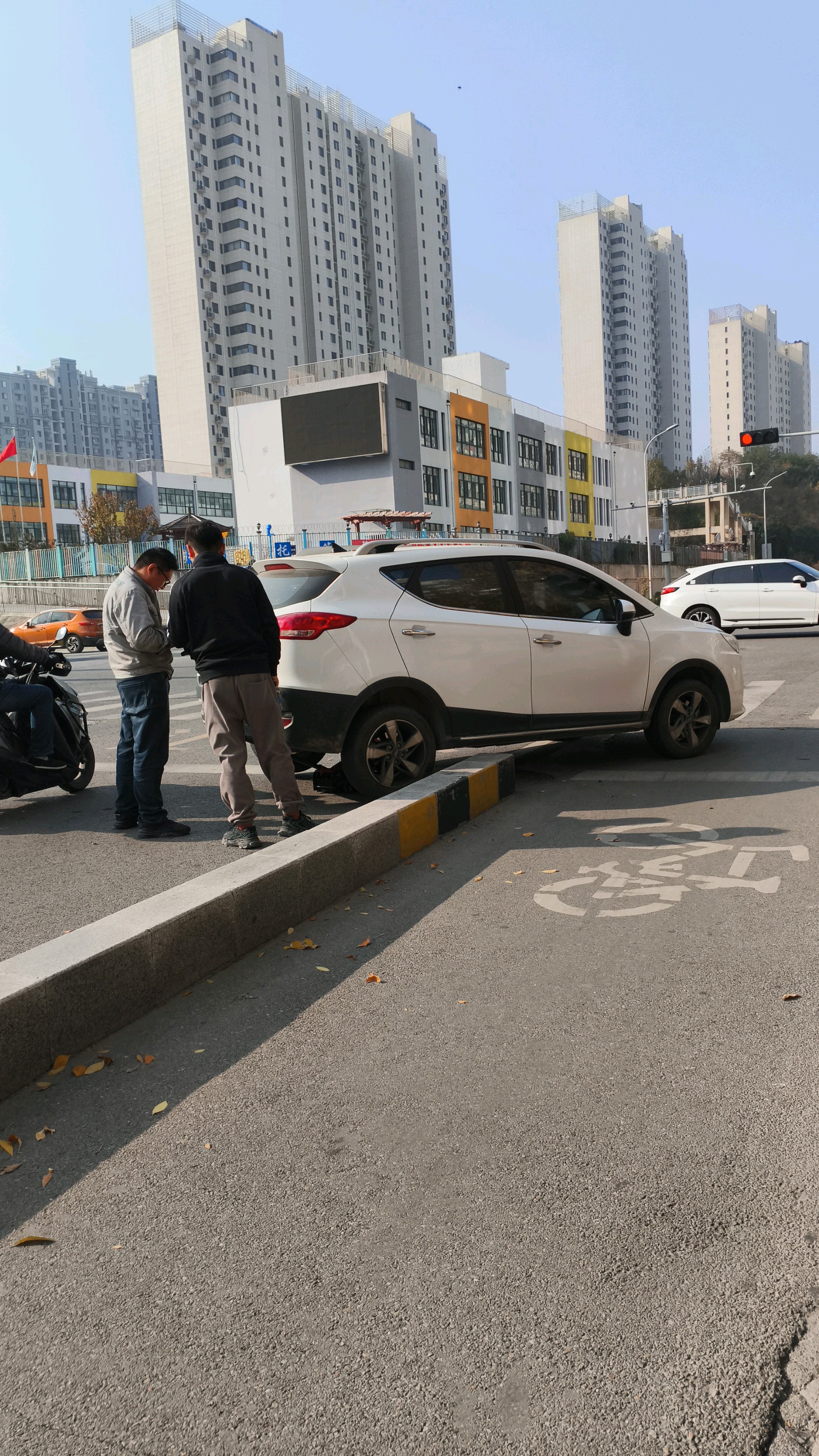 刘长山路阳光100小学西北路口,一辆汽车开到马路牙子上了,救援人员正在处理,过往车辆注意避让……