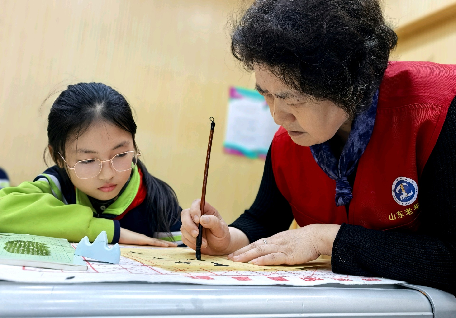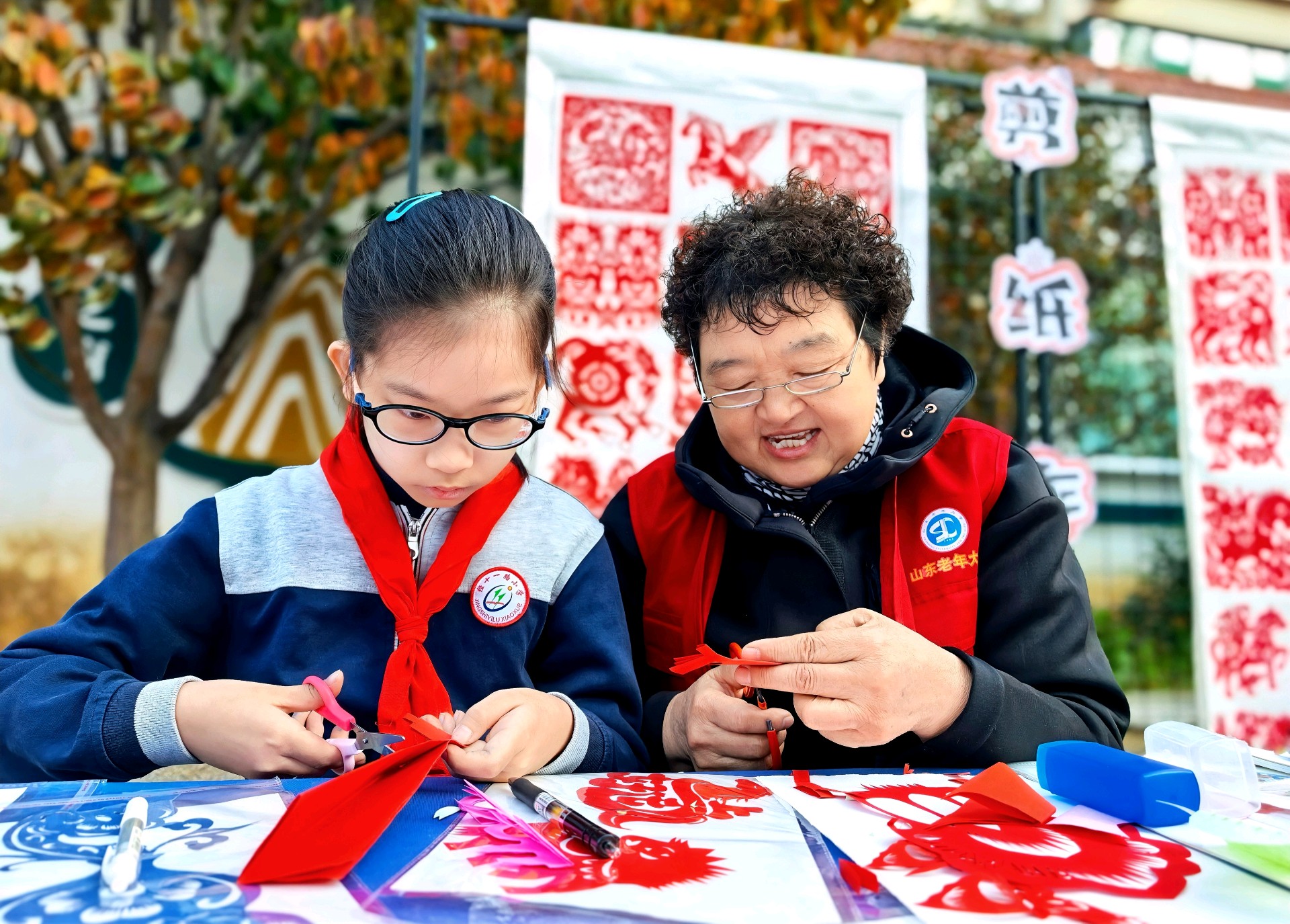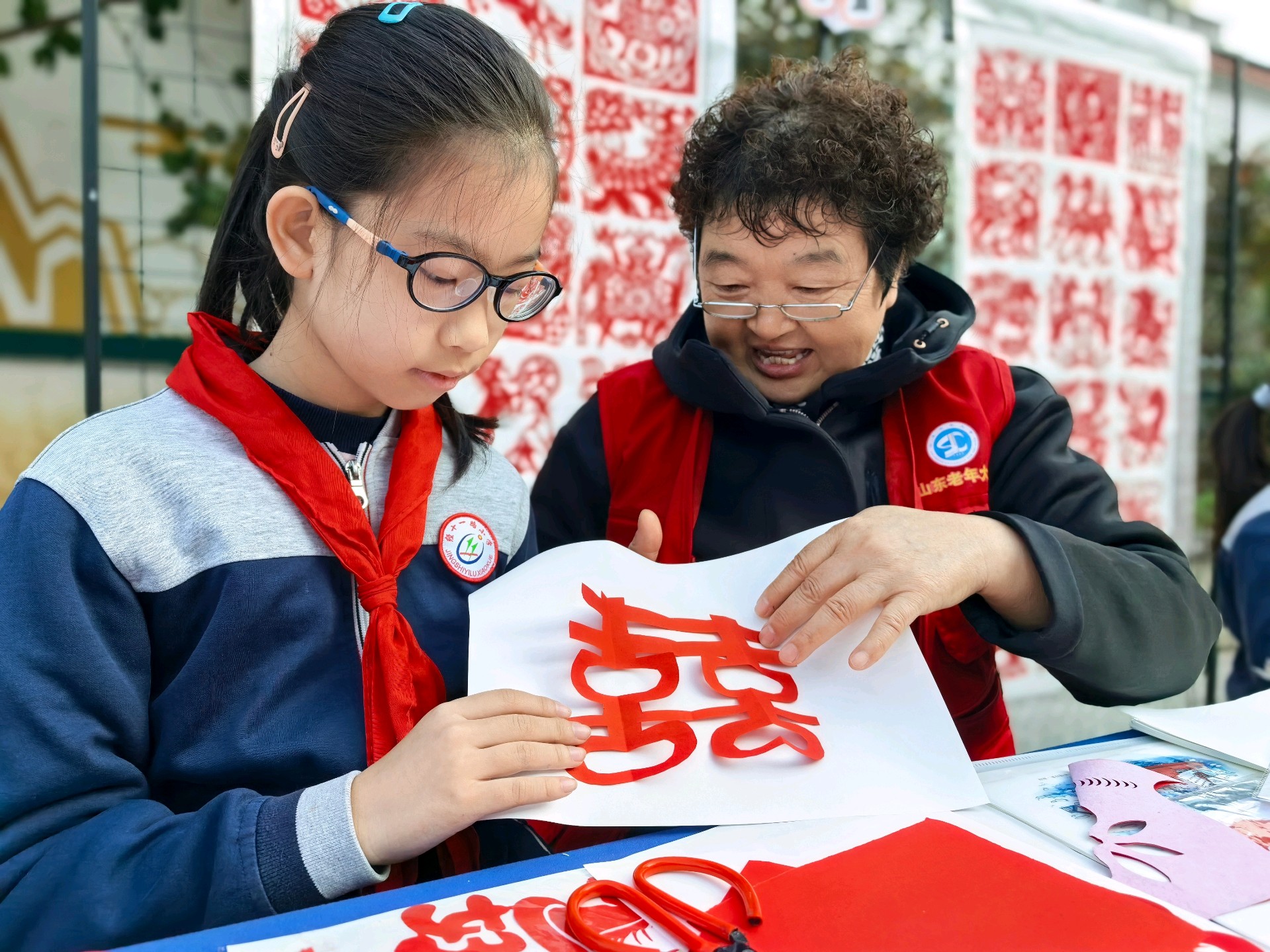 山东老年大学关工委的志愿者们,常年奔赴小学开设公益课堂:一笔一墨的书法指导里,红纸剪刀的剪纸传习中,非遗文化的种子在一教一学的温柔互动里悄然扎根,一来一往的笑意里晕开了文化传承的暖意。
