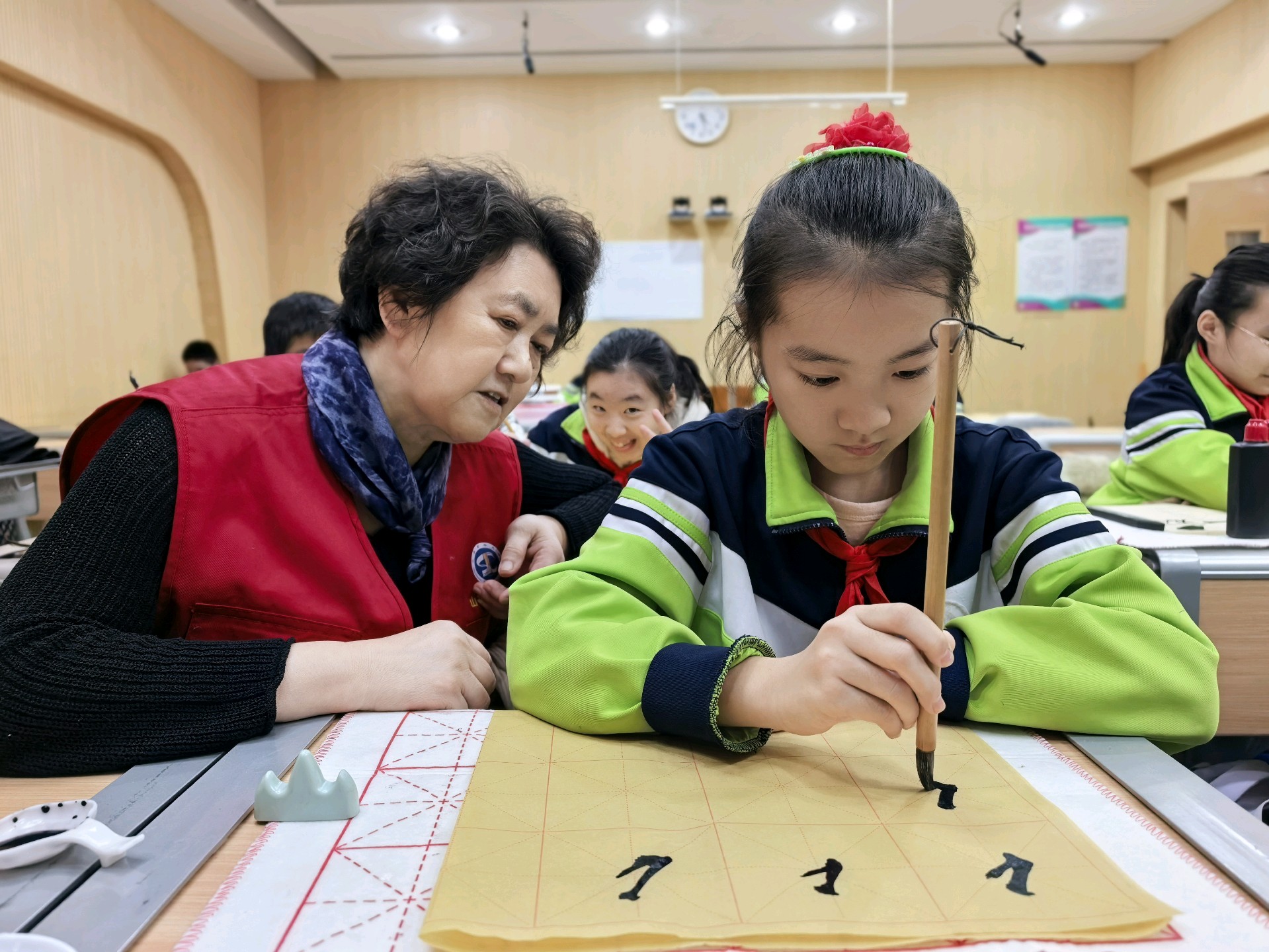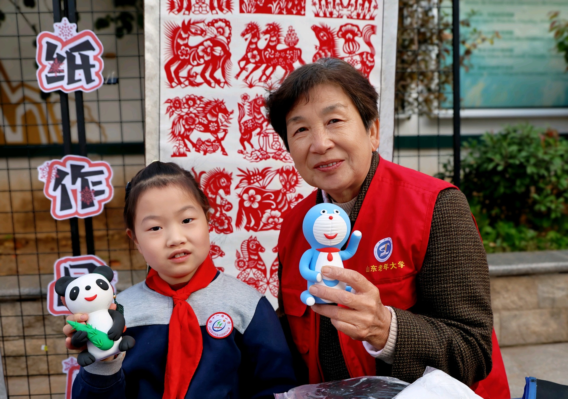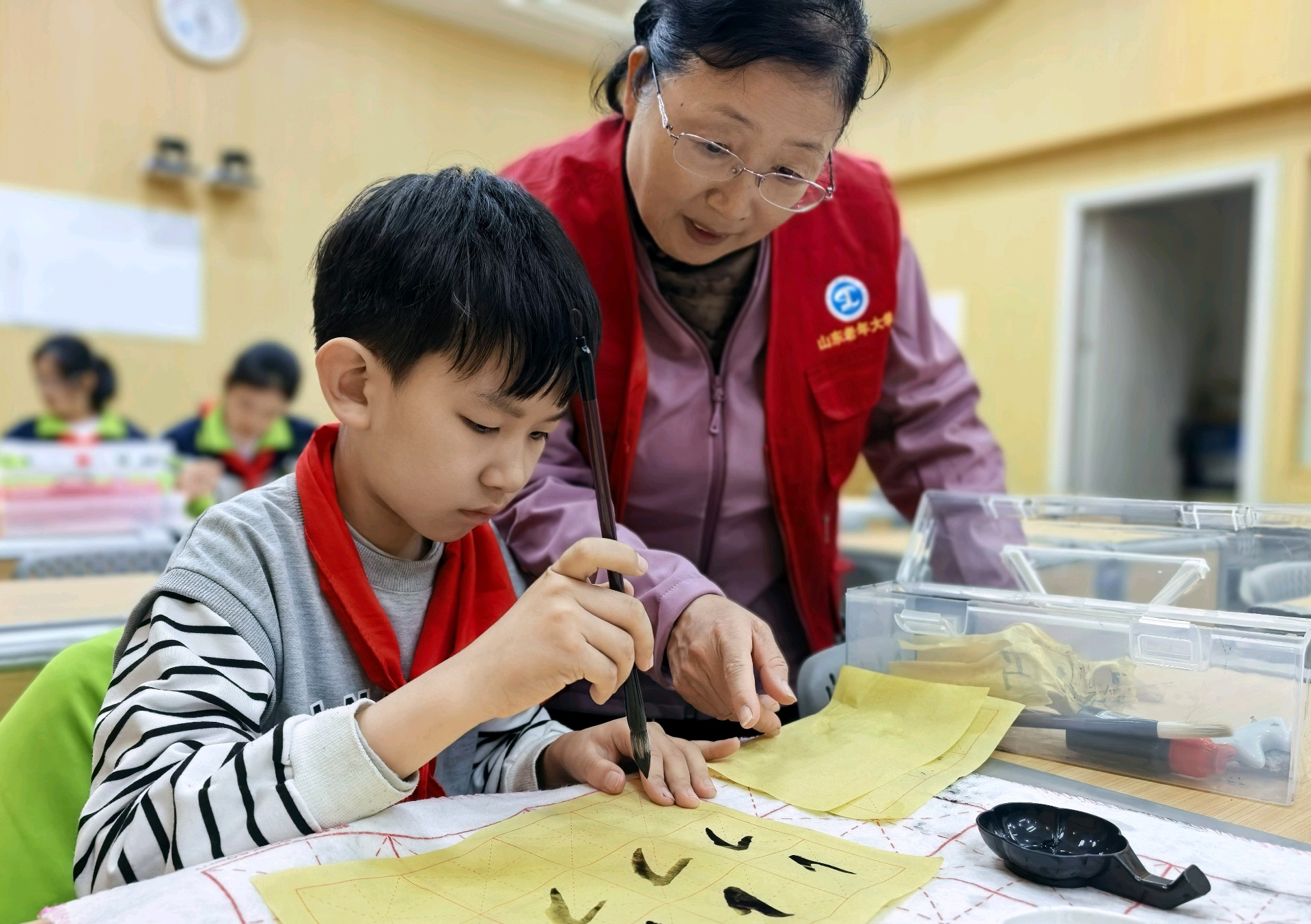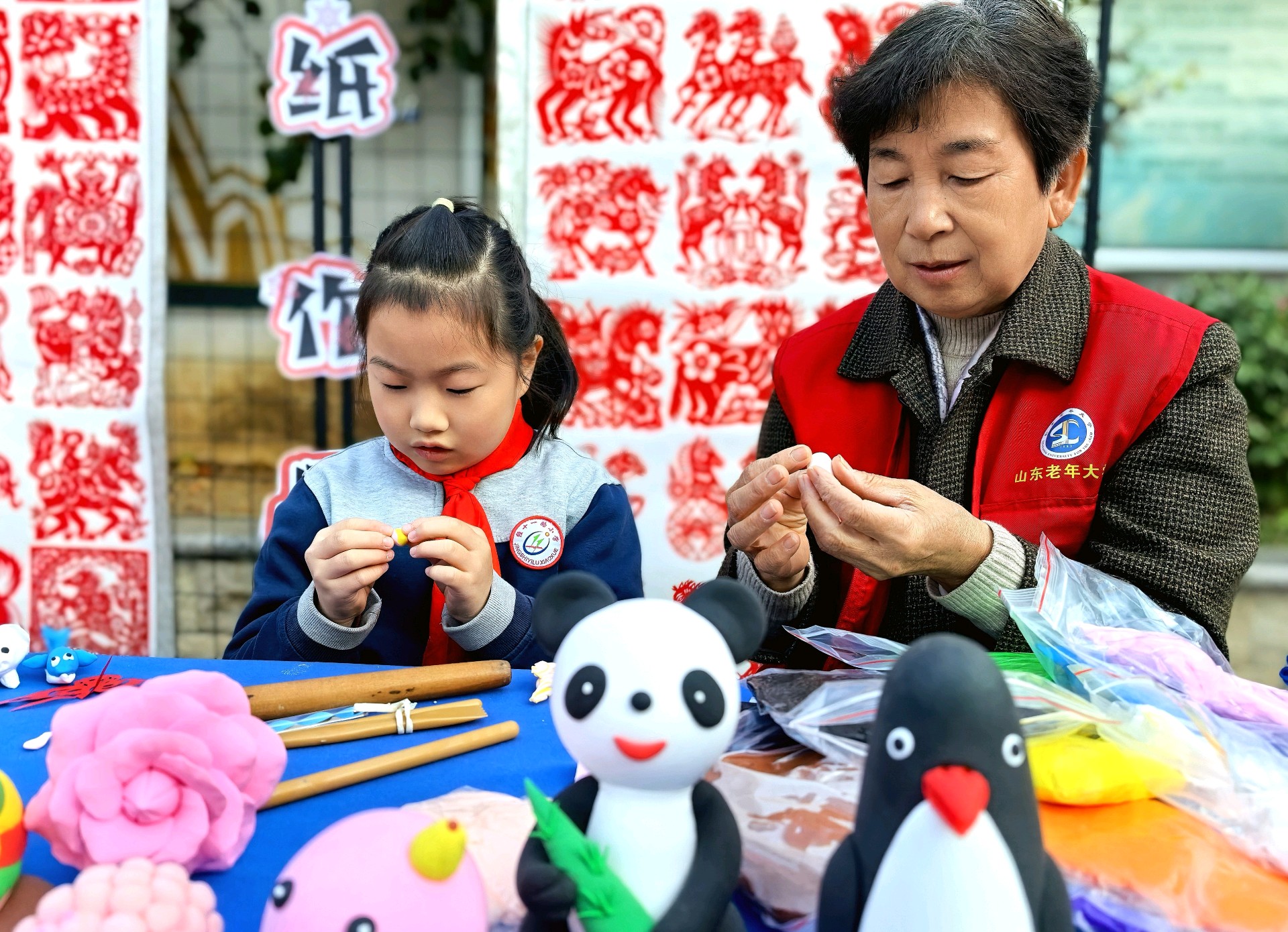 山东老年大学关工委的志愿者们,常年奔赴小学开设公益课堂:一笔一墨的书法指导里,红纸剪刀的剪纸传习中,非遗文化的种子在一教一学的温柔互动里悄然扎根,一来一往的笑意里晕开了文化传承的暖意。
