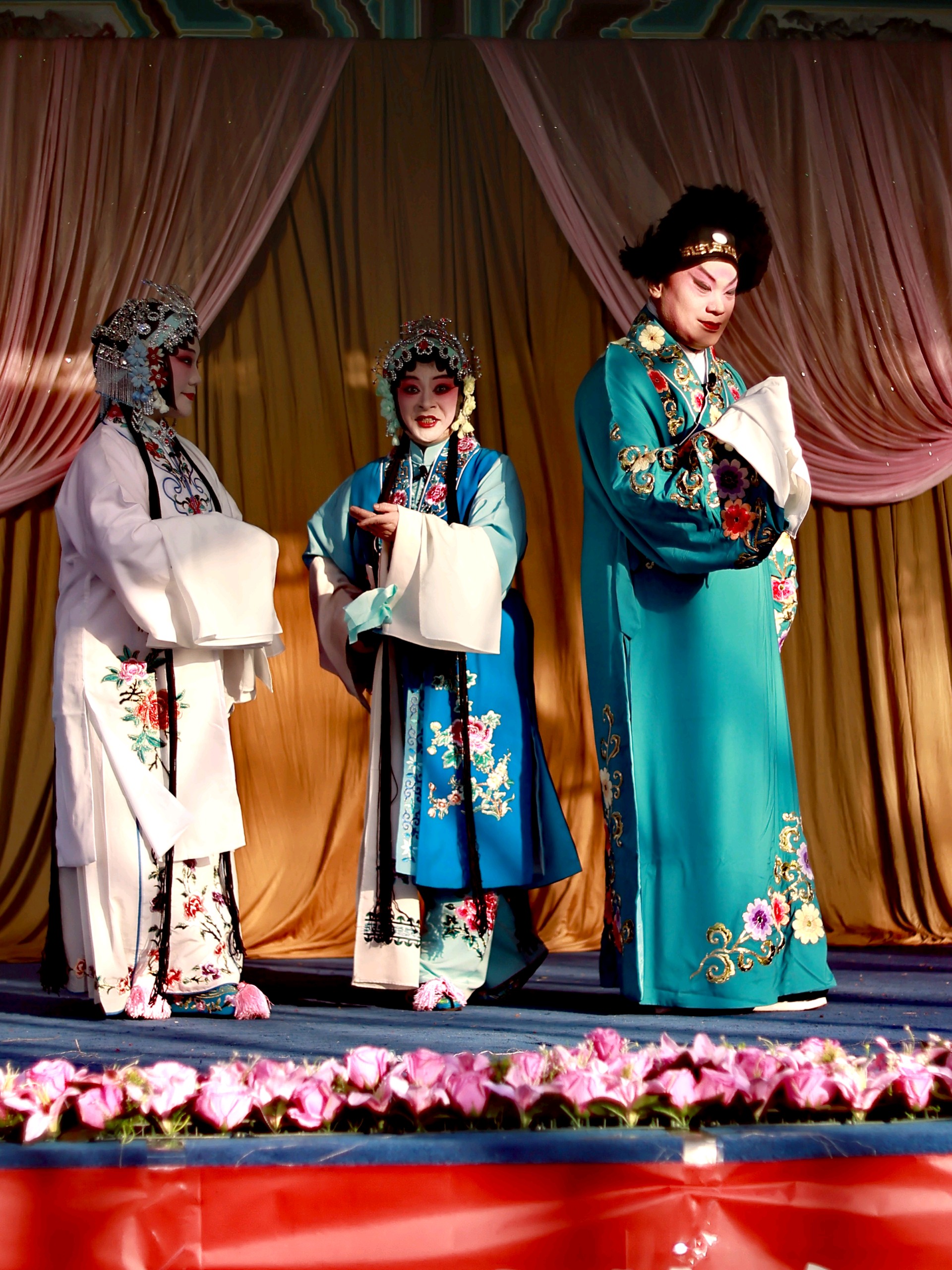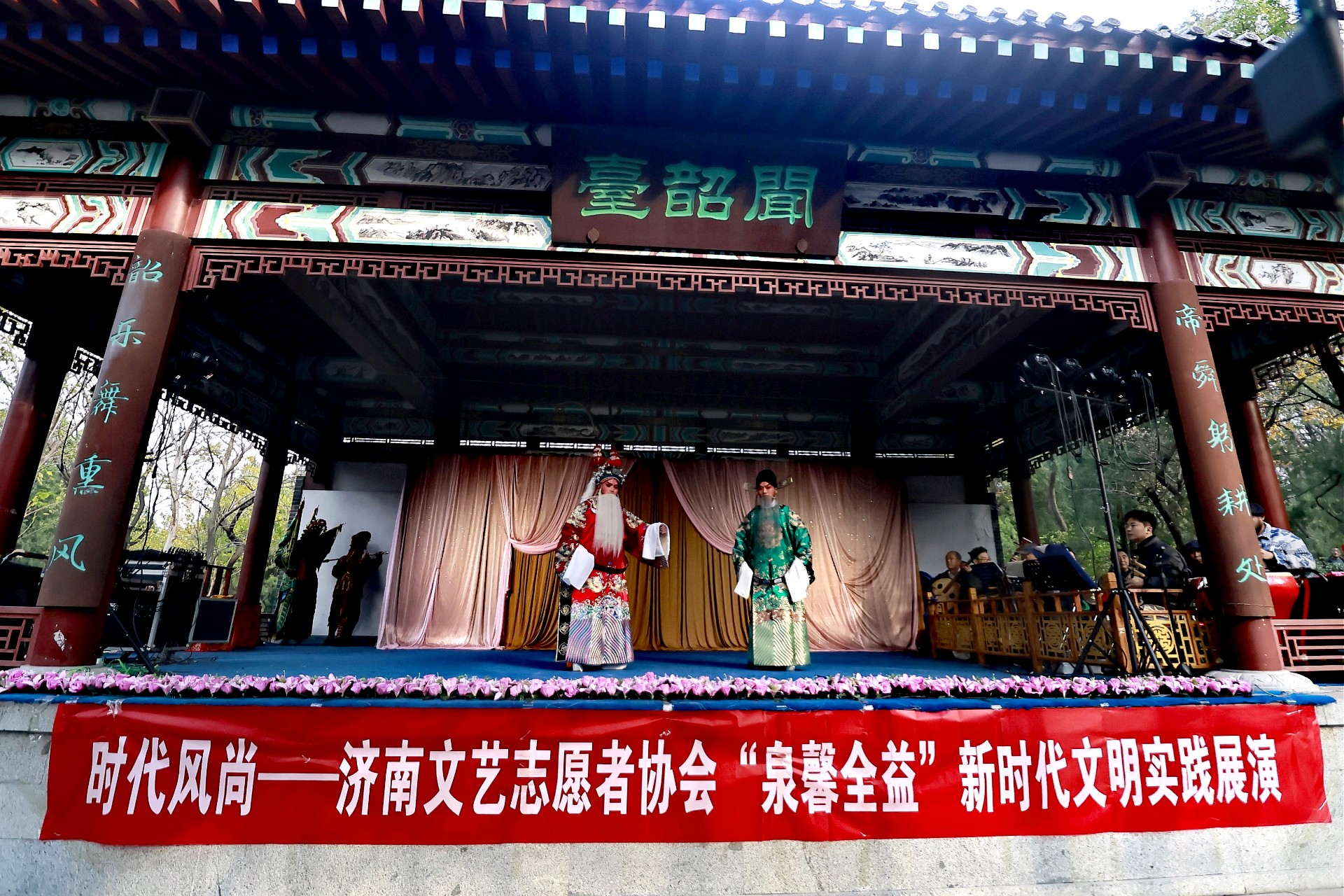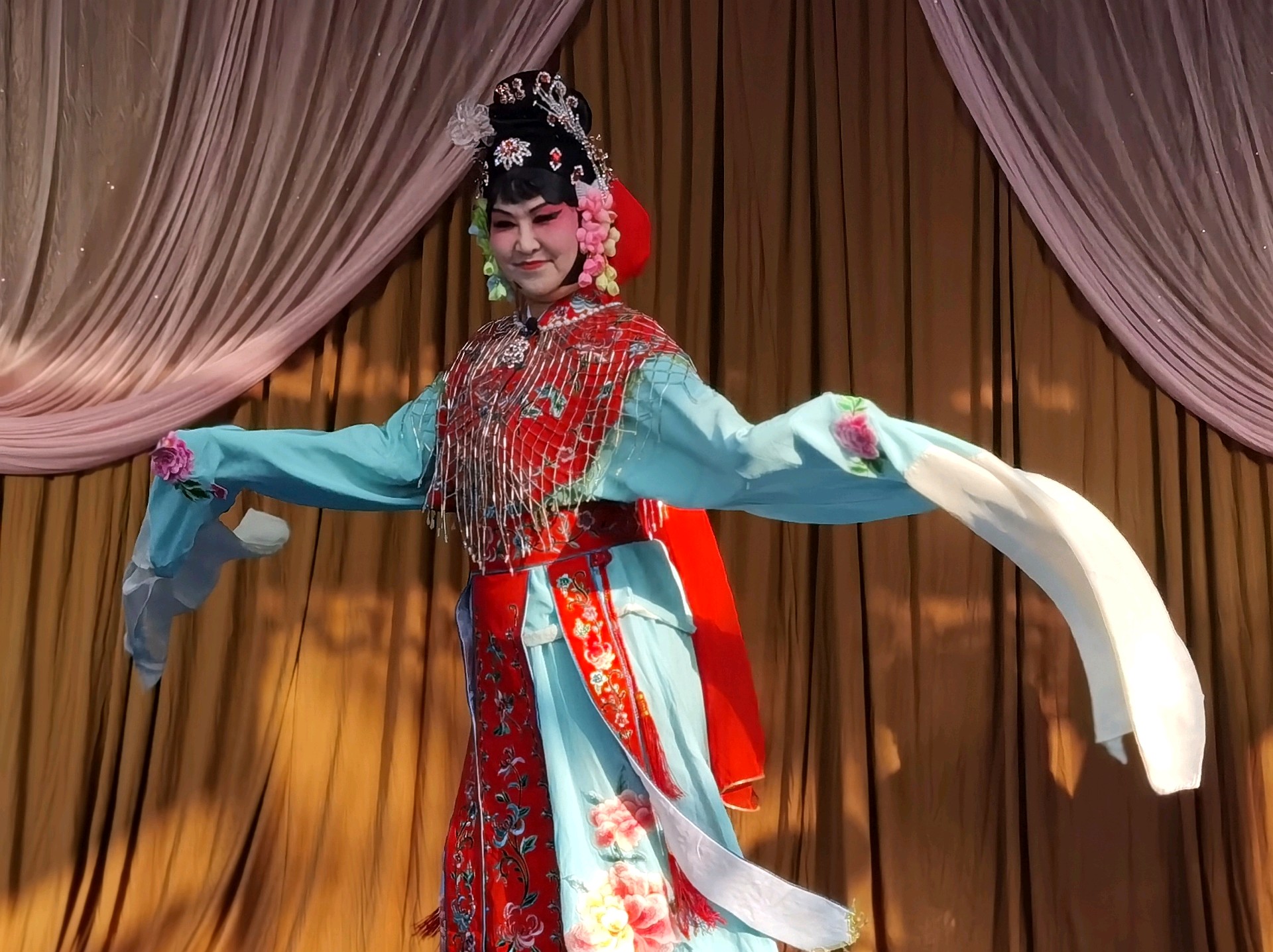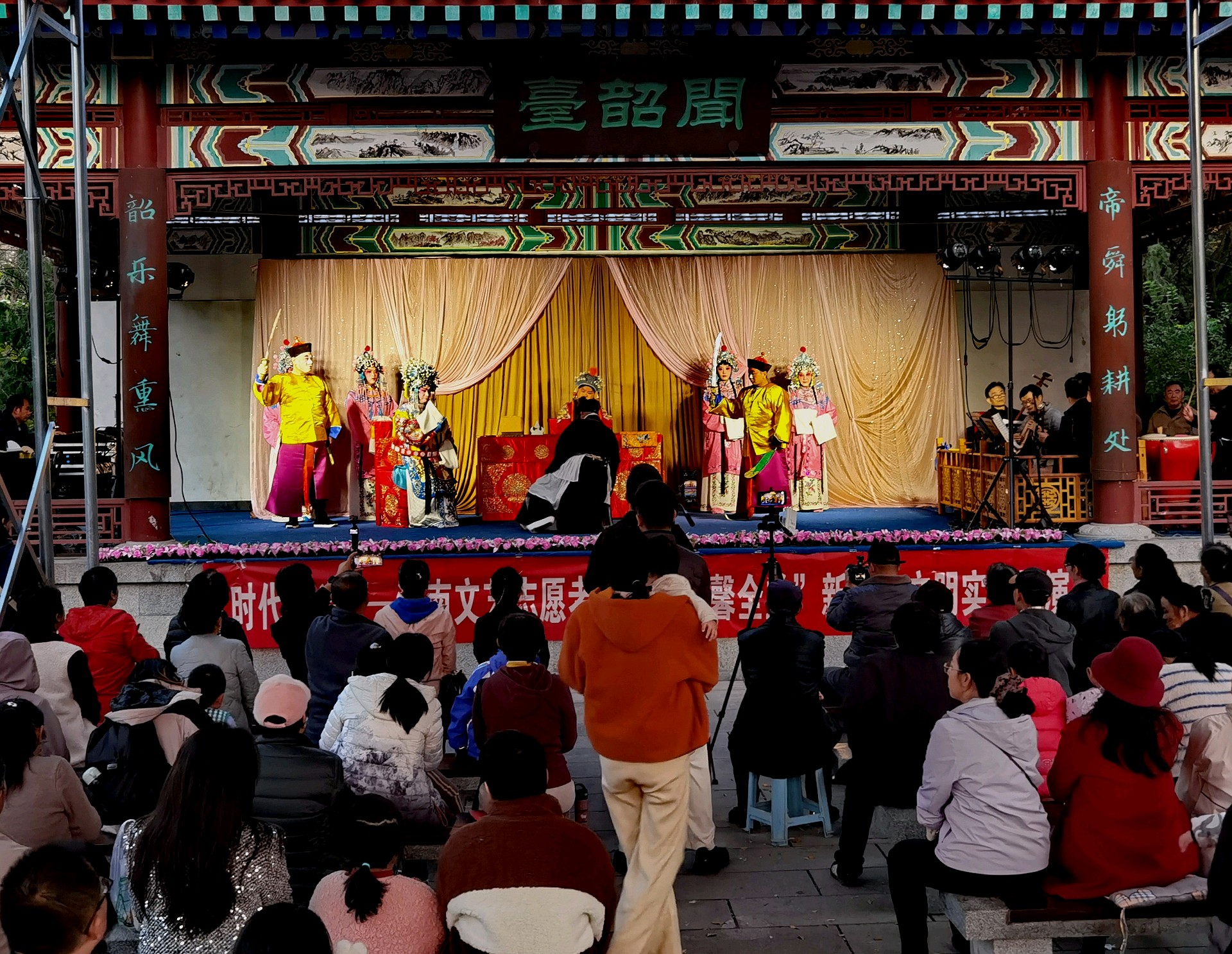 在绿意盎然的亭子下,传统戏曲演员们正激情演绎。红衣白须的旦角与绿衣长须的净角,一唱一和,好不热闹。舞台前方,一条红色横幅随风飘扬,宣告着这场文化盛宴的举办。