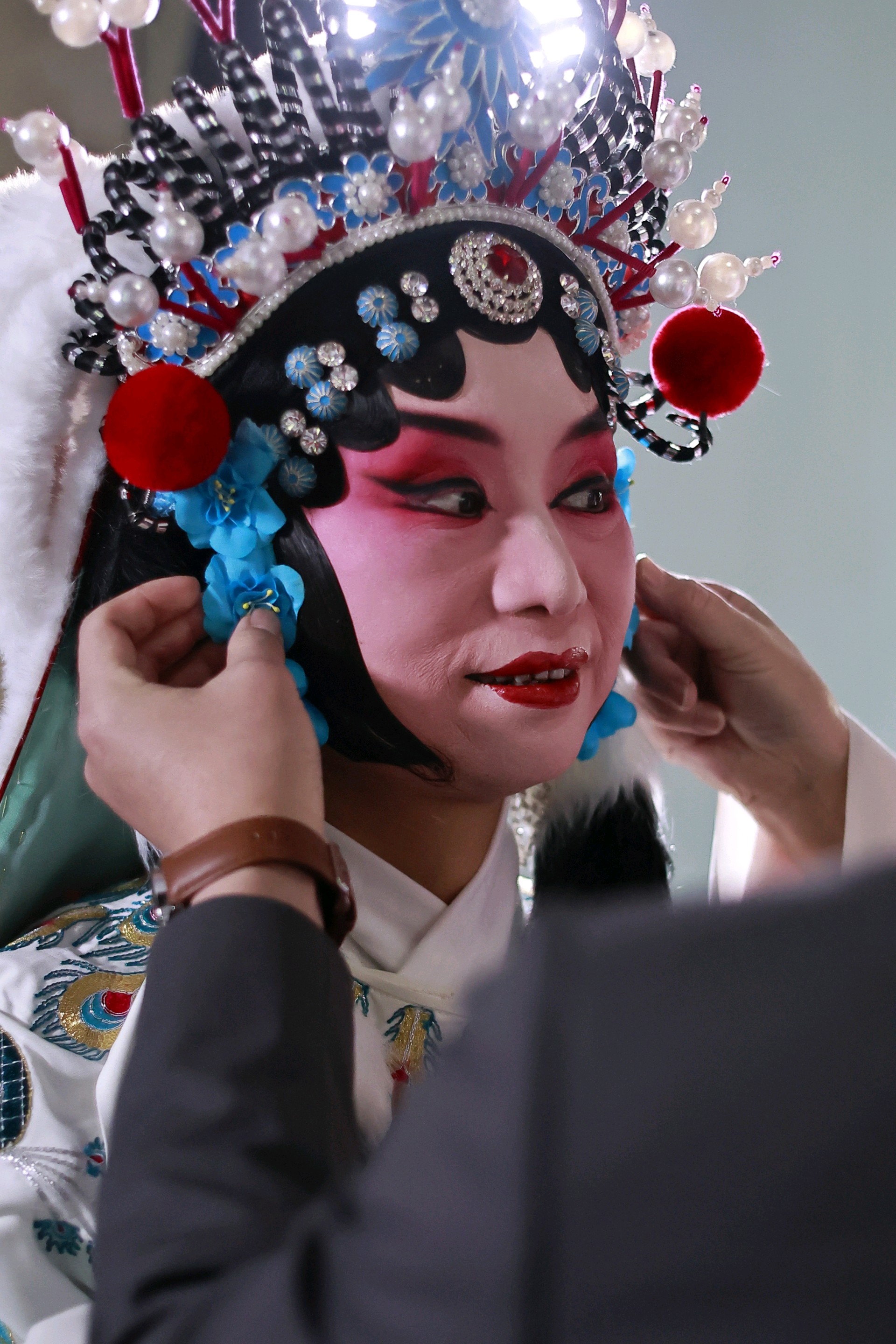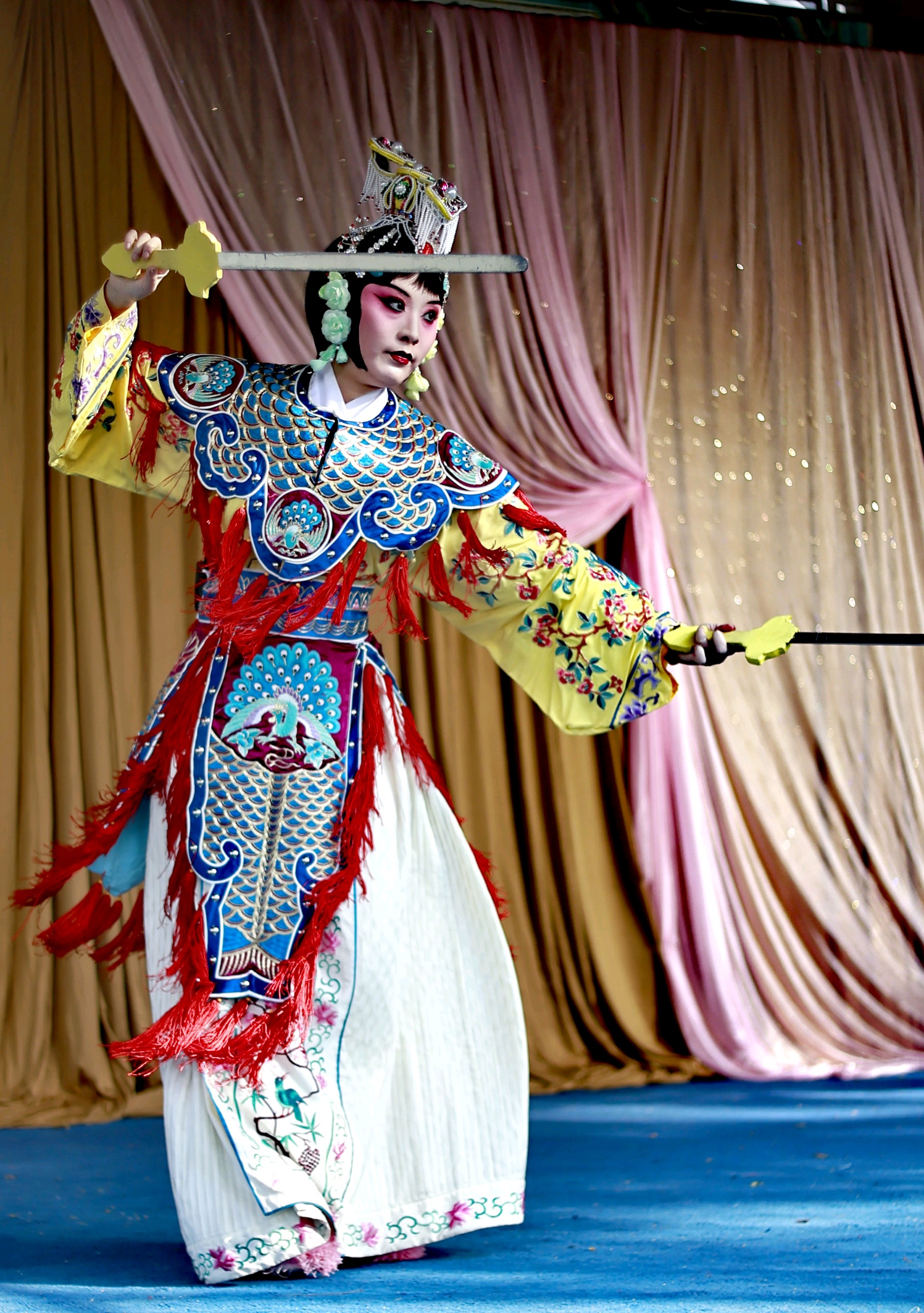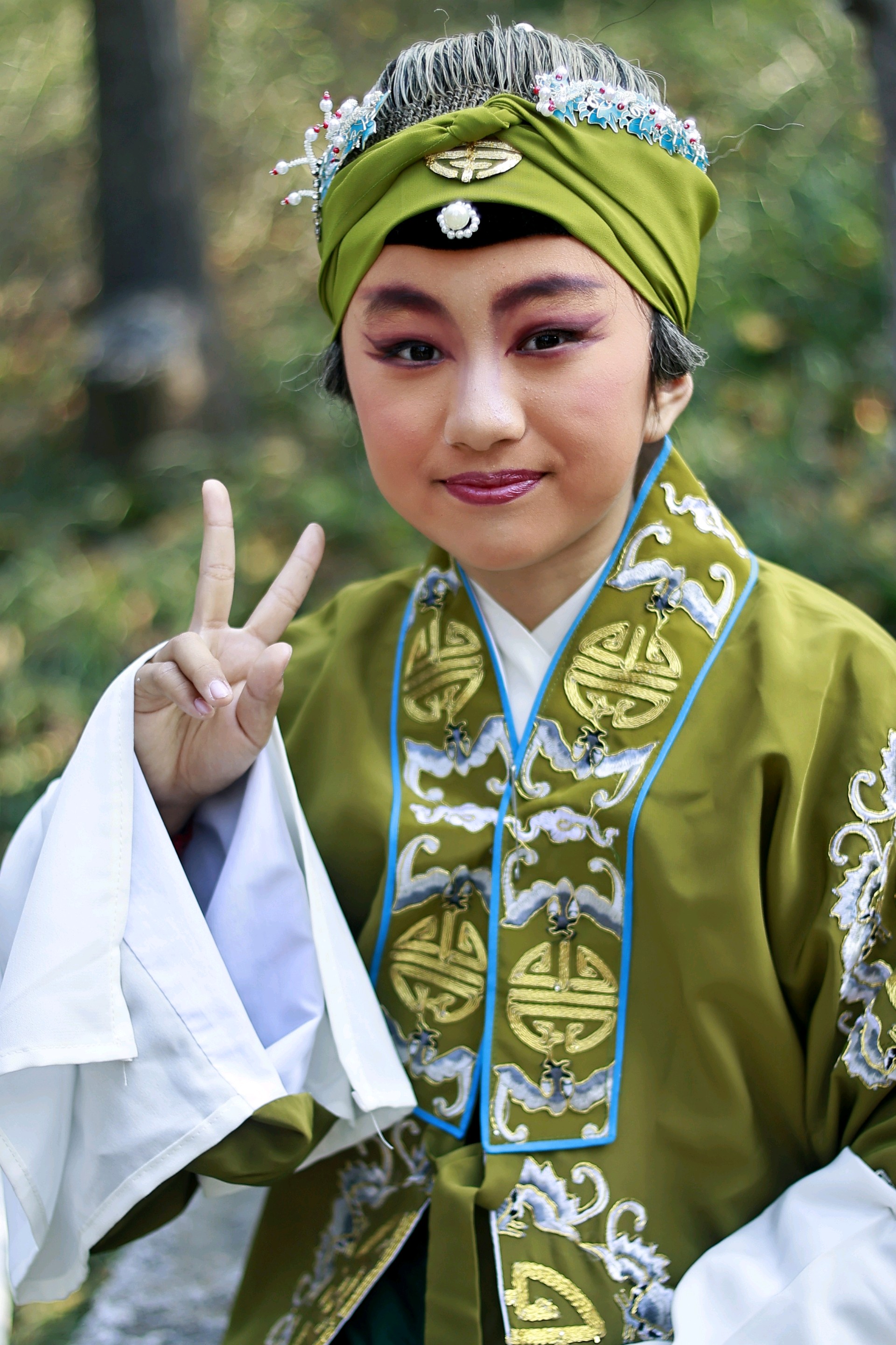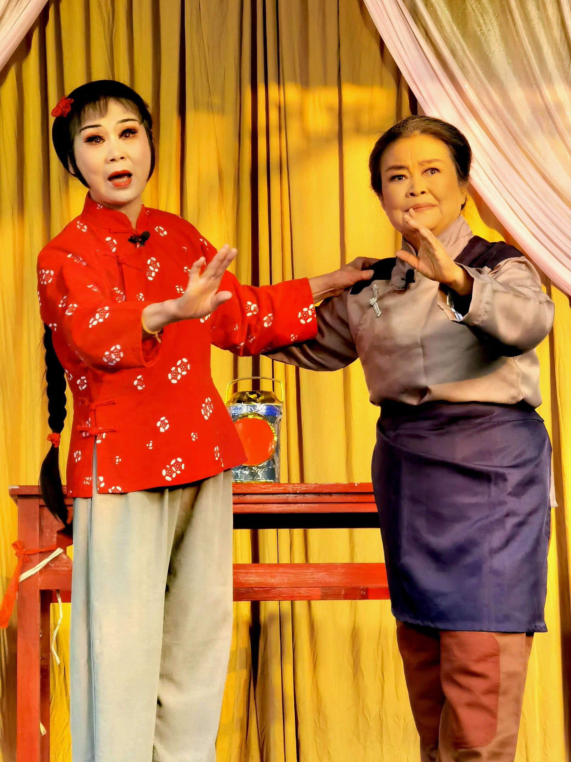 在绿意盎然的亭子下,传统戏曲演员们正激情演绎。红衣白须的旦角与绿衣长须的净角,一唱一和,好不热闹。舞台前方,一条红色横幅随风飘扬,宣告着这场文化盛宴的举办。