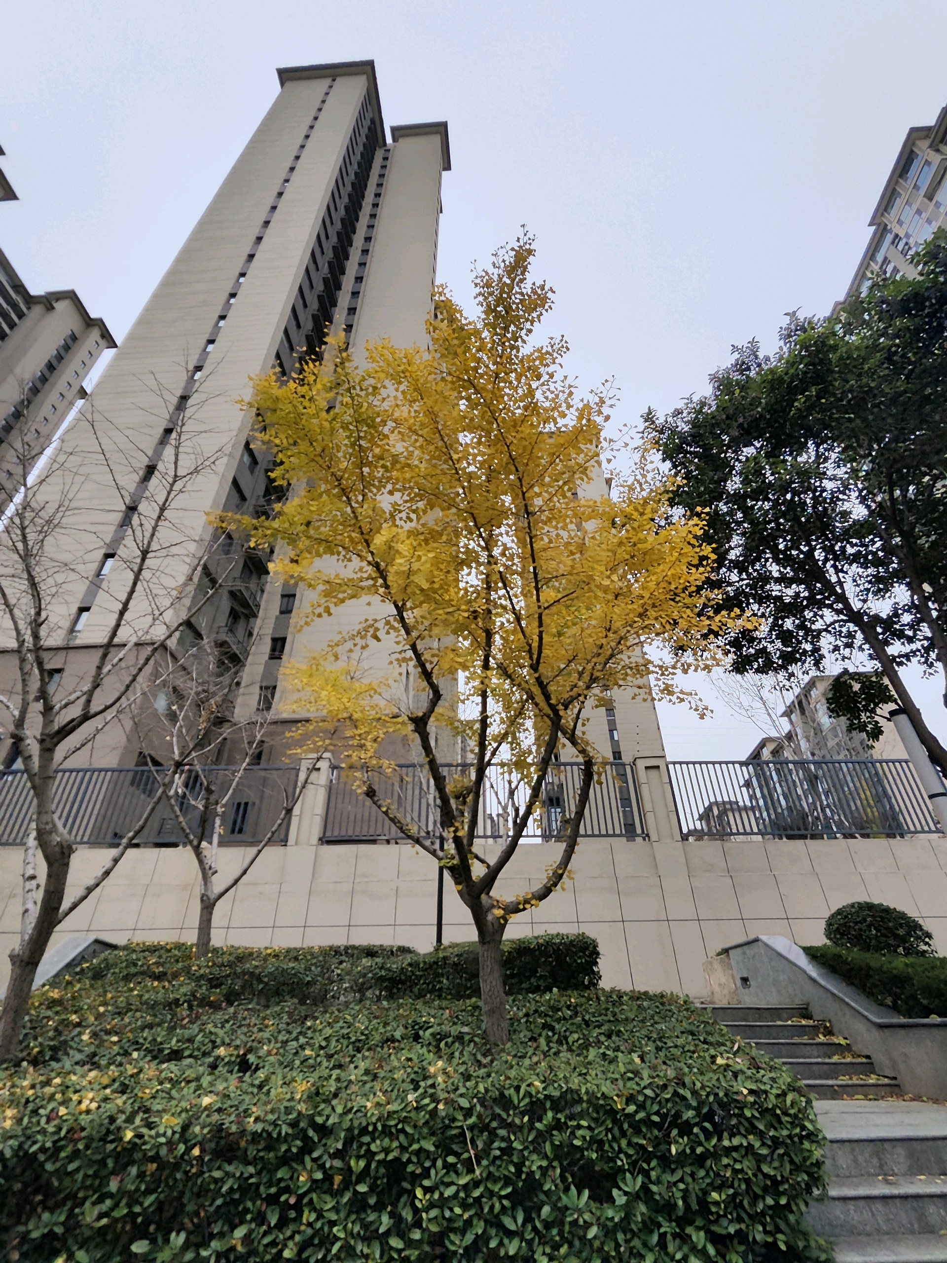 在城市的某个角落,一棵金黄的银杏树矗立在小区里,与高楼大厦为邻。它仿佛是这座城市的一道亮丽风景线,为人们带来一丝秋天的气息。