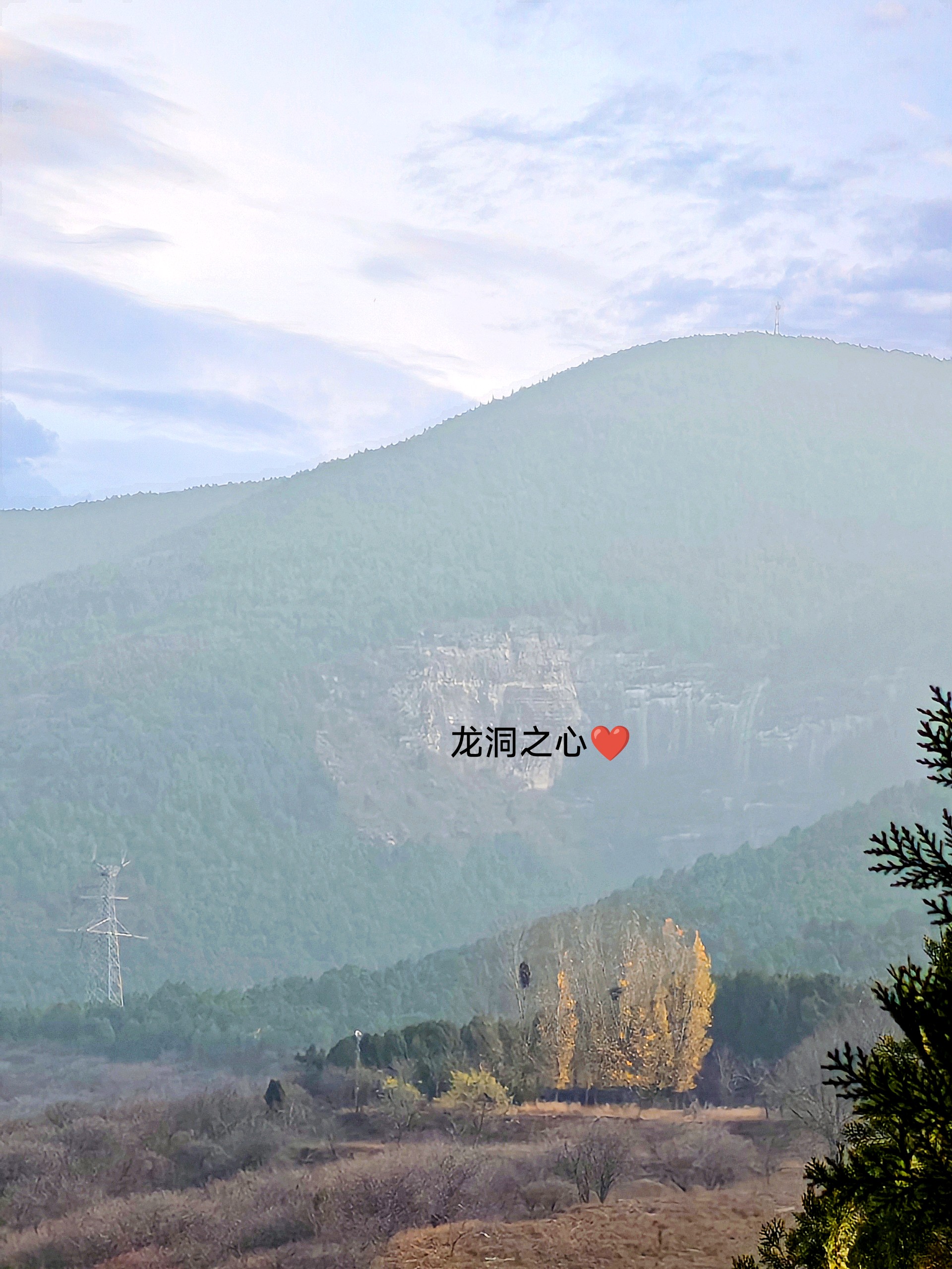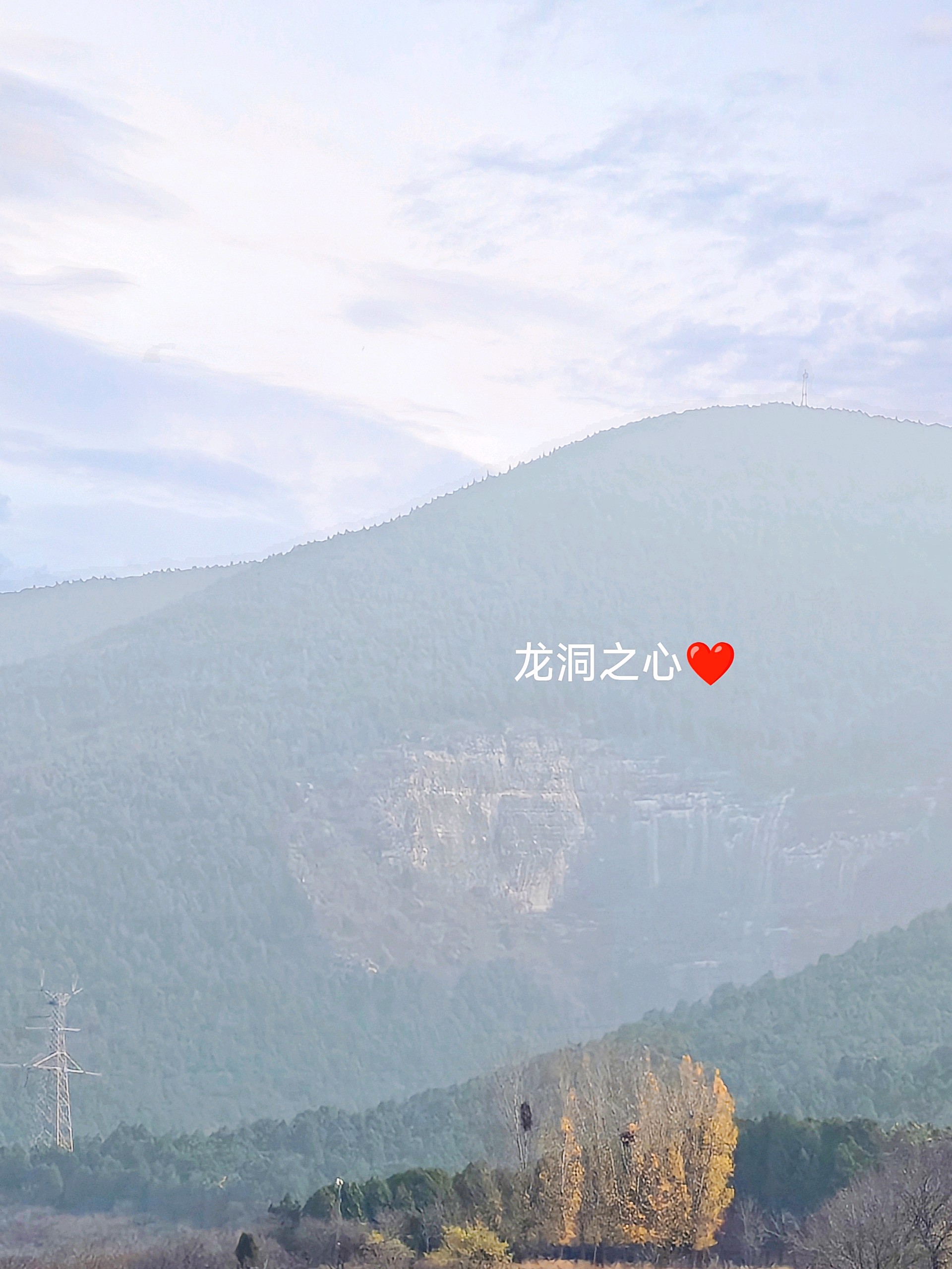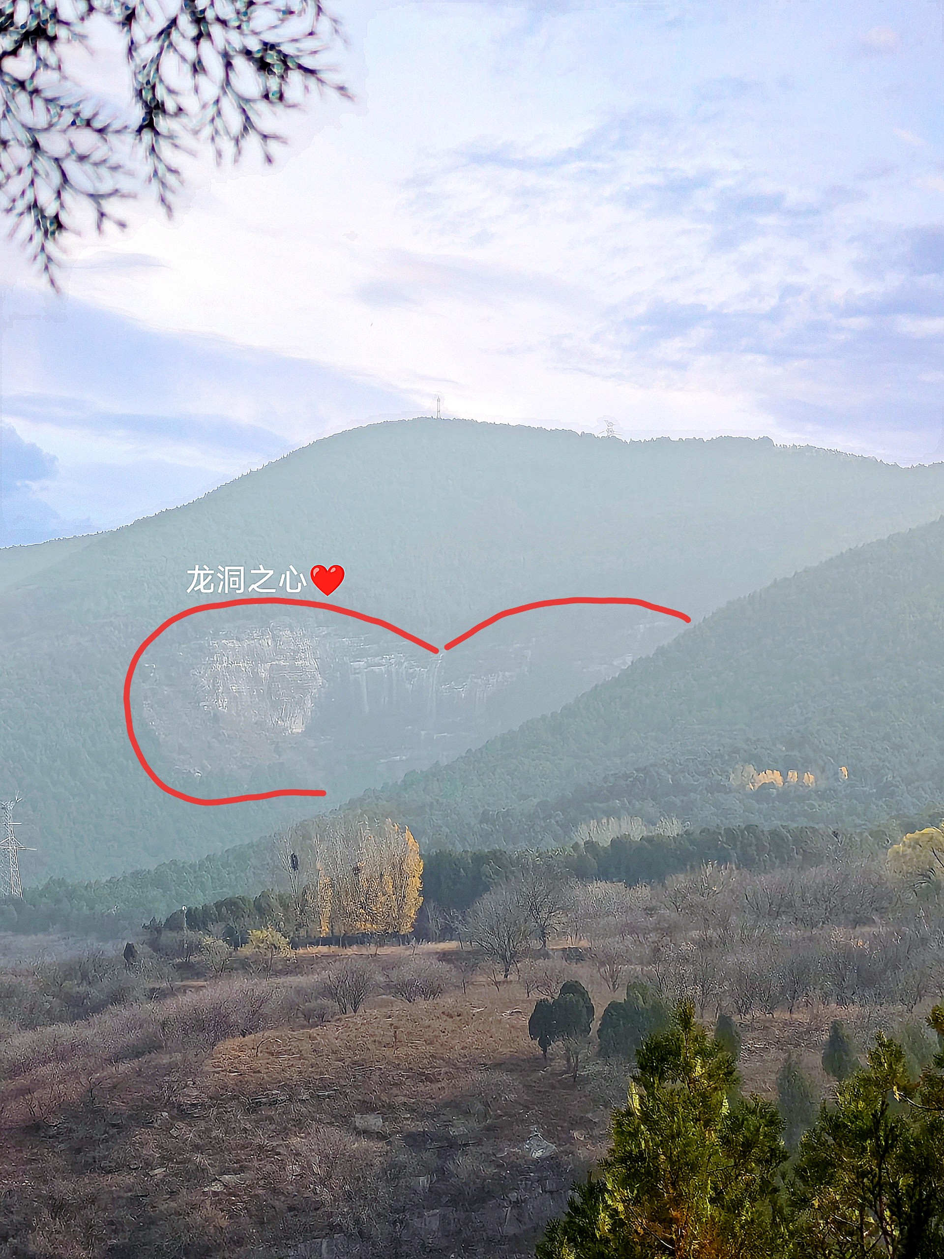 龙洞景区有个“爱心坑”!在麦穰垛的视角里,那片岩壁天然凹成了爱心的形状——“龙洞之心”果然名不虚传~虽然山雾裹着初冬的寒意,但是风里飘着的是浪漫的味道呀~