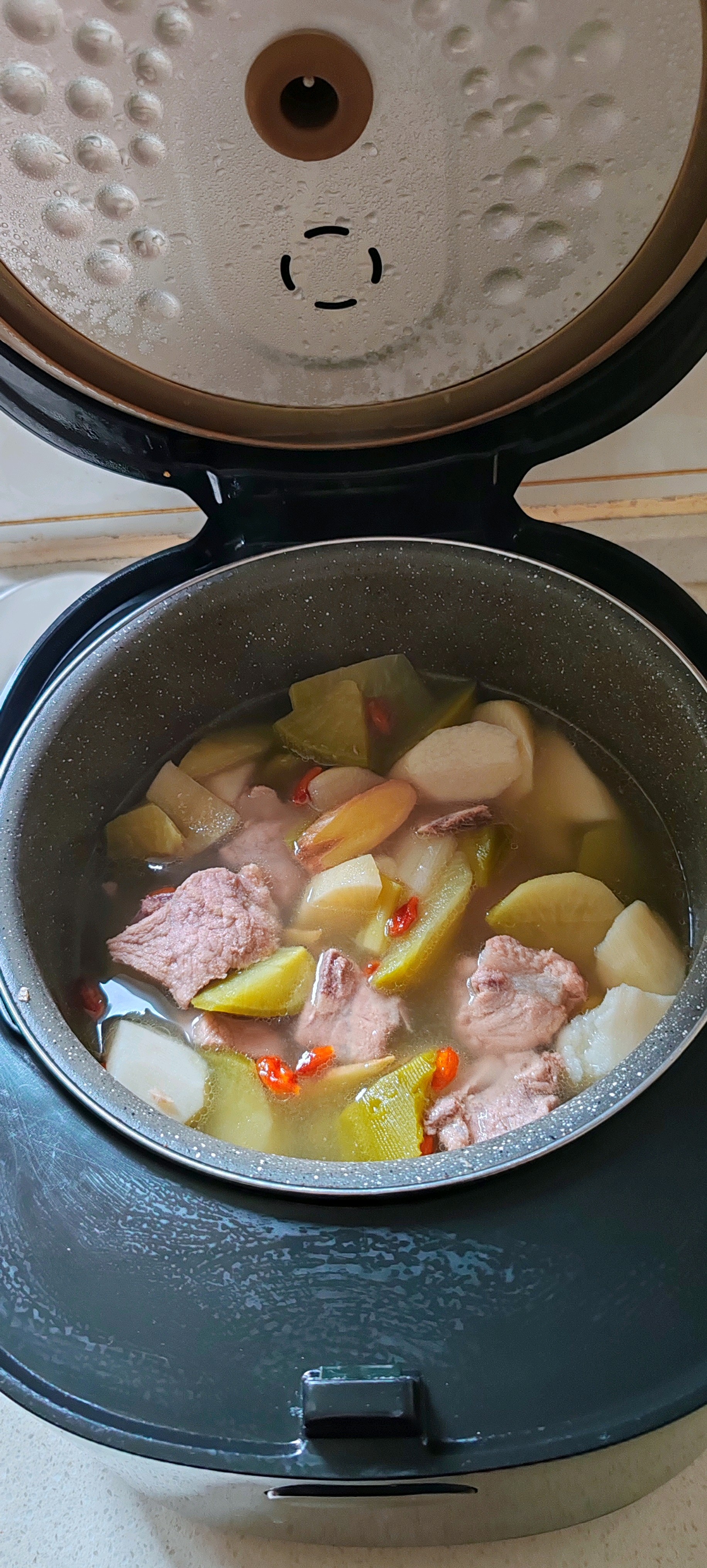 4.时间到了,放枸杞子,葱花即可出锅。一道营养美味的排骨汤就做好了。 清淡又美味。