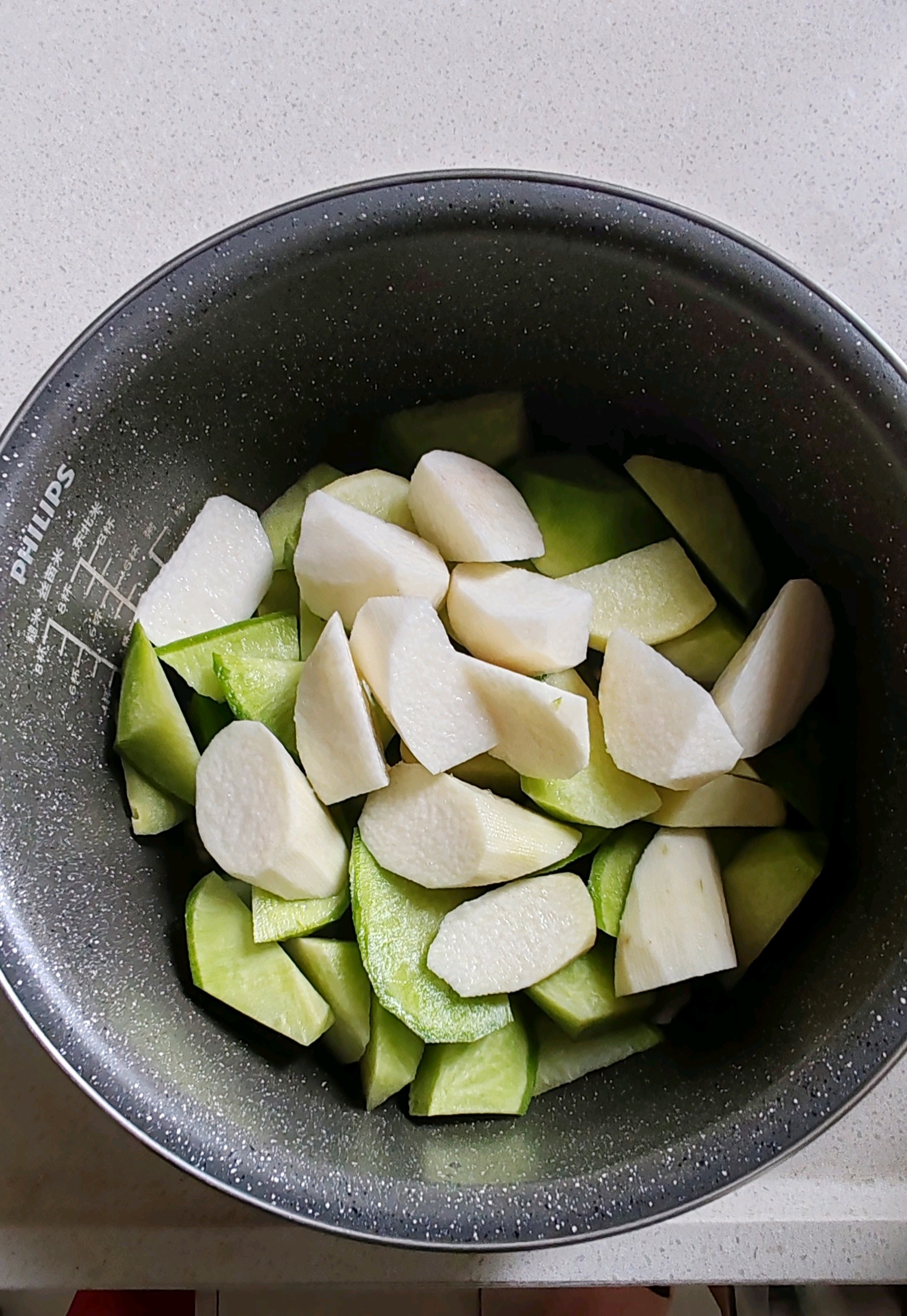 2. 青萝卜和山药分别削皮,切成滚刀块,放入慢炖锅里备用。