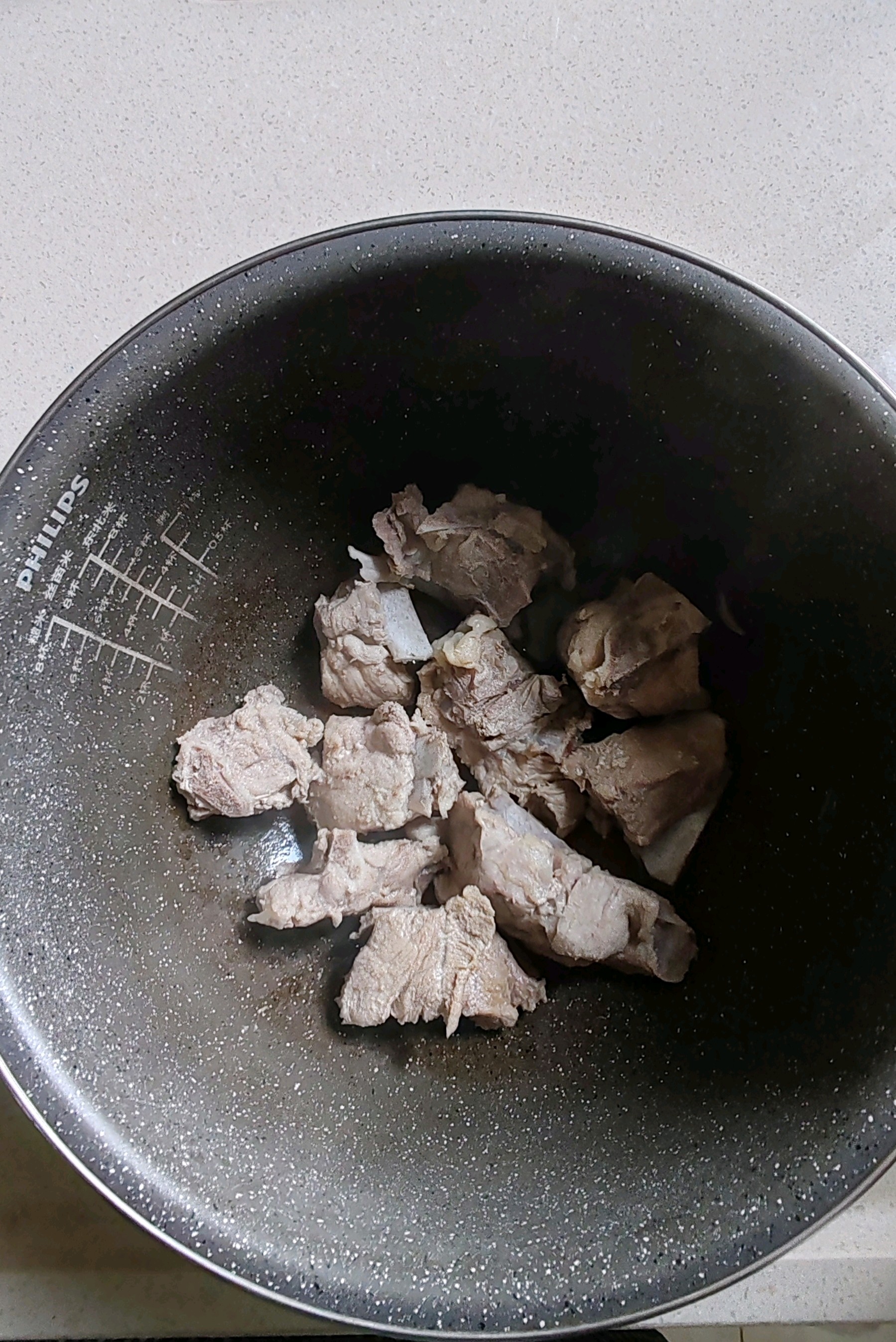 1. 将排骨剁成小块,冷水下锅,加入1汤匙料酒、焯水3分钟,捞出排骨用温水冲洗干净,放慢炖锅里备用。
