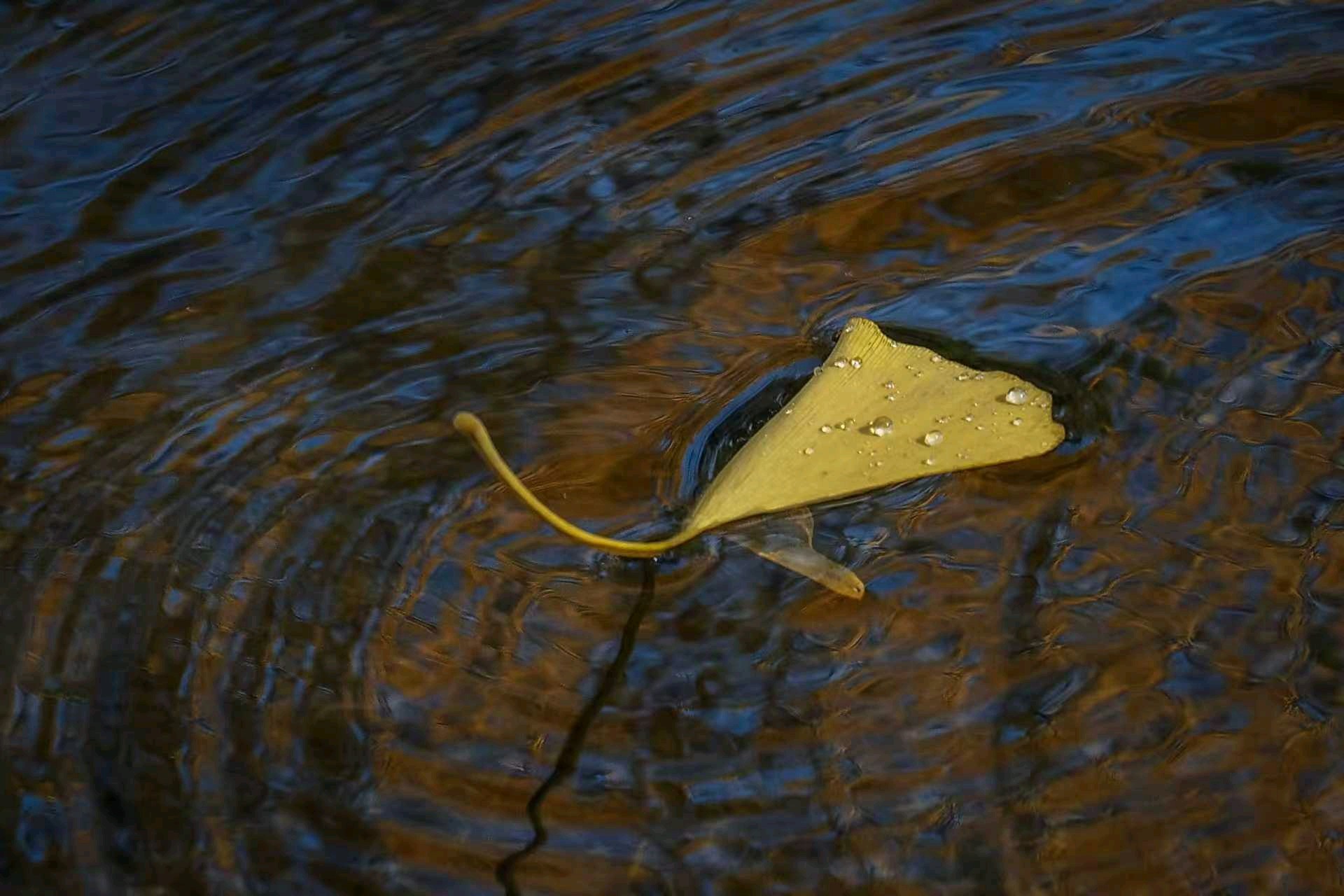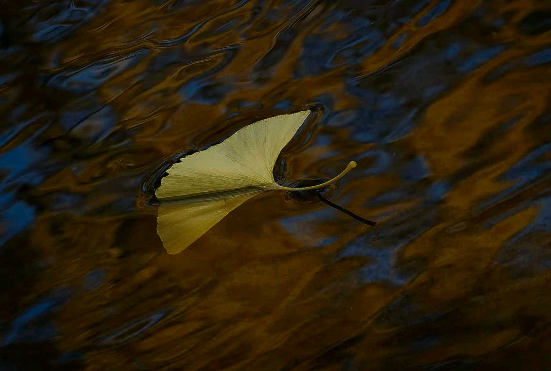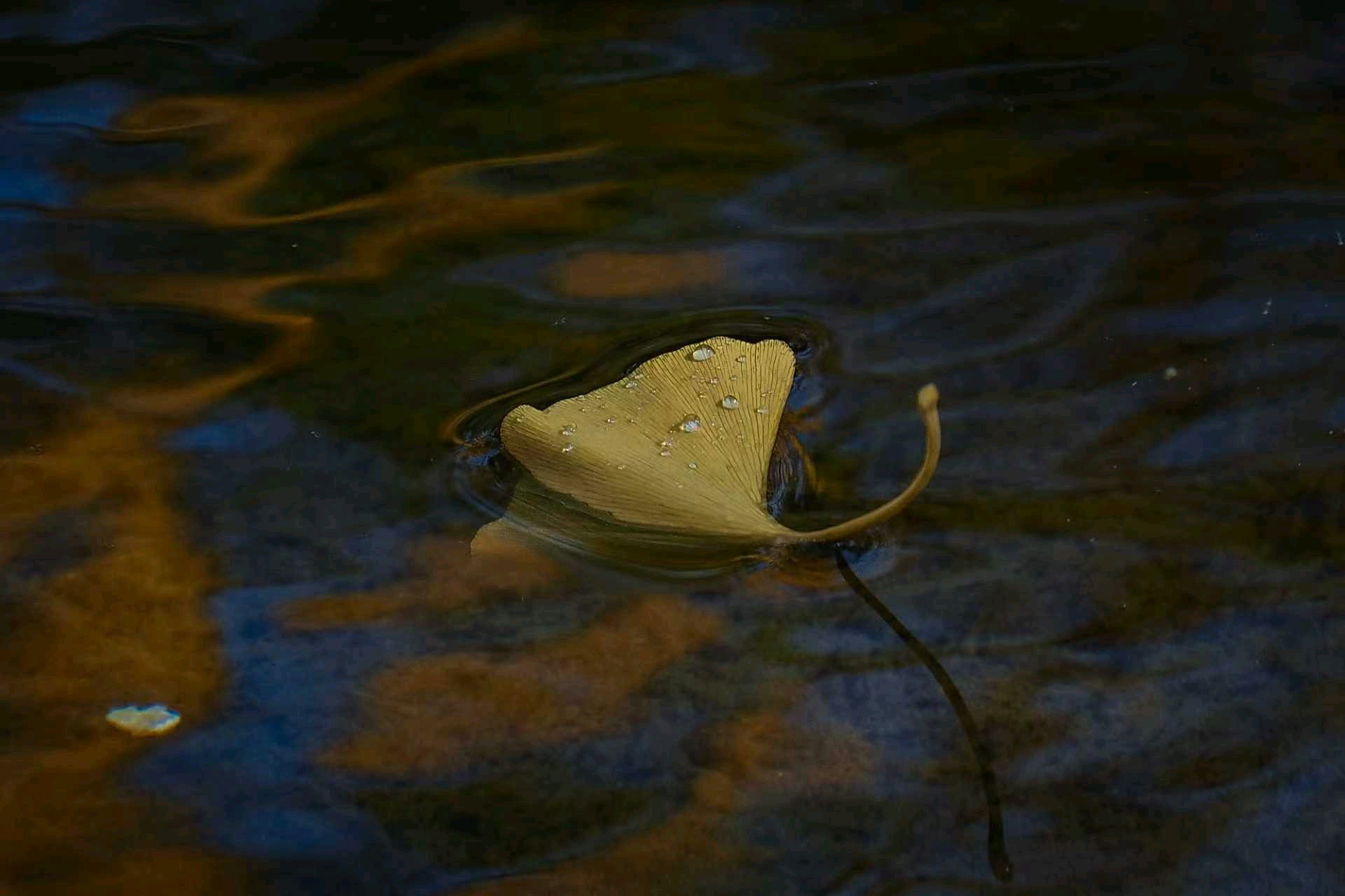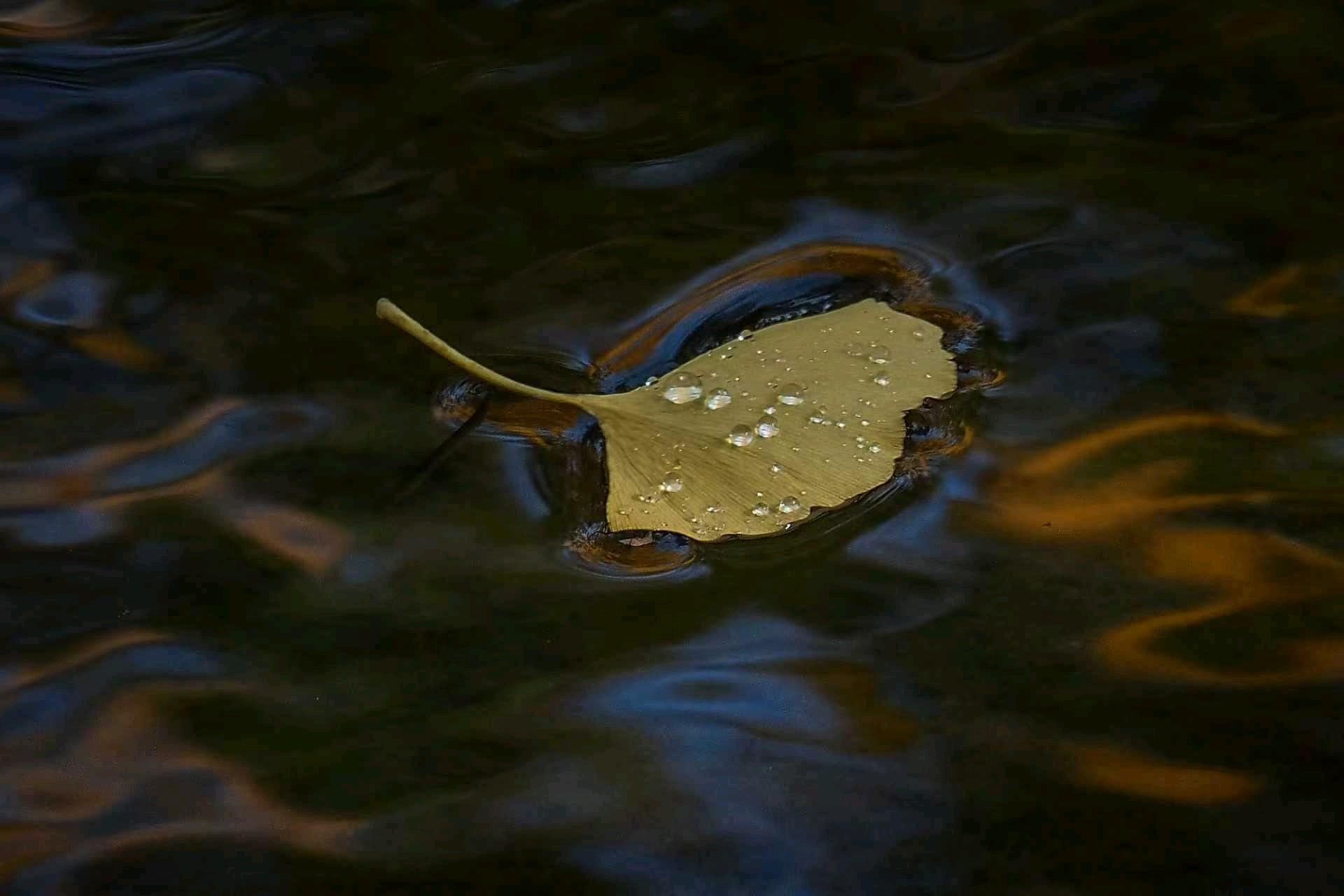 银杏叶飘落水中,像天鹅悠然拨动金掌。涟漪轻颤,将秋日私语一圈圈荡向岸边。