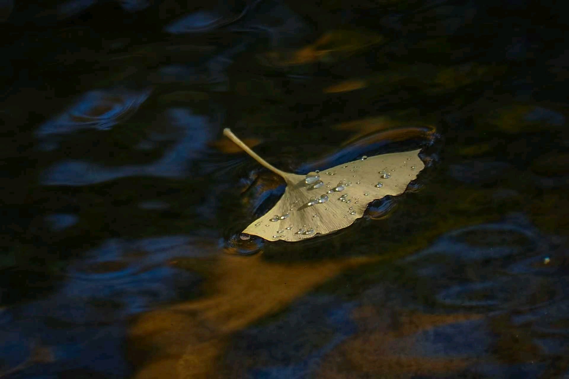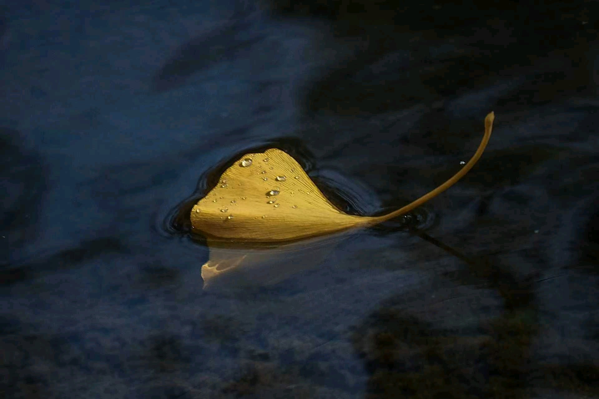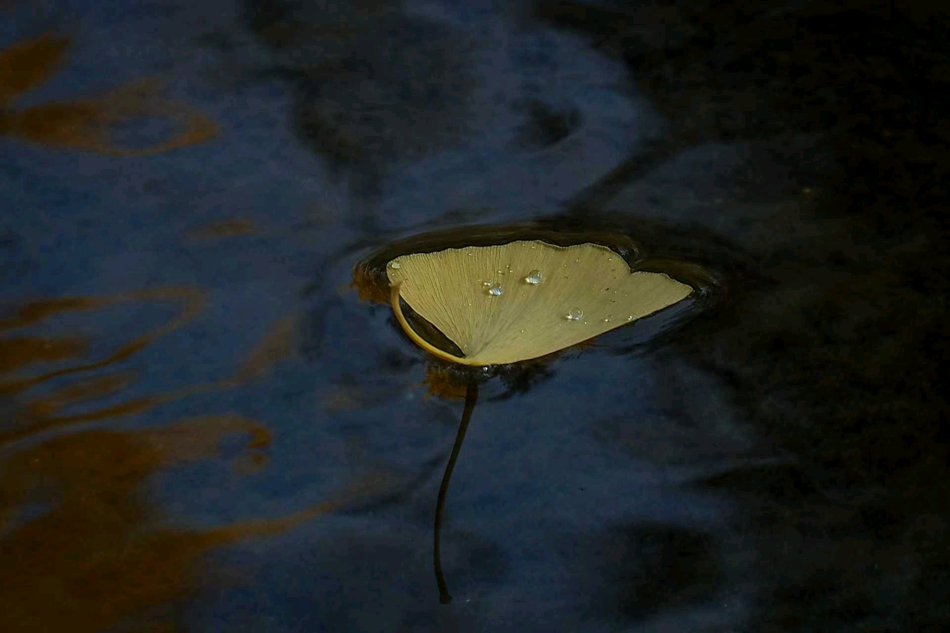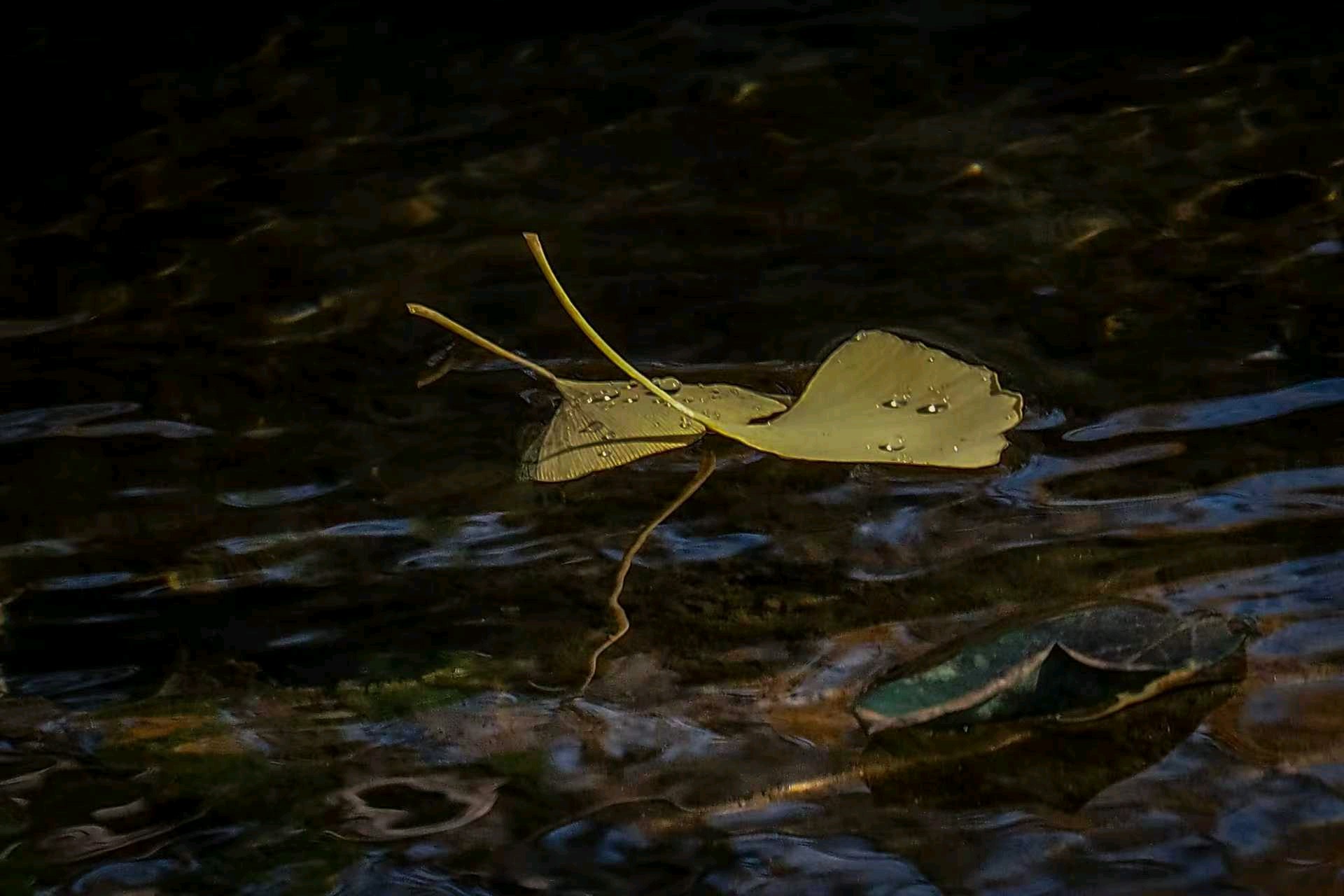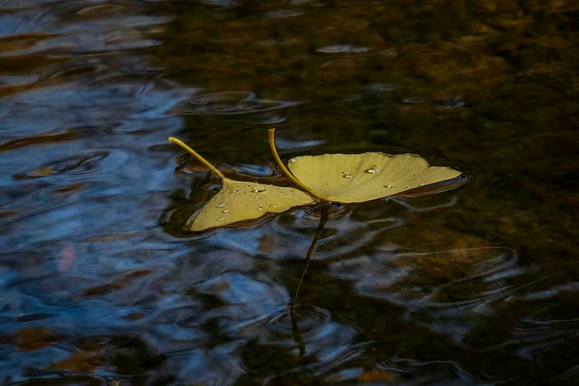 银杏叶飘落水中,像天鹅悠然拨动金掌。涟漪轻颤,将秋日私语一圈圈荡向岸边。