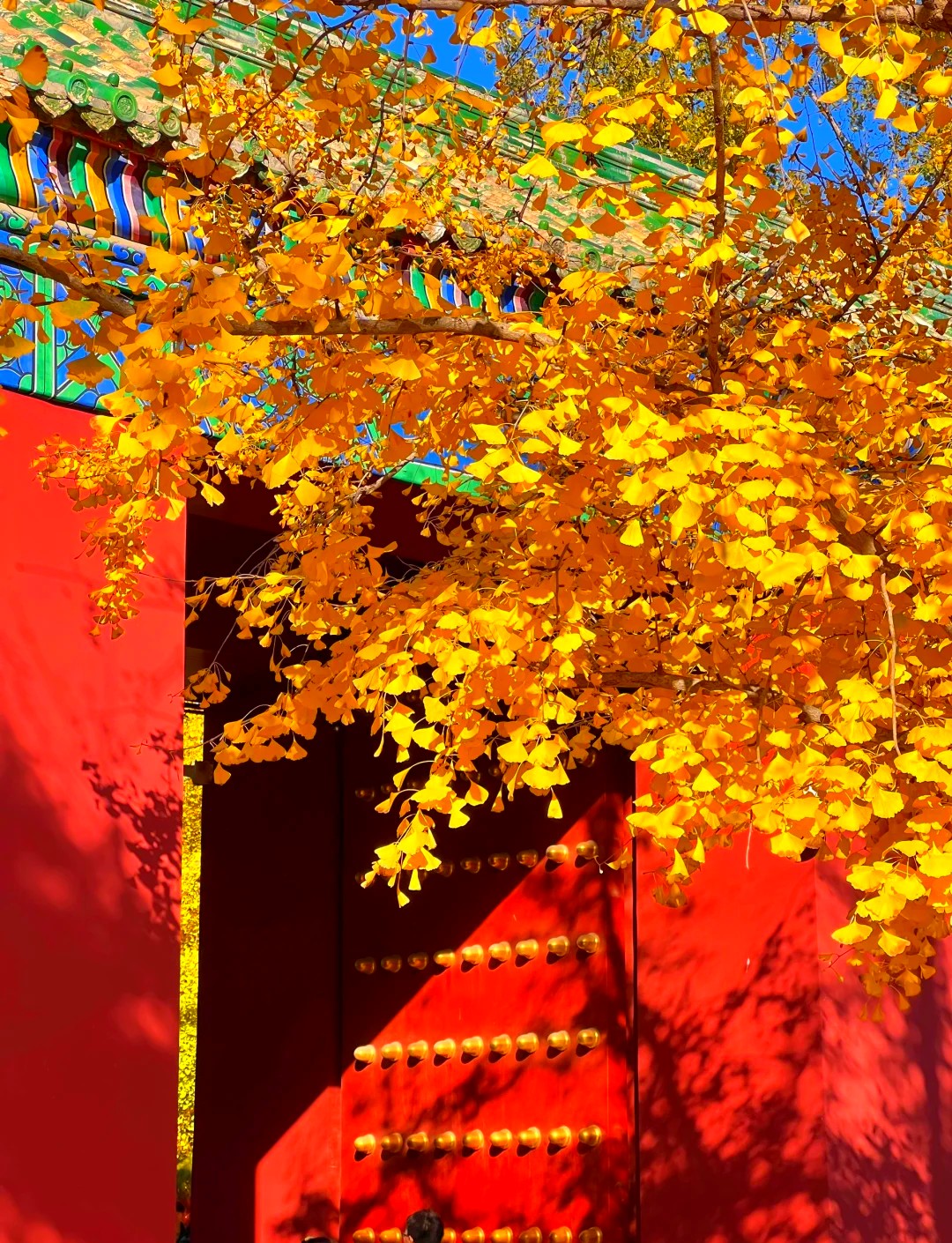 在地坛北门和西门,都栽植了两排银杏树,树干高大笔直,直插蓝天。满树金黄色的叶片在阳光的照射下,熠熠生辉,金光灿烂,与红墙黛瓦交相辉映,编织出一场流动的盛宴,打造了满城尽带黄金甲的壮观景象,前来欣赏银杏叶的游客络绎不绝。地坛公园银杏节以金黄的银杏叶装点大地,宛如京城秋日的金色画卷。
