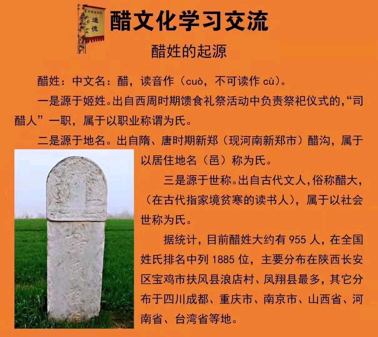 2.地名渊源:出自隋唐时期河南新郑的“醋沟”(今河南省新郑市东郊)。当地因酿造业闻名,部分居民以居邑名称为氏,称醋姓。