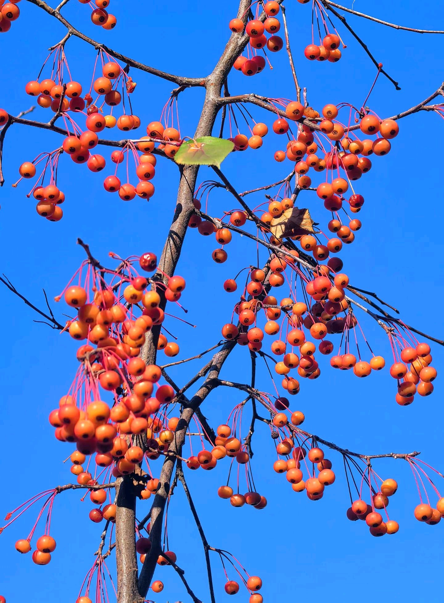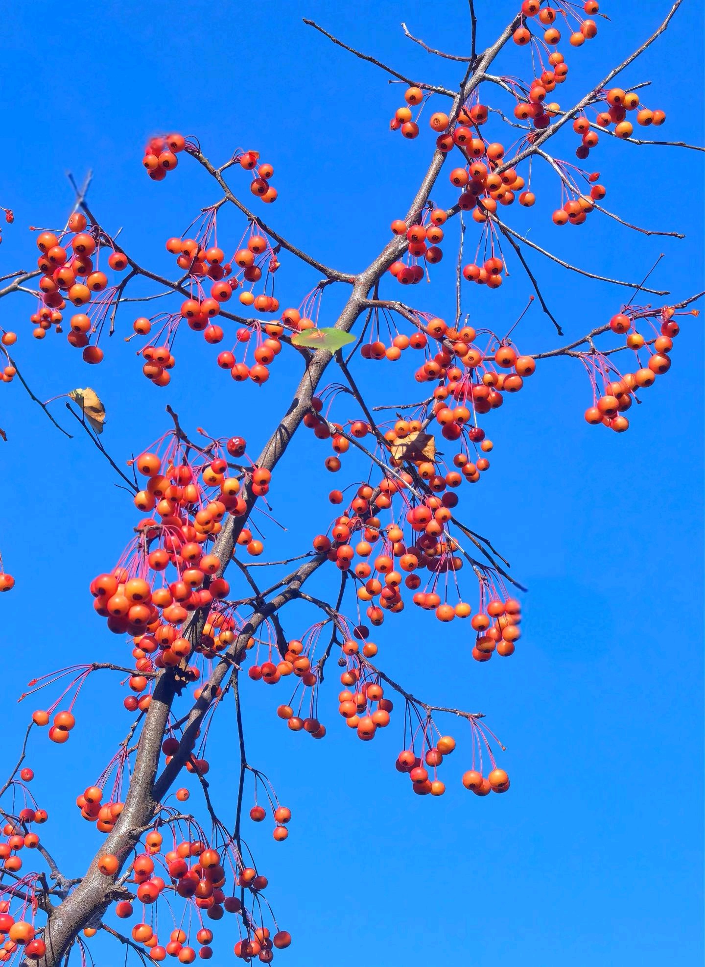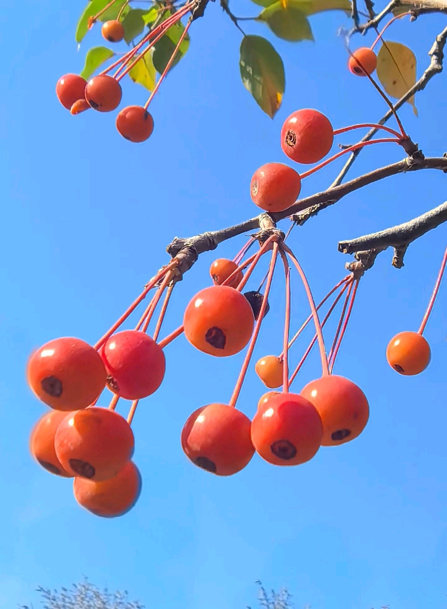 海棠树的叶子已凋谢,那红彤彤的果实依旧在树枝上摇曳,好像红色的玛瑙放出异色的光,美极了!