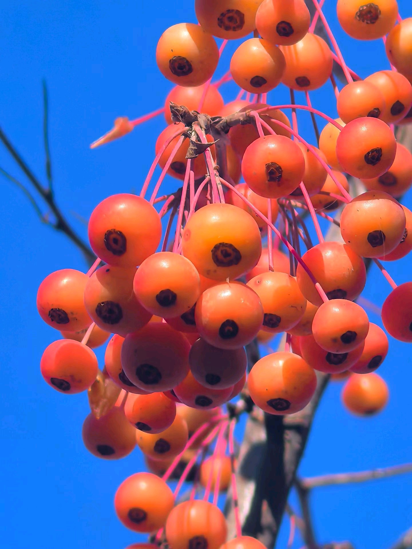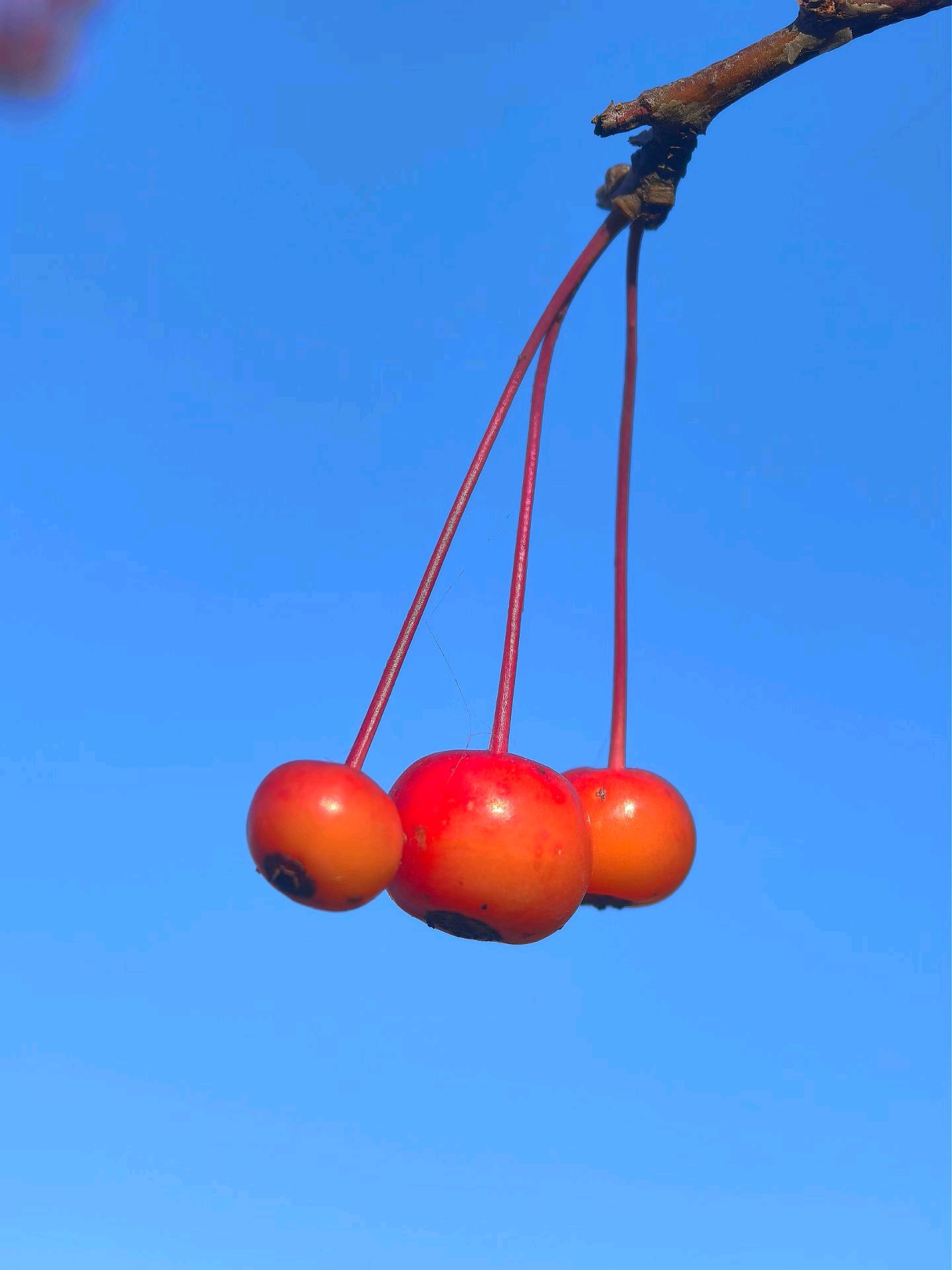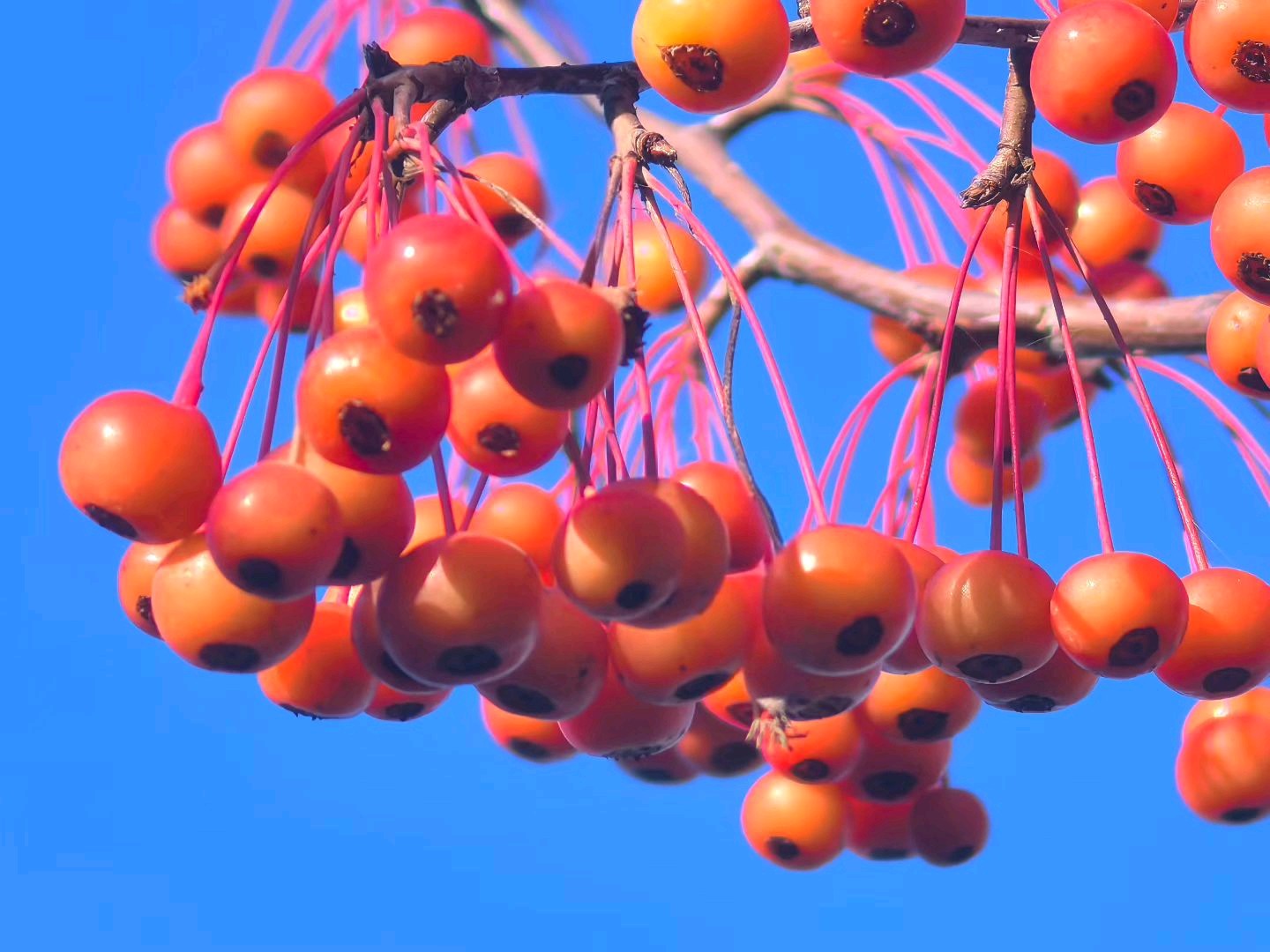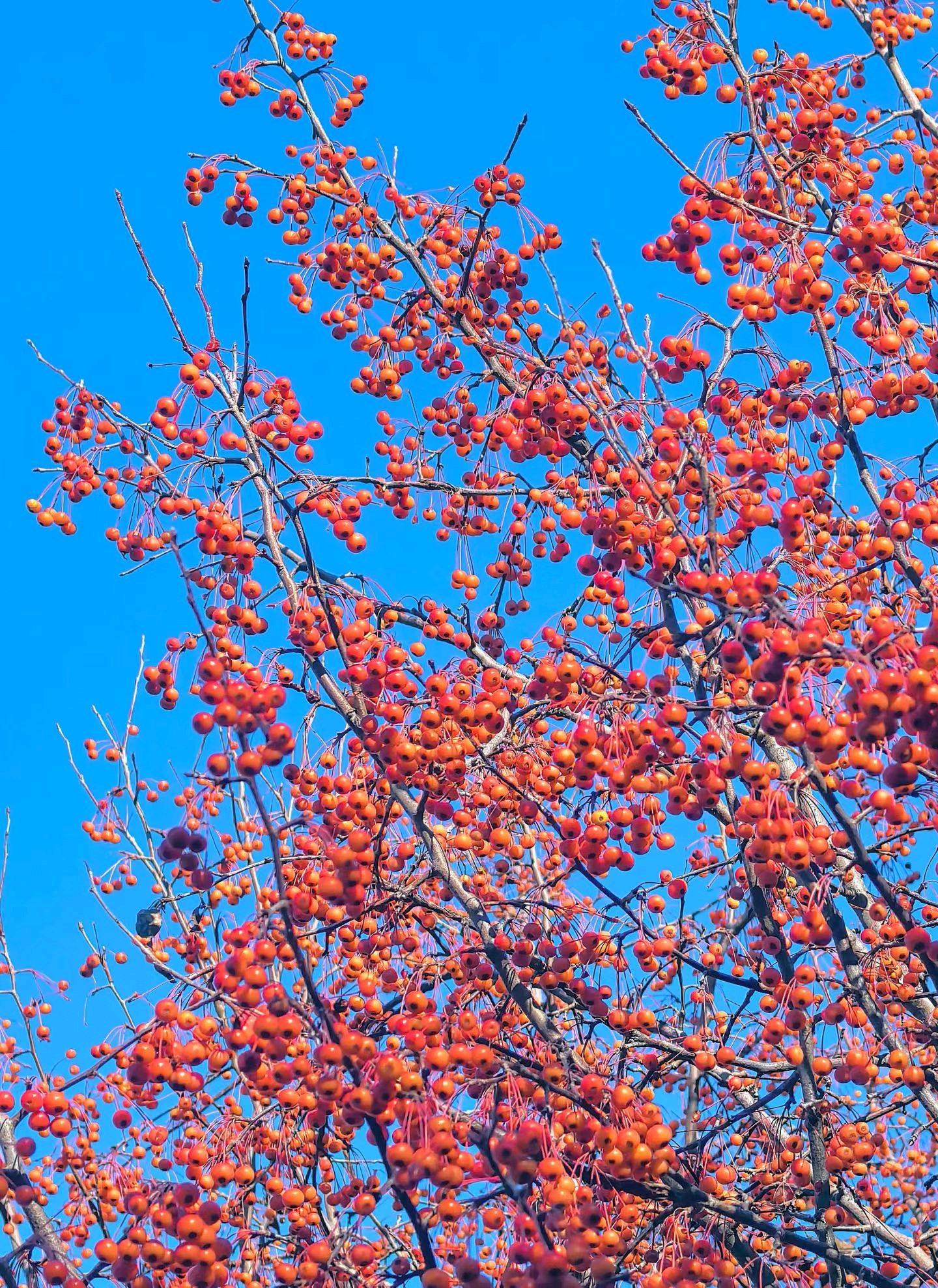 海棠树的叶子已凋谢,那红彤彤的果实依旧在树枝上摇曳,好像红色的玛瑙放出异色的光,美极了!