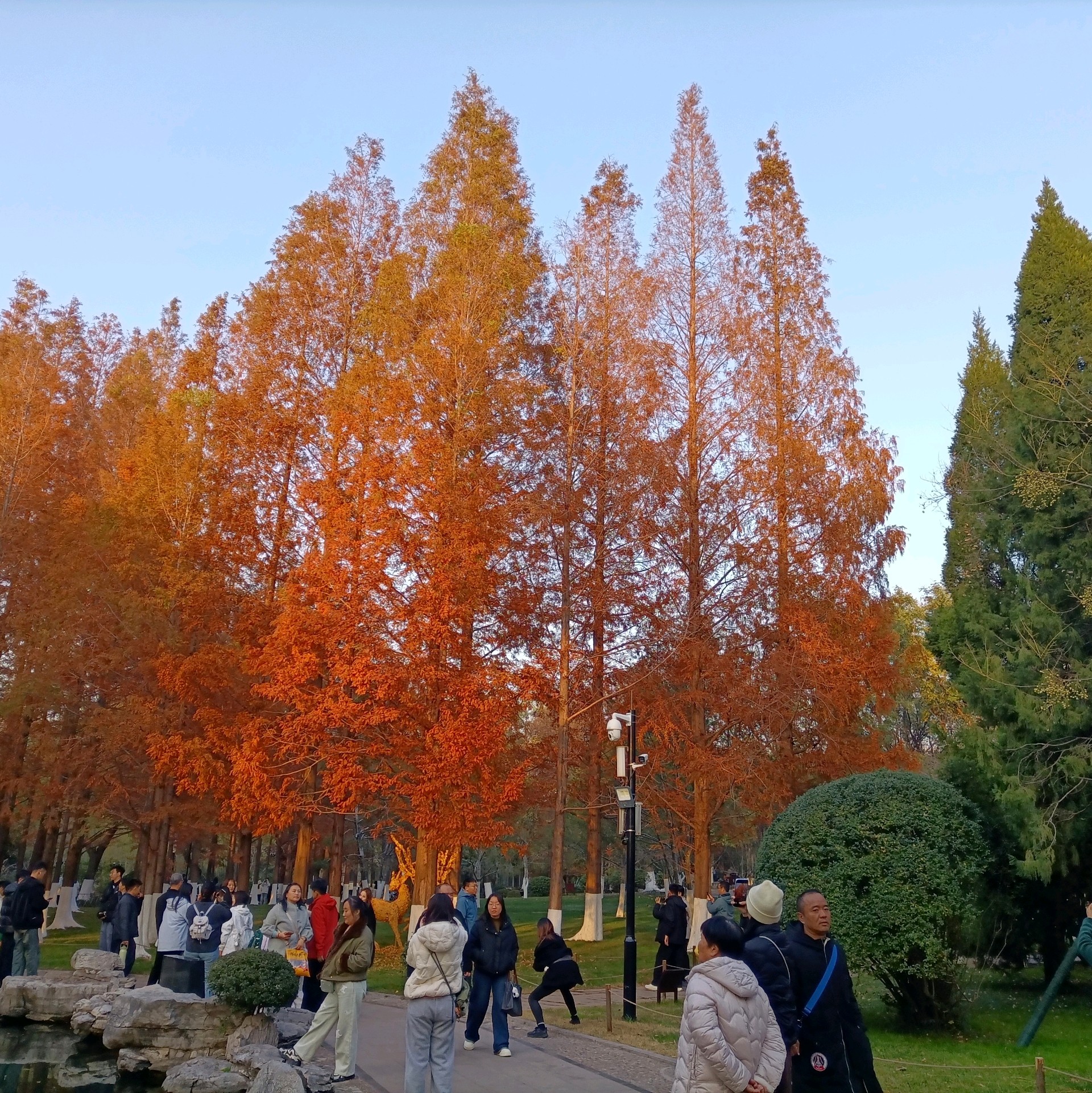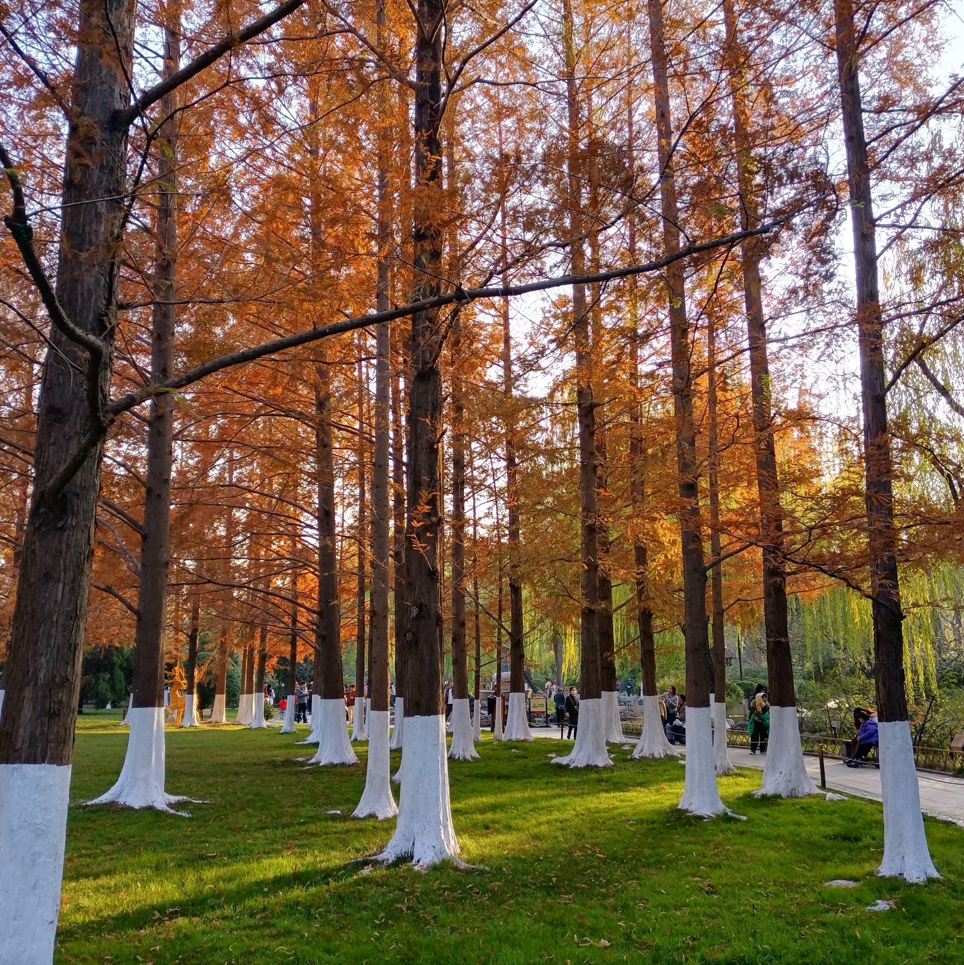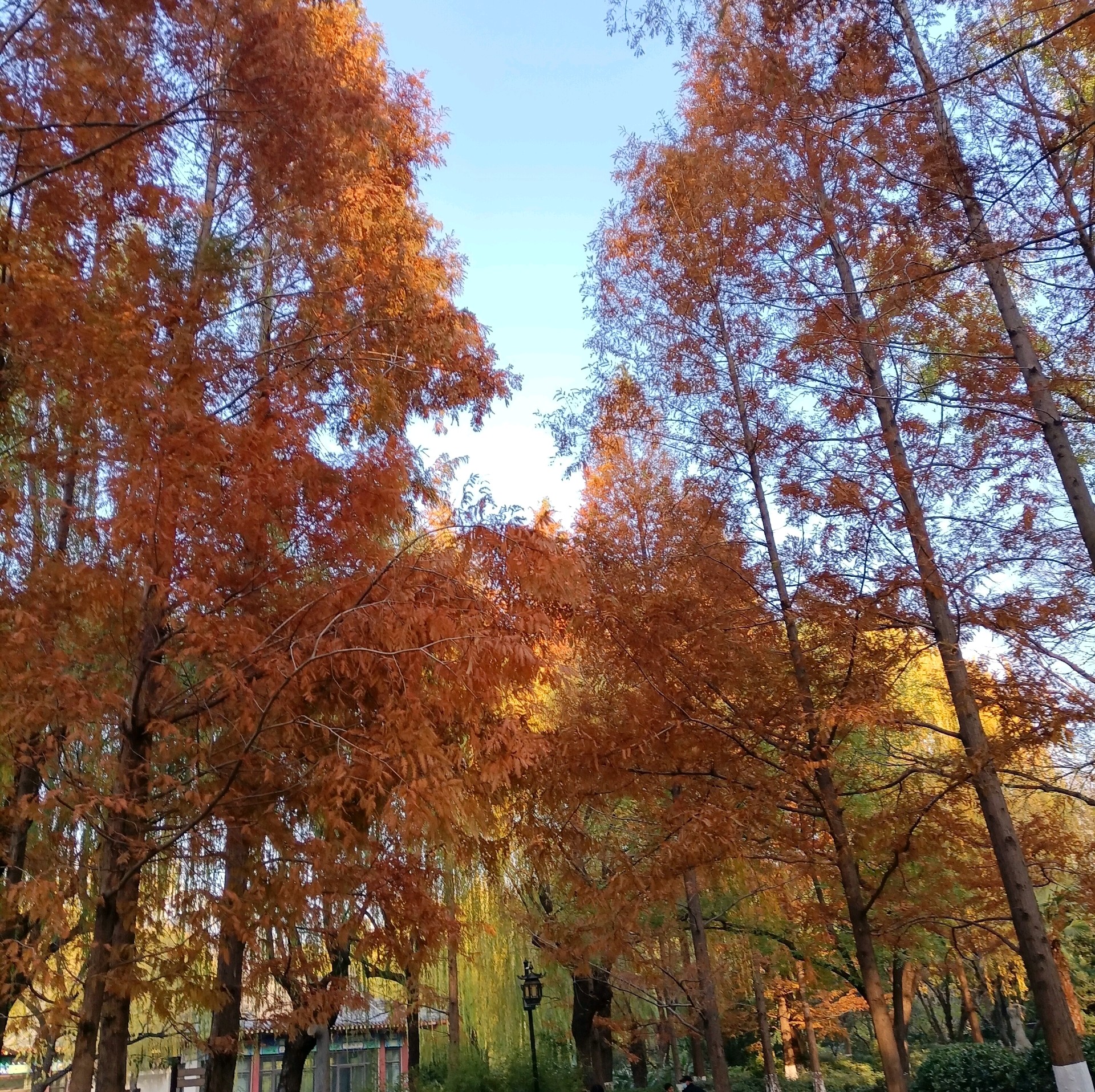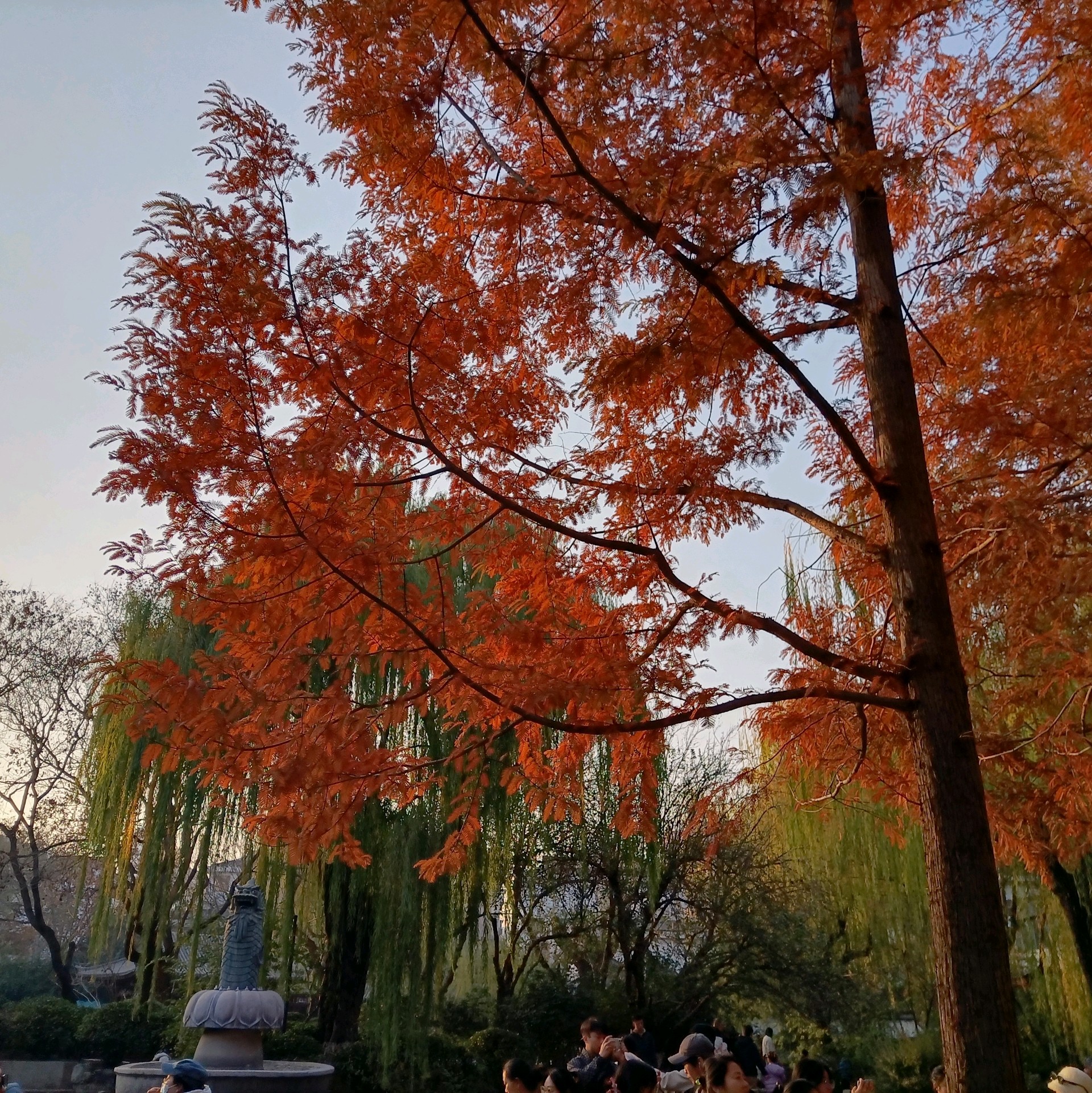 初冬的五龙潭公园,褐红色的水杉树像一簇簇燃烧的火把,笔直地刺向湛蓝的天空,暖暖的阳光透过层层叠叠的针叶,在浓绿的草坪上洒下细细碎碎的斑驳光影,清冽的泉水被湖畔垂下的万千丝绦搅动出一圈圈涟漪。