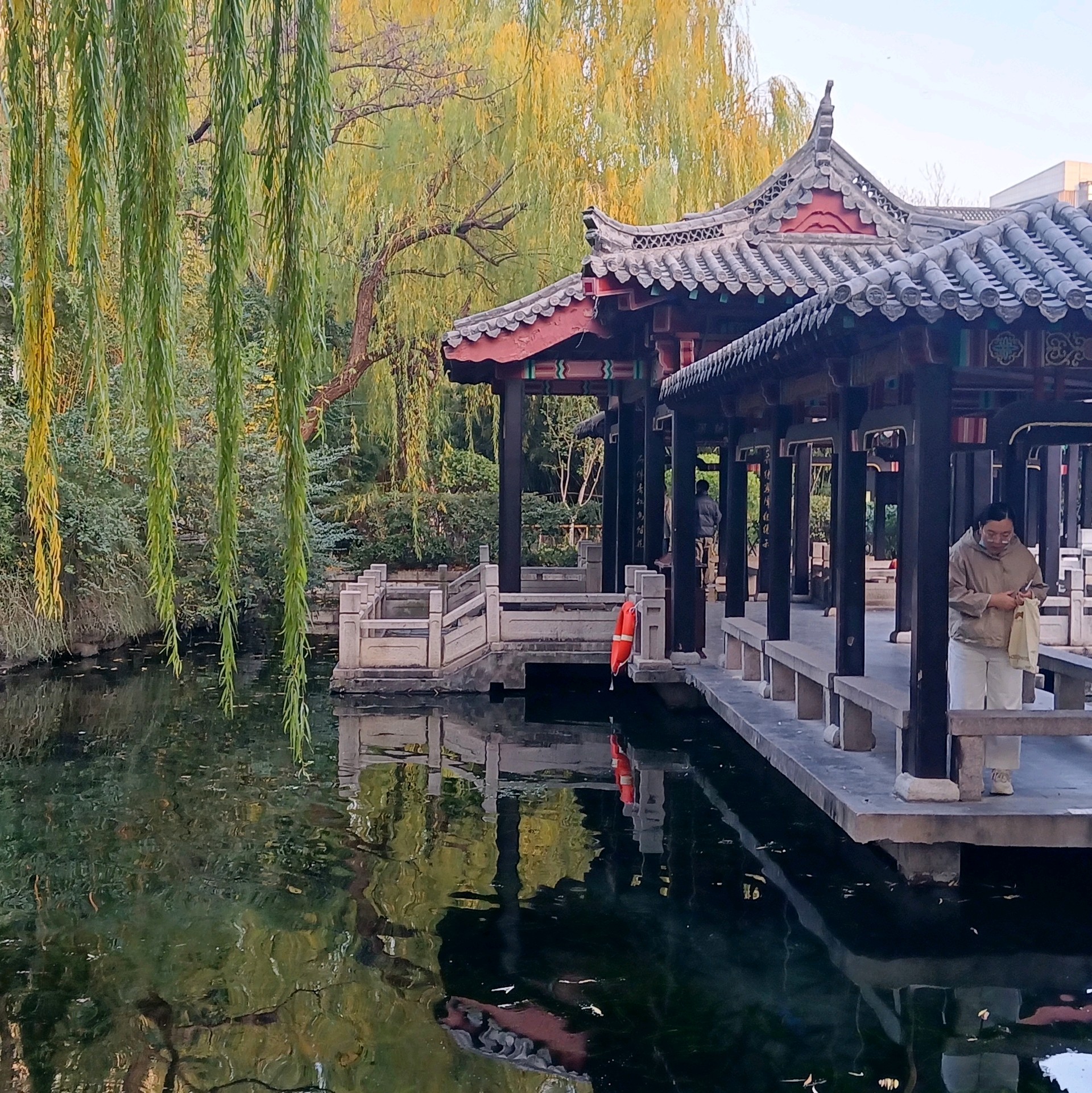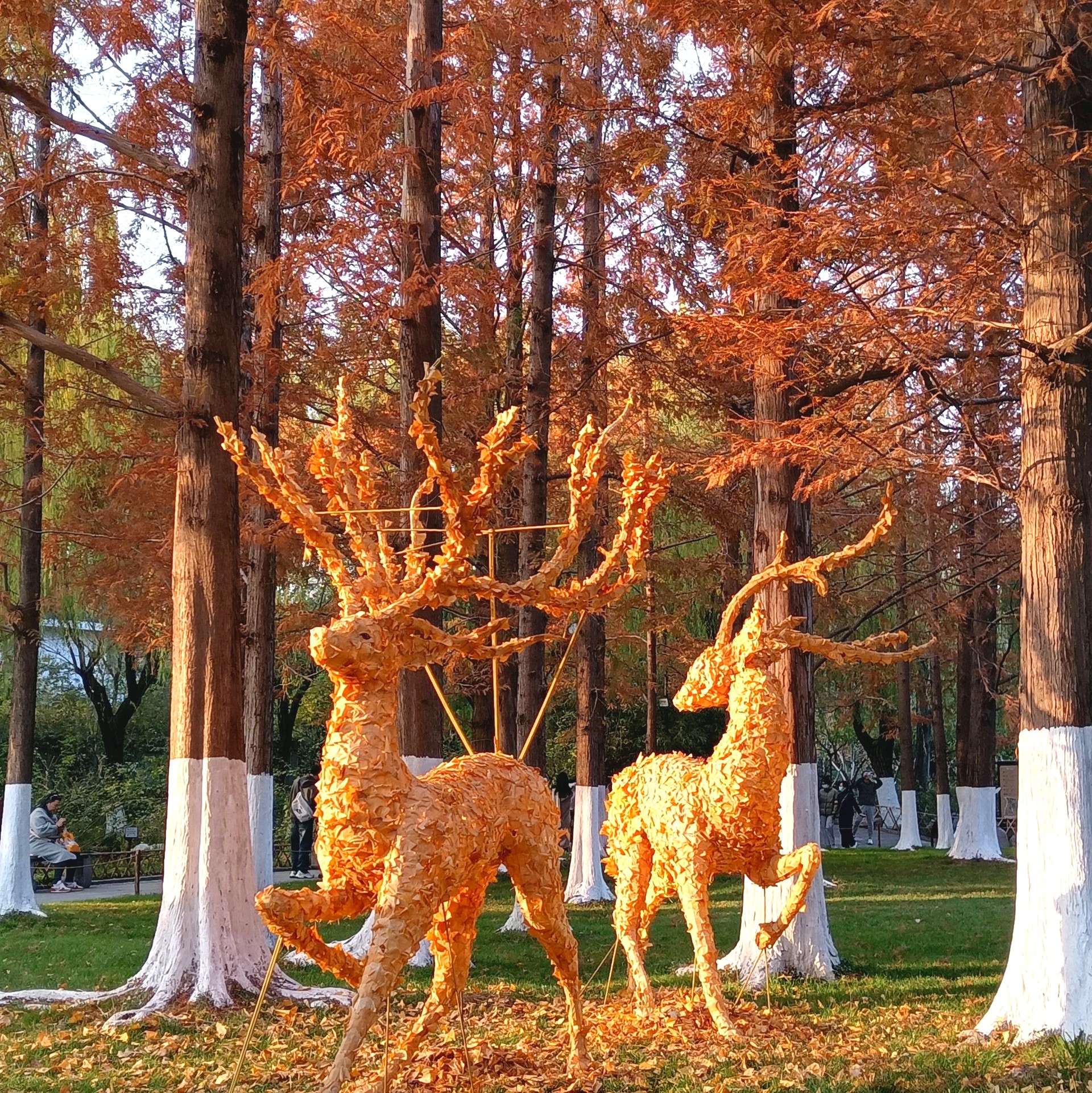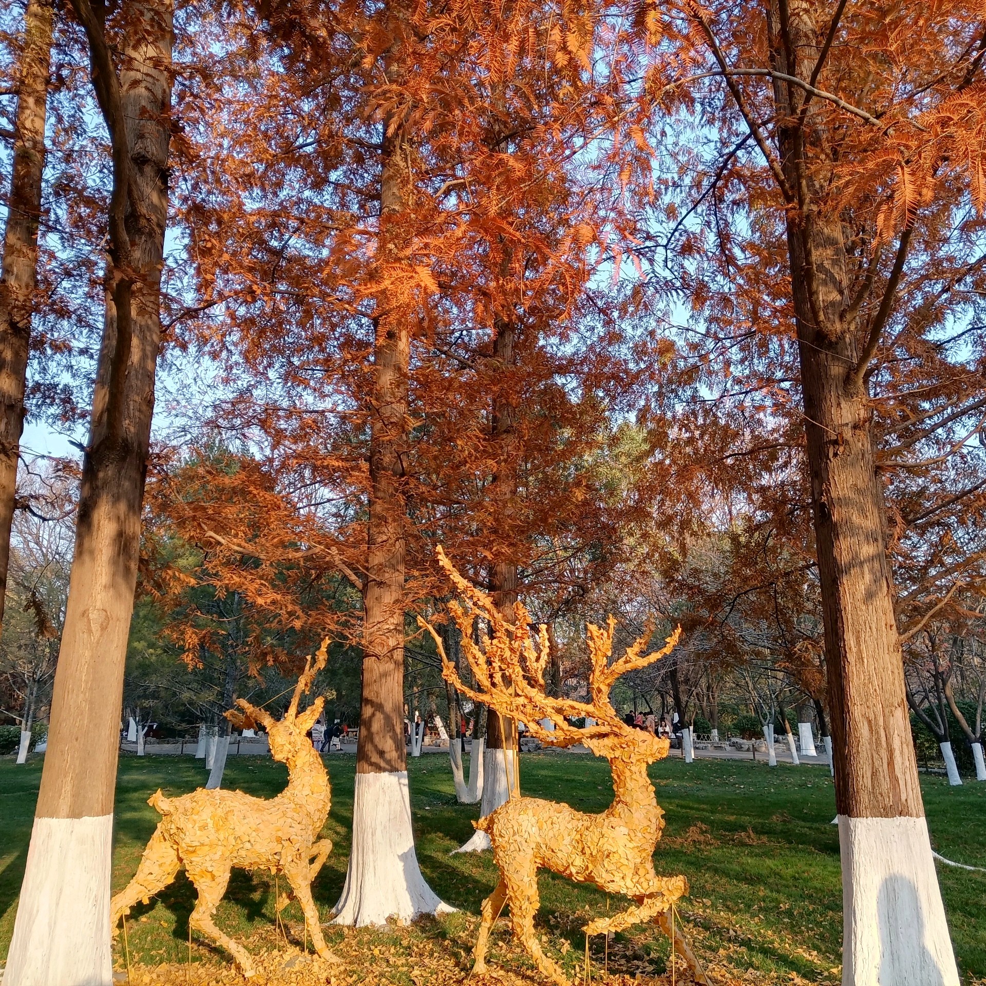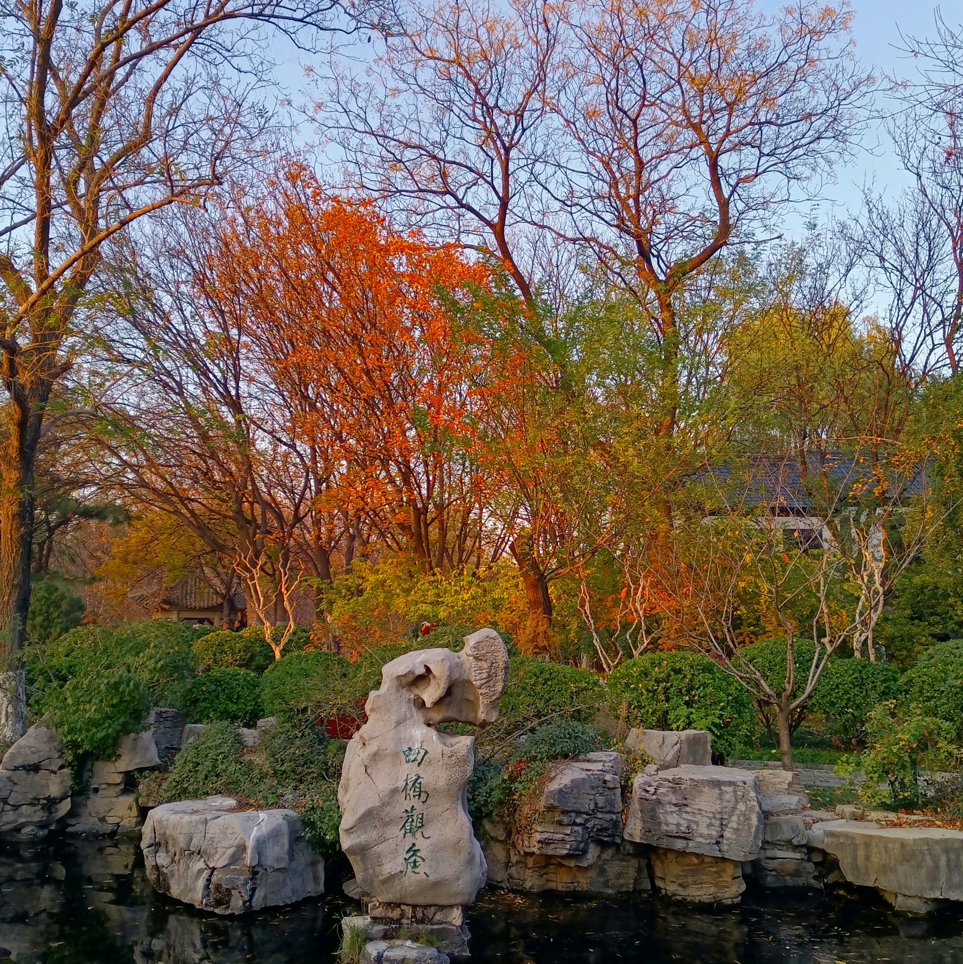 初冬的五龙潭公园,褐红色的水杉树像一簇簇燃烧的火把,笔直地刺向湛蓝的天空,暖暖的阳光透过层层叠叠的针叶,在浓绿的草坪上洒下细细碎碎的斑驳光影,清冽的泉水被湖畔垂下的万千丝绦搅动出一圈圈涟漪。