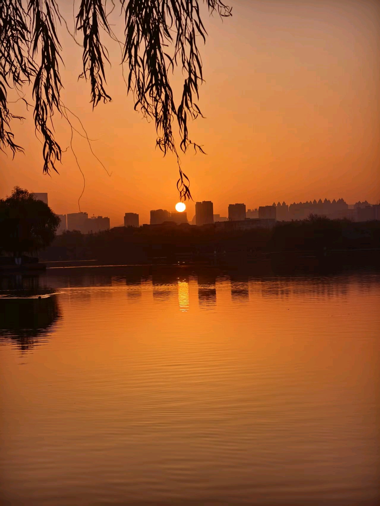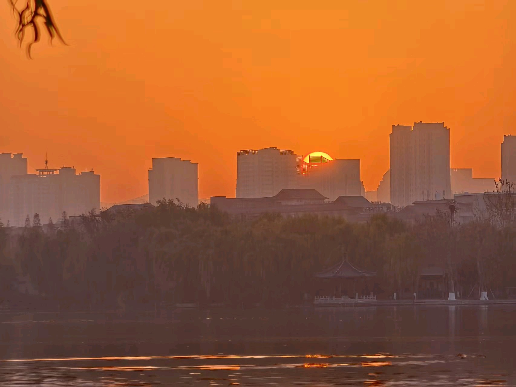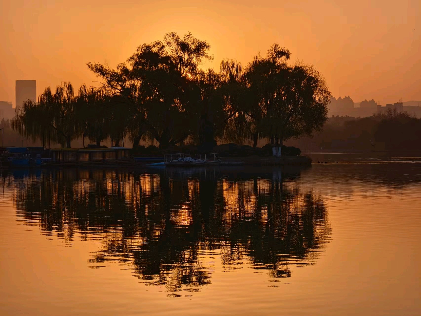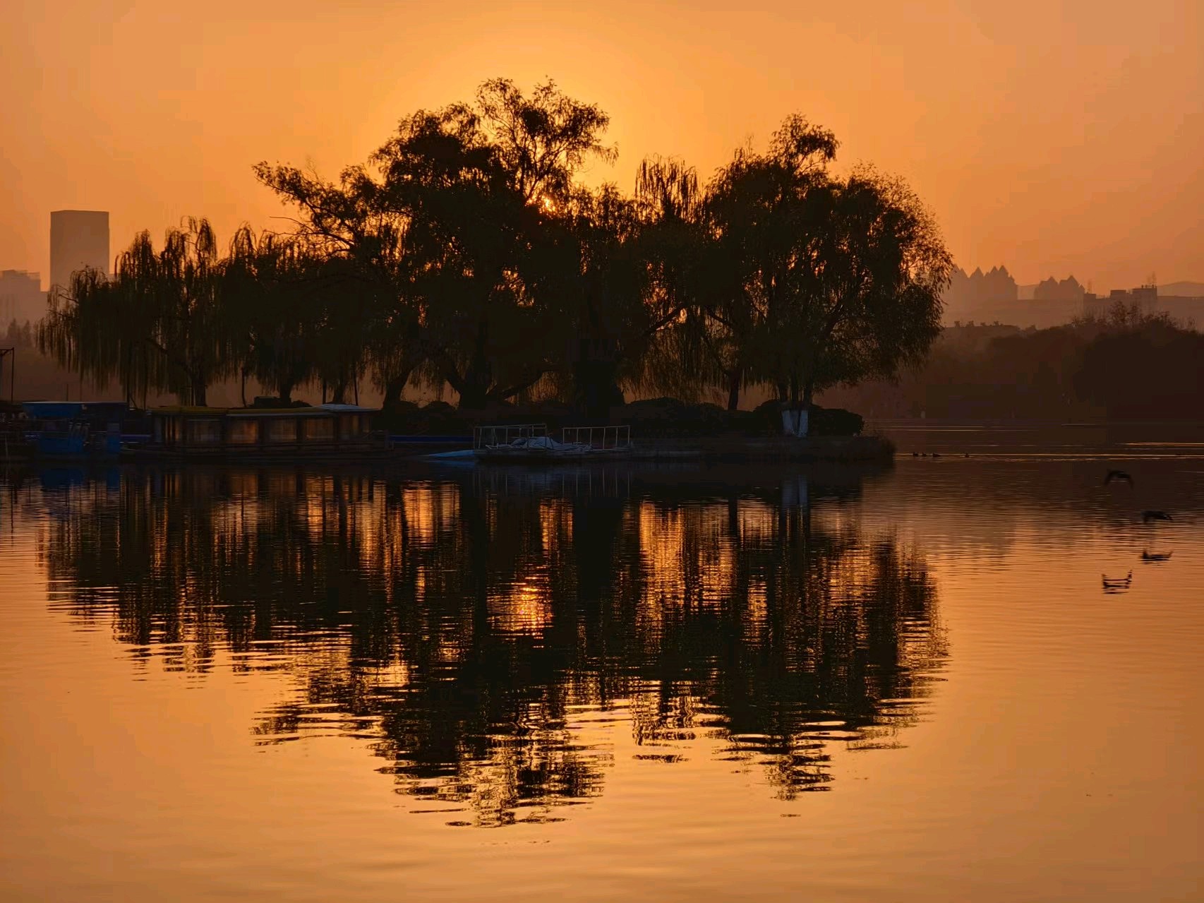 明湖晨光,日出东方金光灿灿洒在湖面波光粼粼,湖畔的树木与城市剪影交相辉映,宁静而美丽。让人流连忘返🌅🌳🎉