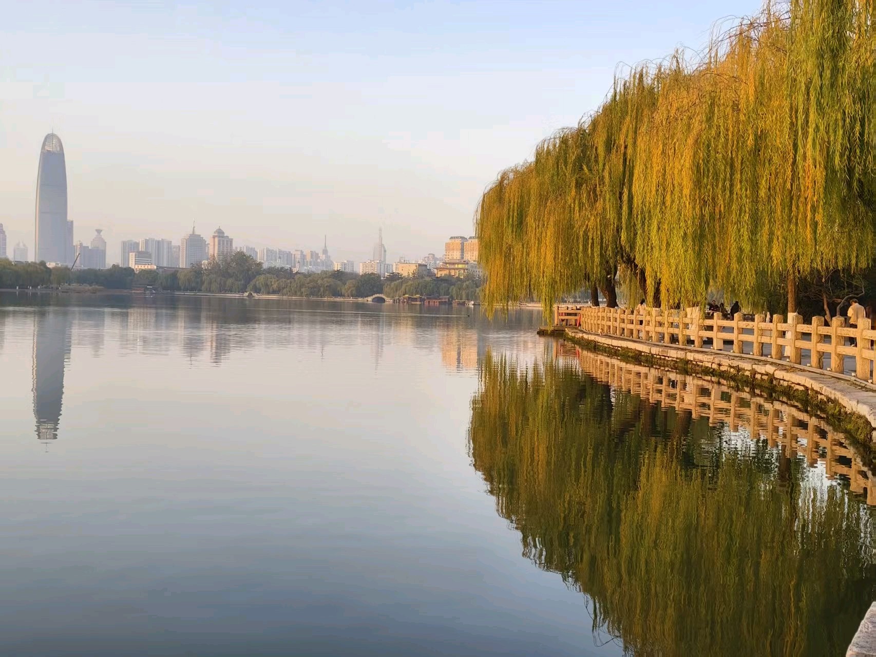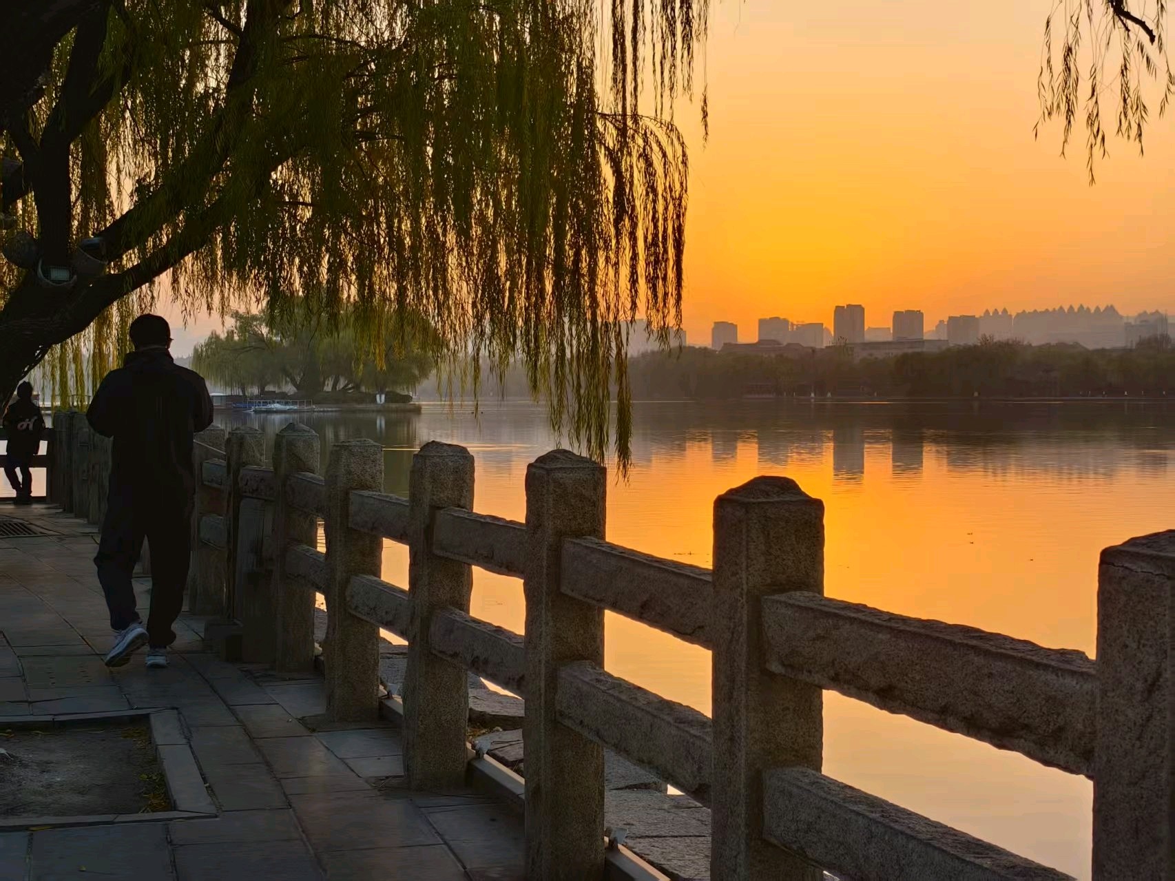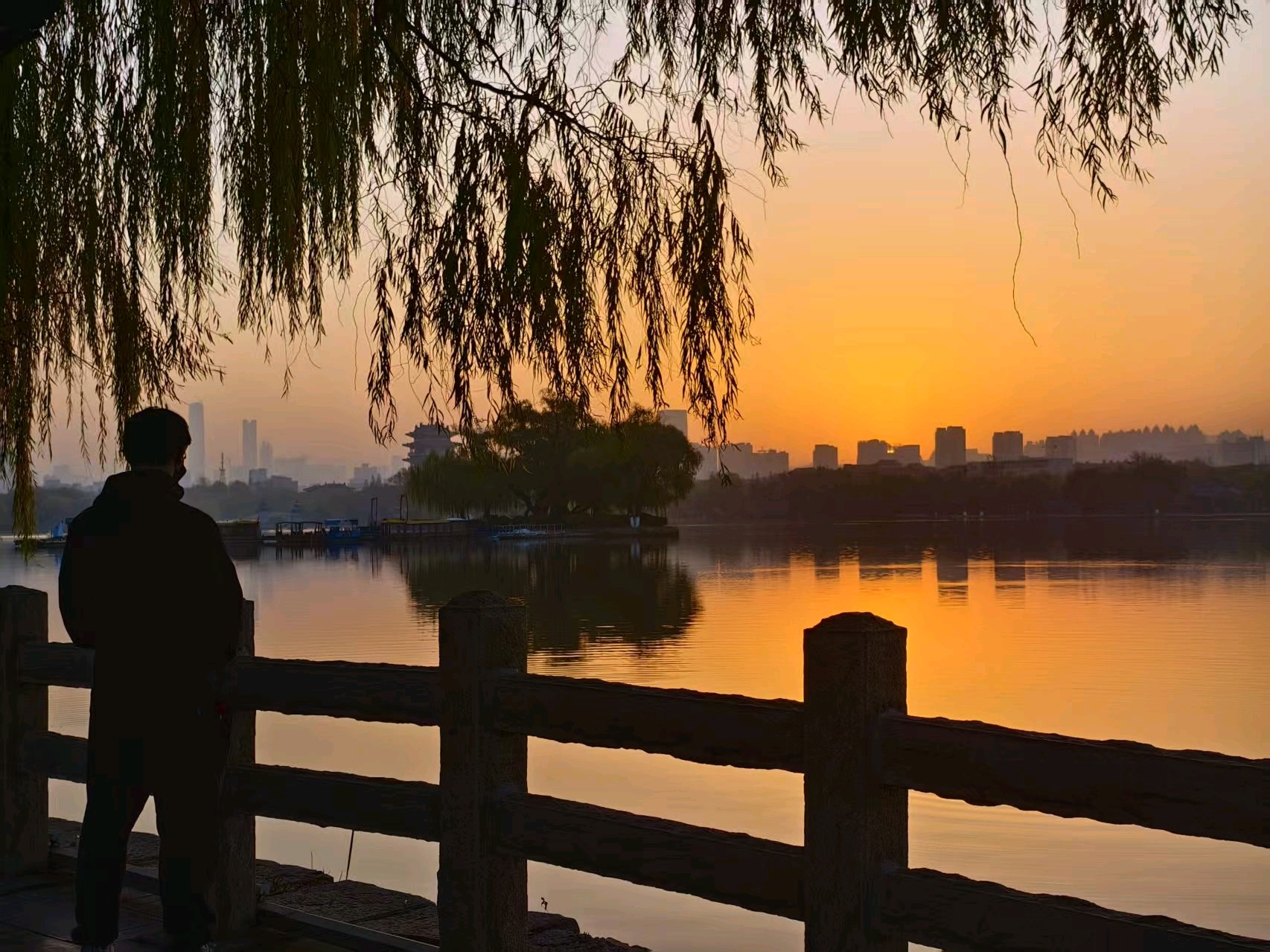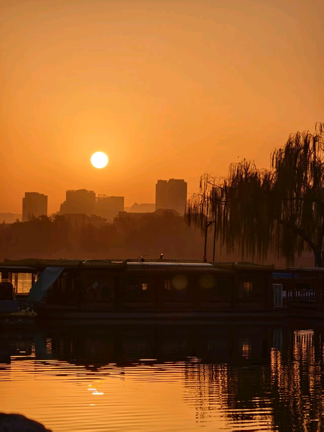 明湖晨光,日出东方金光灿灿洒在湖面波光粼粼,湖畔的树木与城市剪影交相辉映,宁静而美丽。让人流连忘返🌅🌳🎉