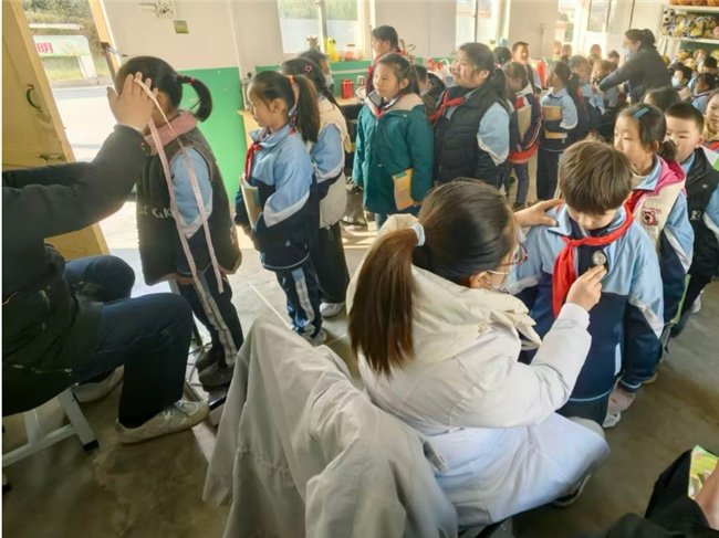 在检测过程中,孩子们在老师的引导下安静排队,积极配合检查。老师们精心组织,耐心指导,确保每个环节安全有序:身高体重测量处,工作人员细致调整标尺;口腔检查区,医生耐心检查每位孩子的牙齿发育状况;听诊区的医生则轻按听诊器,耐心记录各项心肺功能;校医们全程待命,细心观察每个孩子的身体状况。