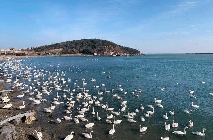 近万只大天鹅也从西伯利亚等地飞抵荣成越冬做客,在烟墩角村、天鹅在这个区域聚集,形成壮观的“东方天鹅王国”景象。天鹅数量在12月至次年2月达到高峰,是观赏和拍摄天鹅嬉戏、觅食的黄金时段。